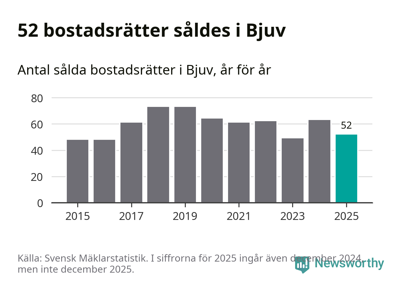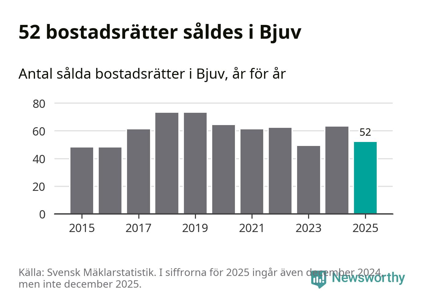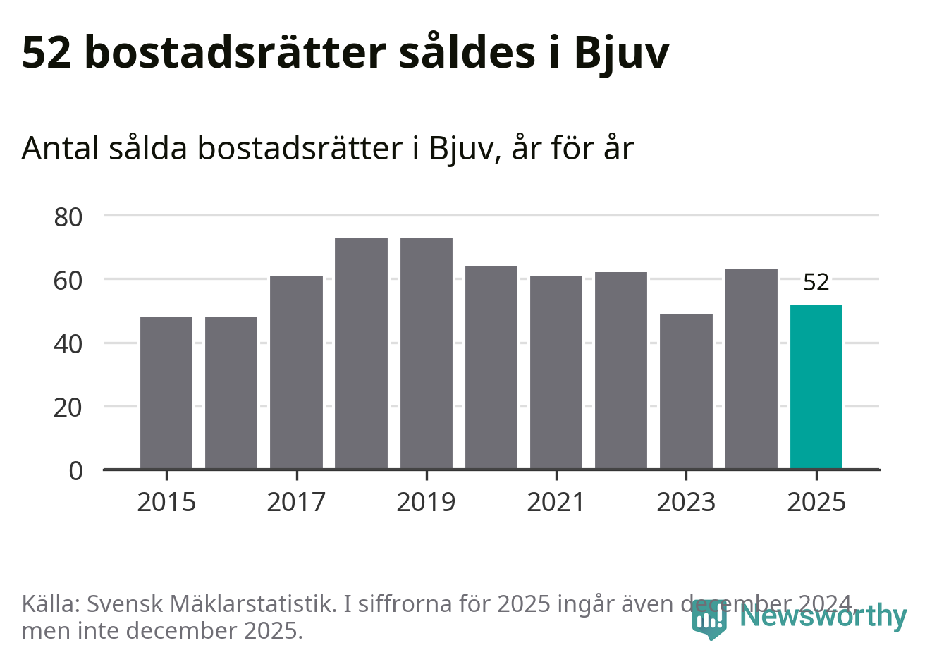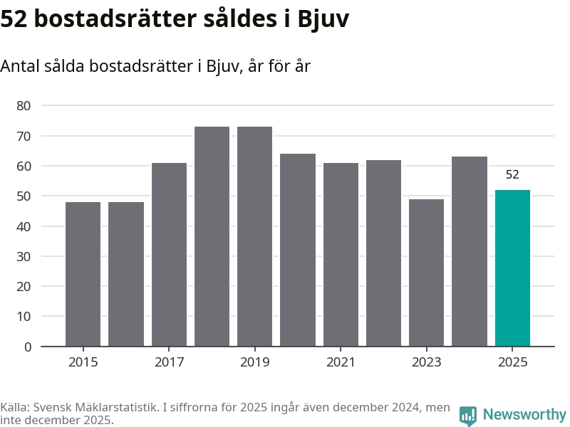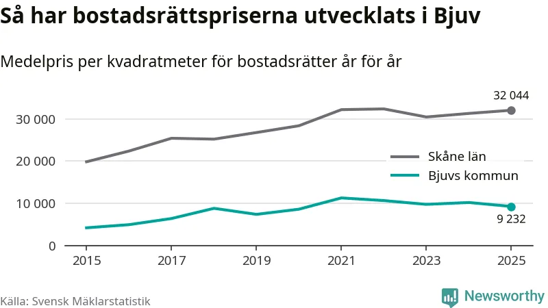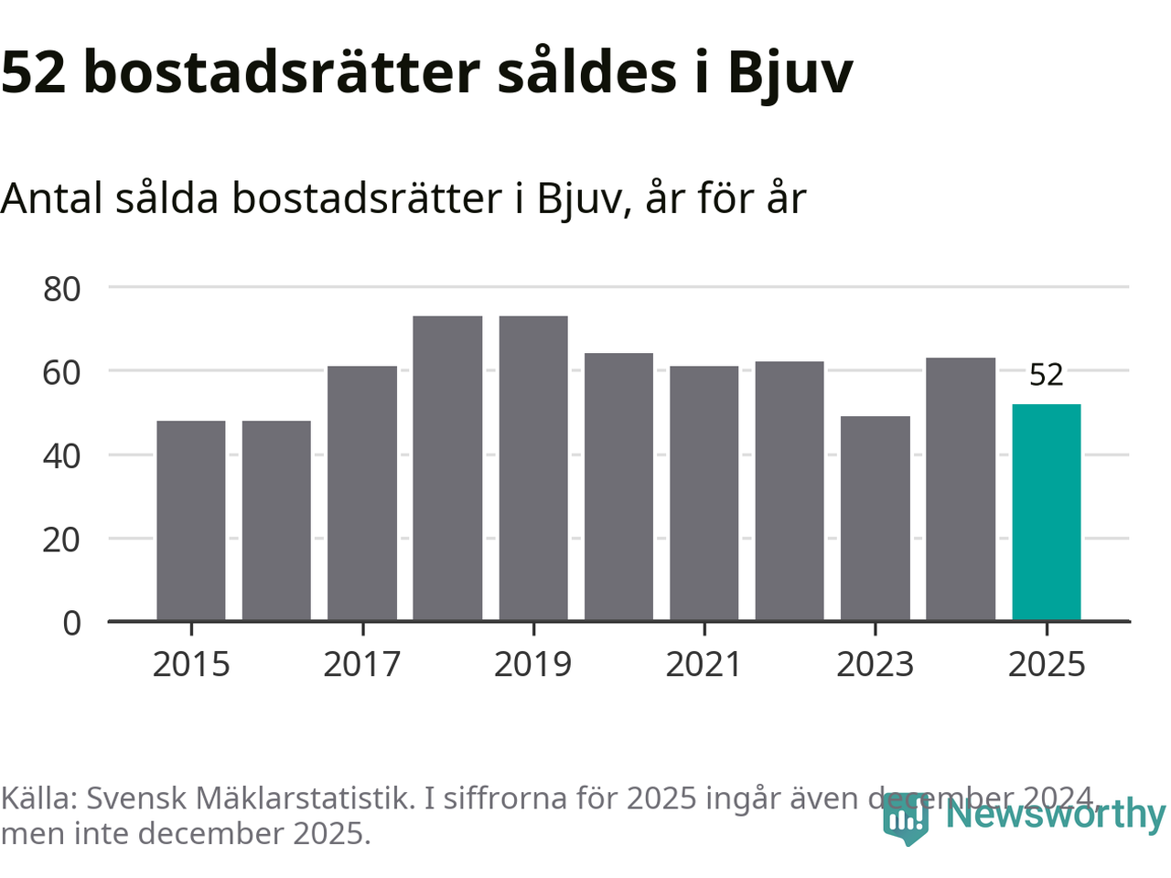 Det såldes totalt 52 bostadsrätter i Bjuvs kommun under året. Genomsnittspriset per kvadratmeter landade på 9 232 kronor. Det är en minskning med nio procent i kommunen på ett år.