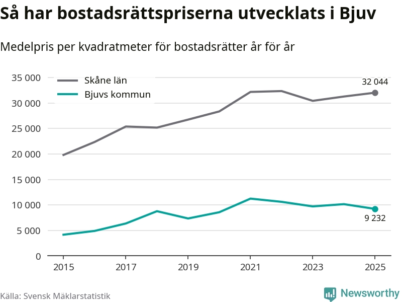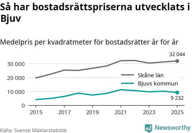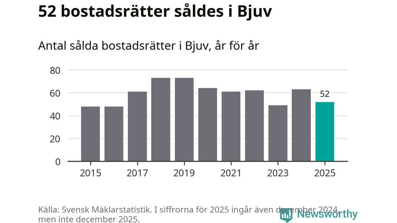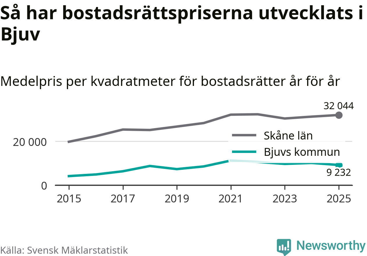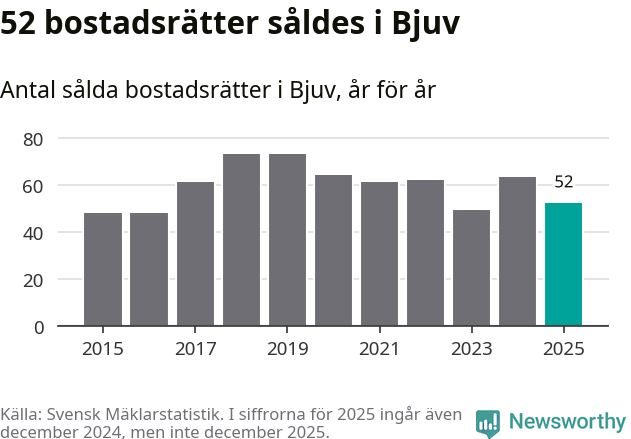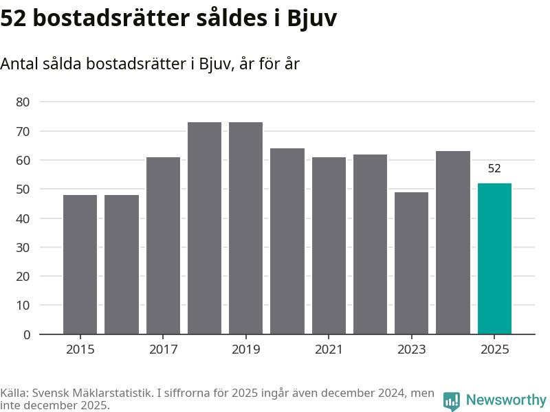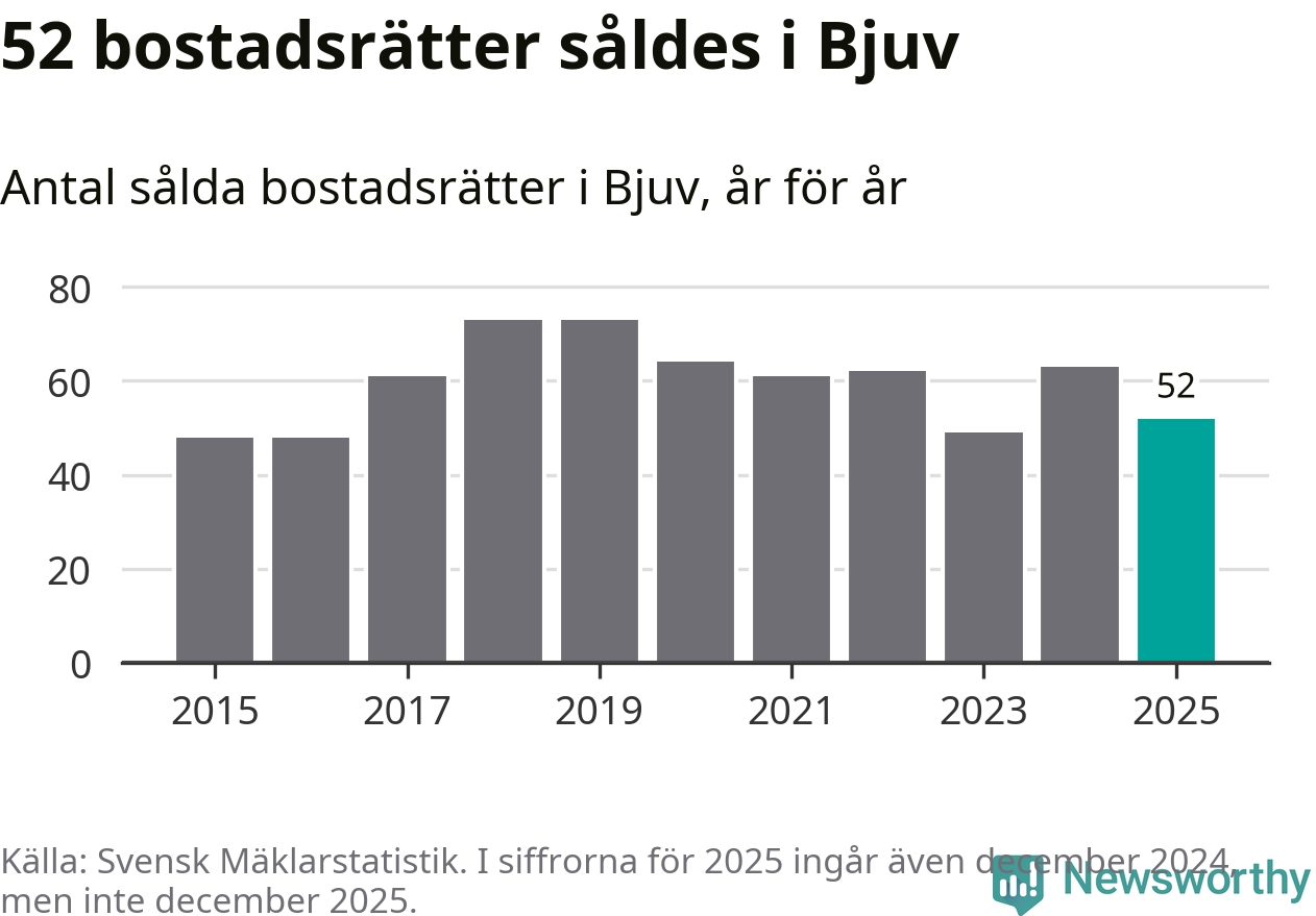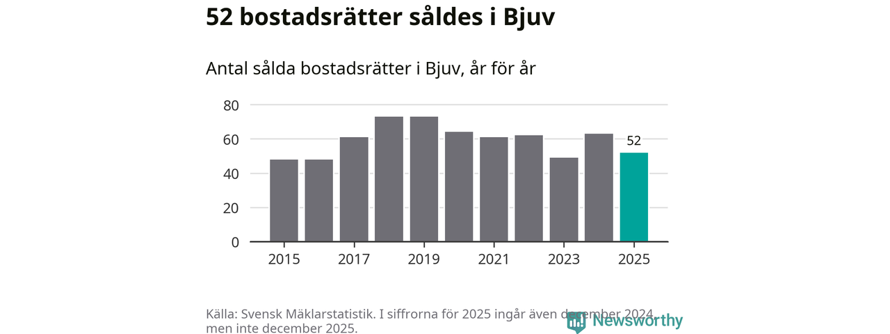 Det såldes totalt 52 bostadsrätter i Bjuvs kommun under året. Genomsnittspriset per kvadratmeter landade på 9 232 kronor. Det är en minskning med nio procent i kommunen på ett år.