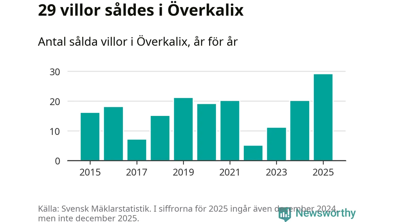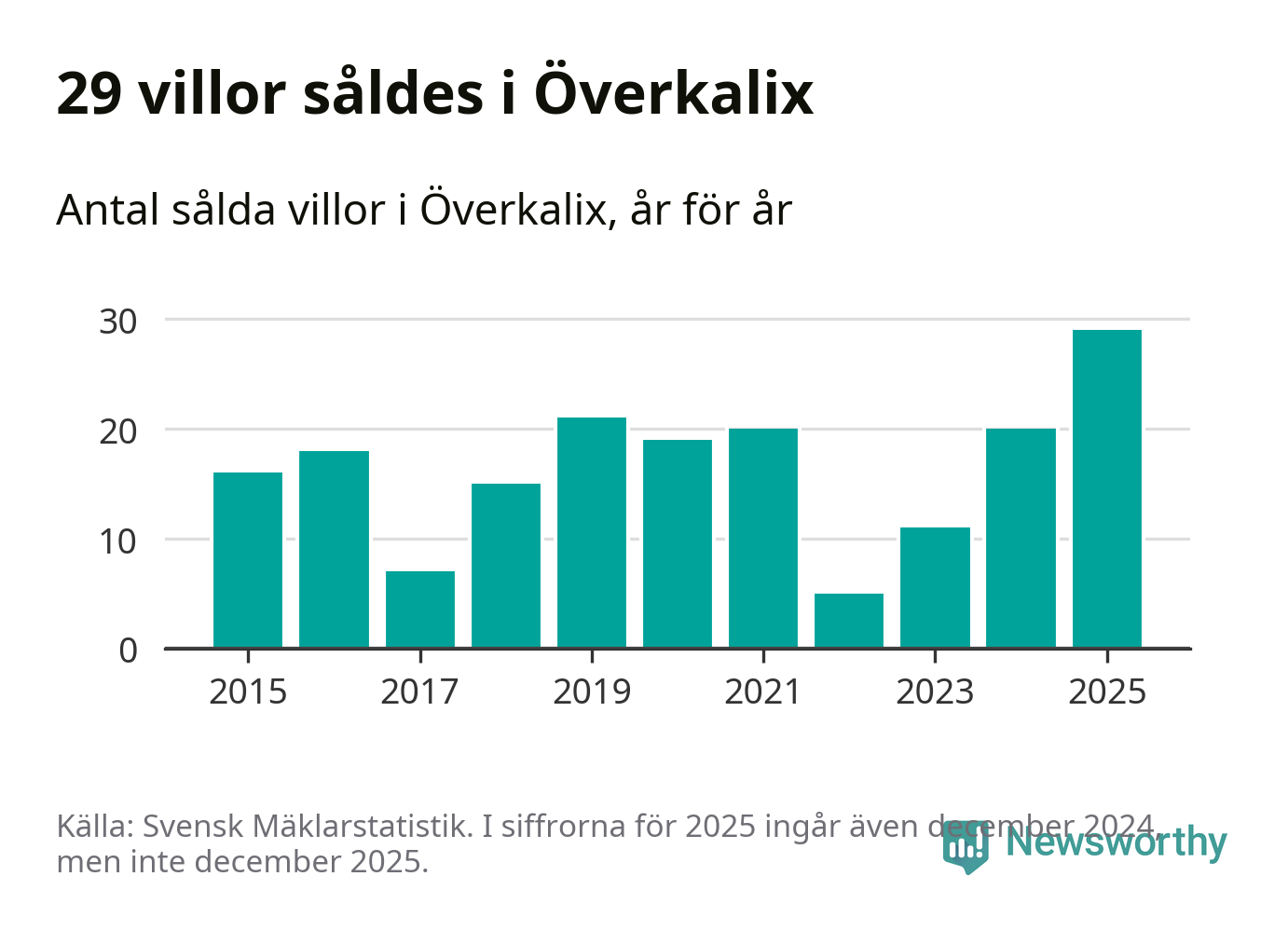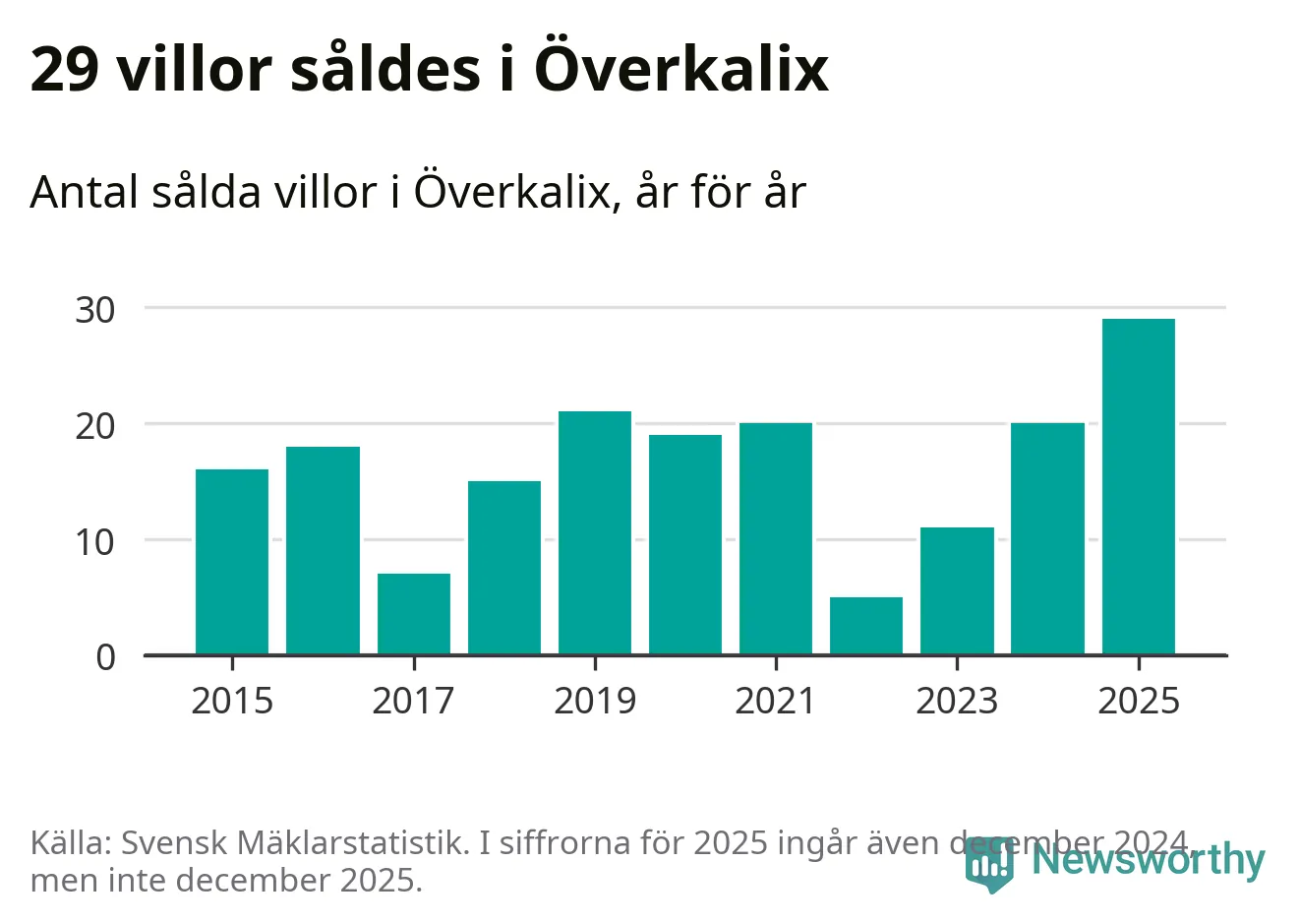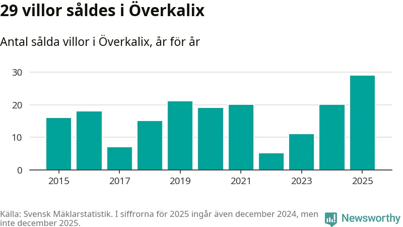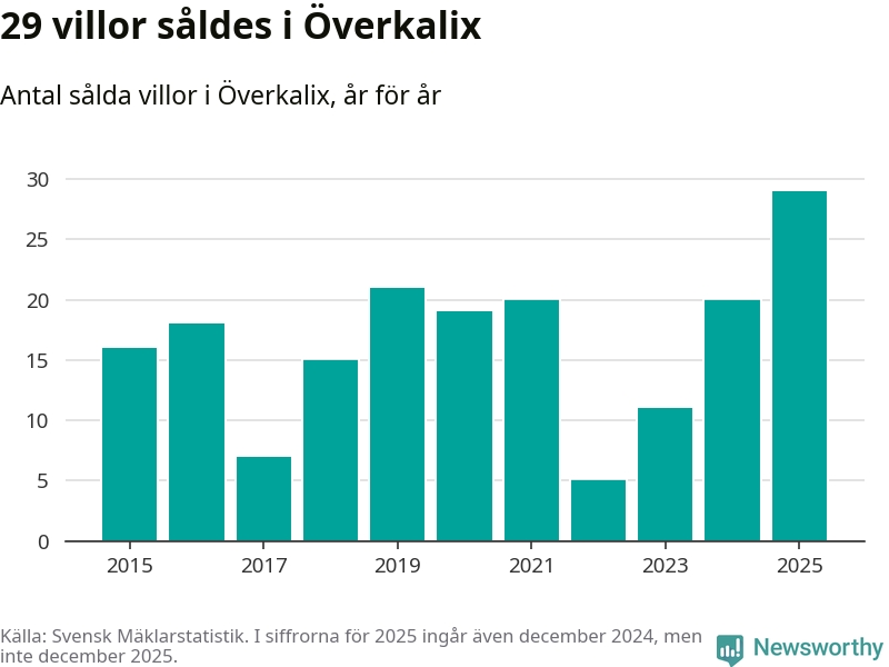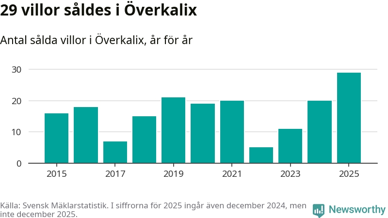 Antalet sålda villor ökade också. Totalt såldes 29 villor, att jämföra med 20 under 2024. Det är fler än något annat år sedan 2015.