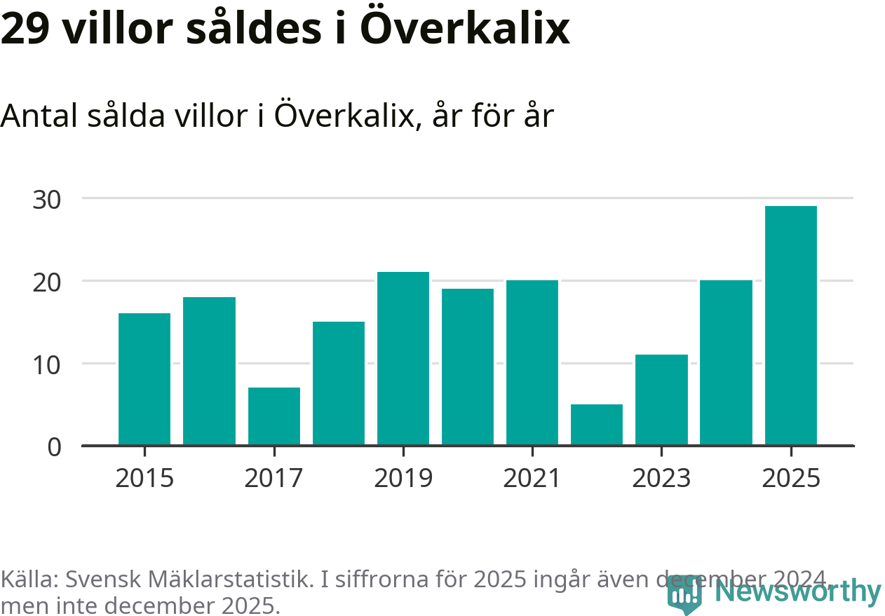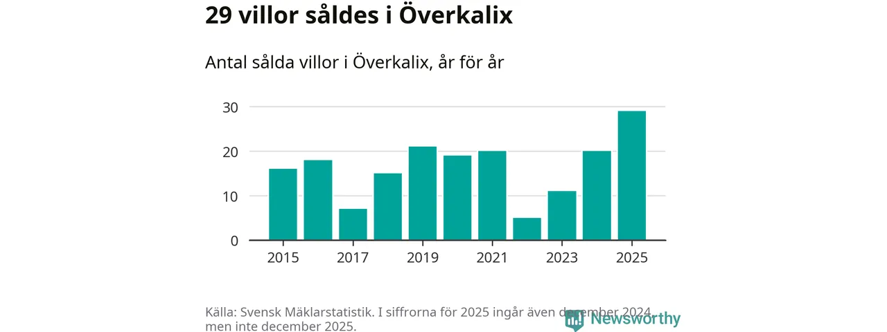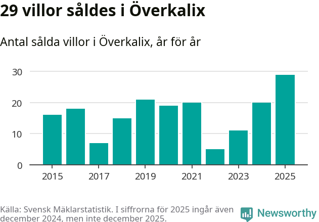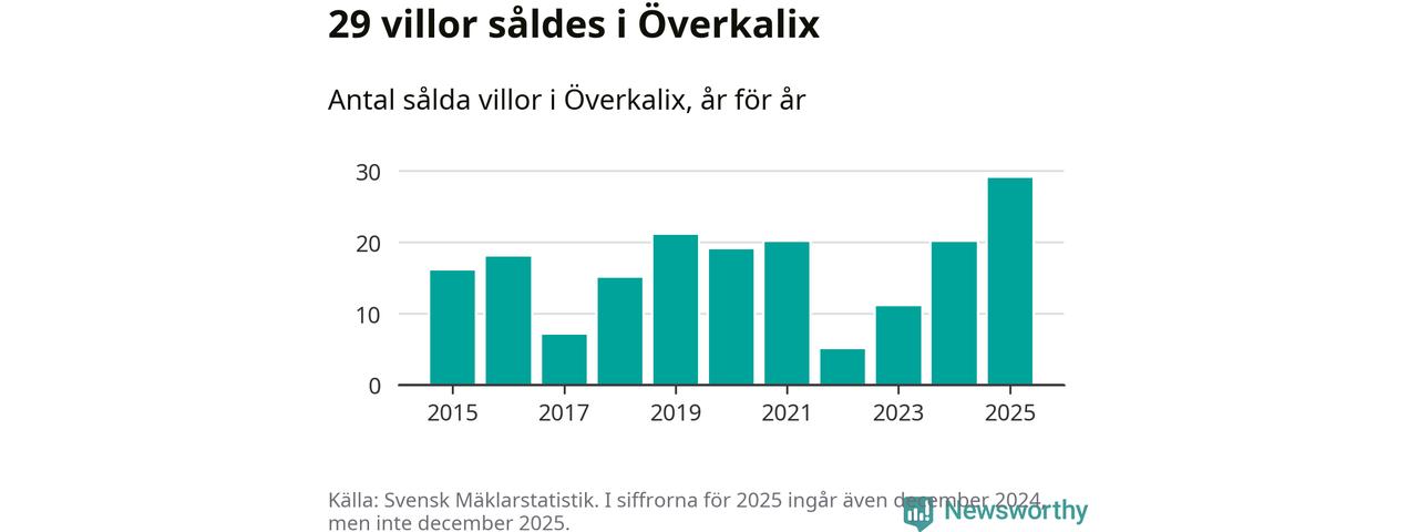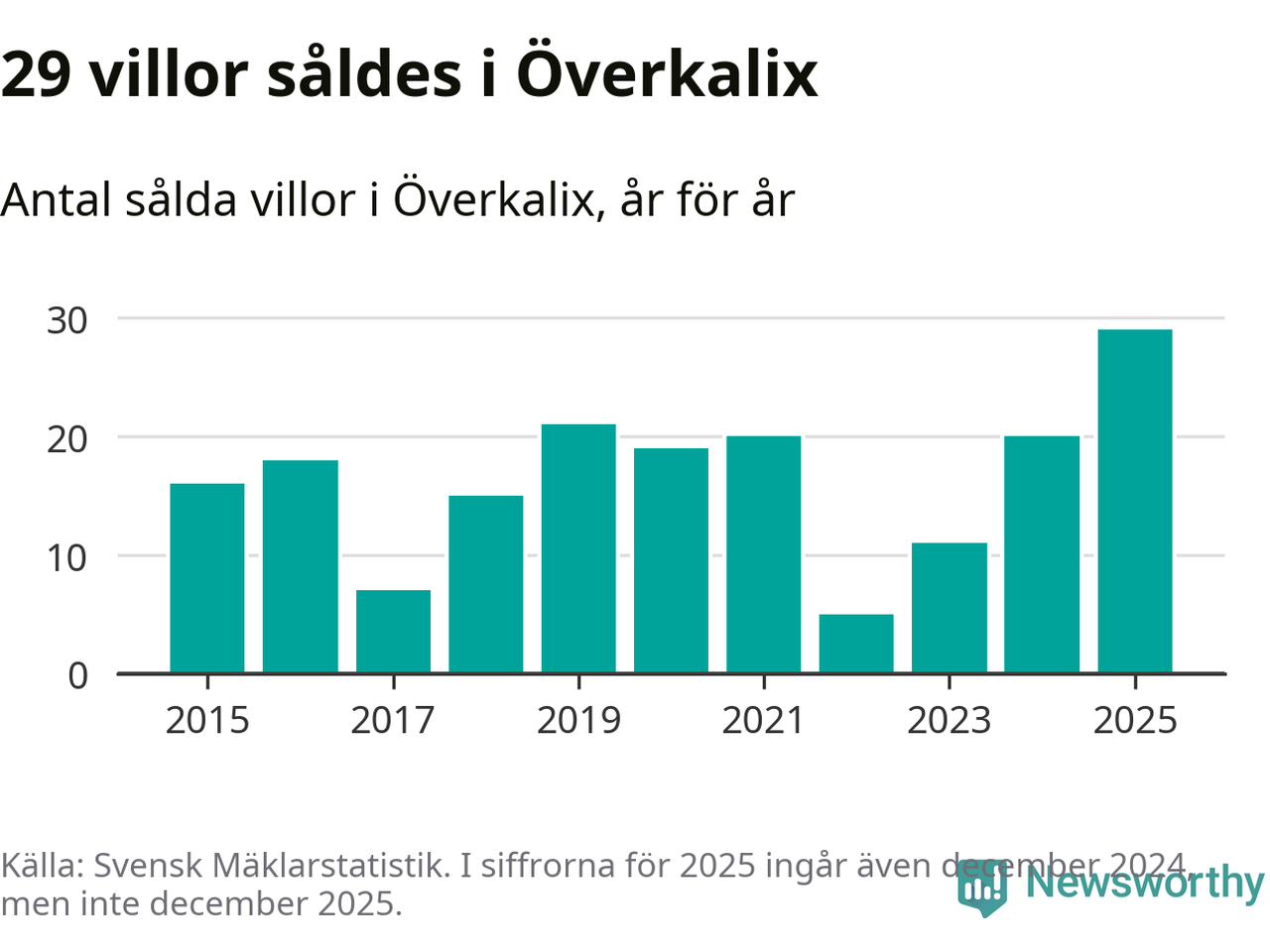 Antalet sålda villor ökade också. Totalt såldes 29 villor, att jämföra med 20 under 2024. Det är fler än något annat år sedan 2015.