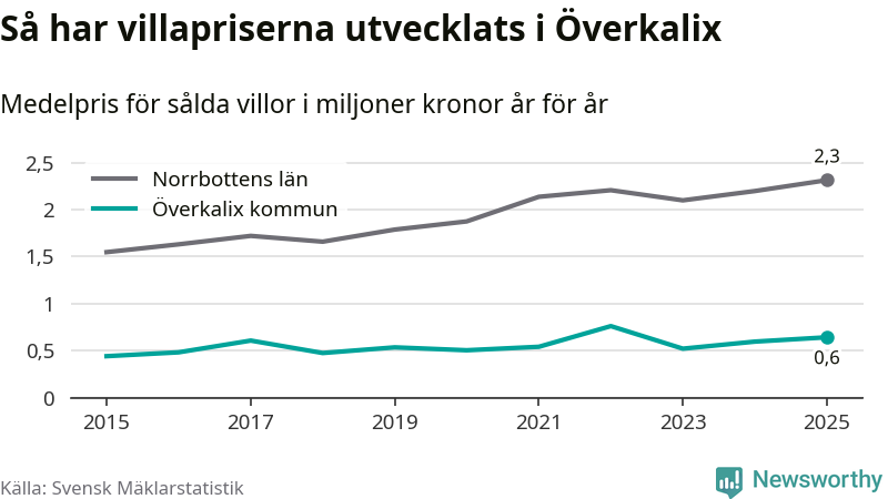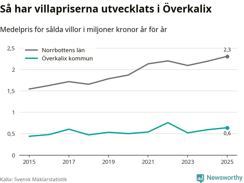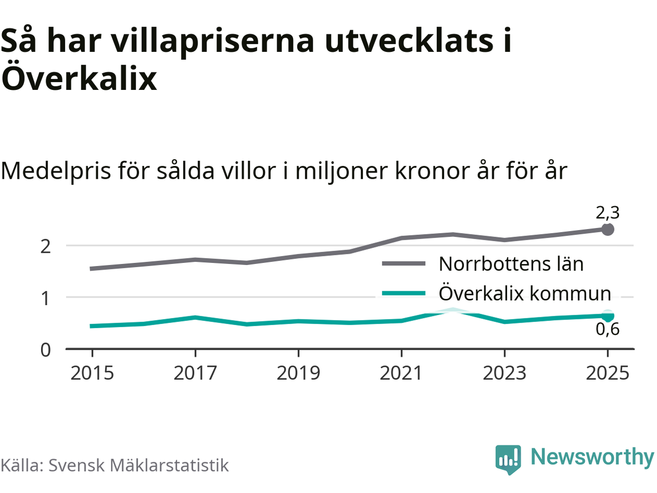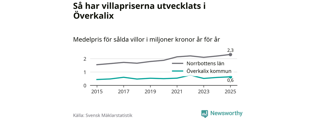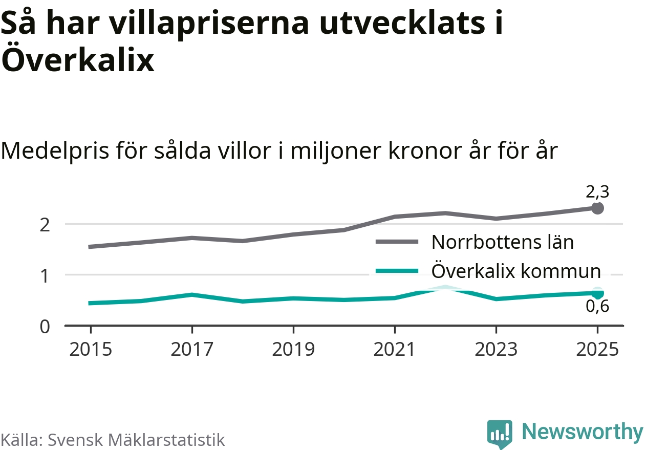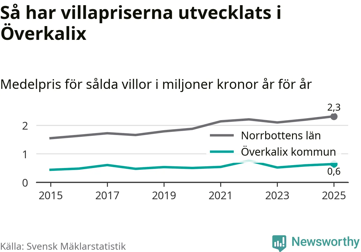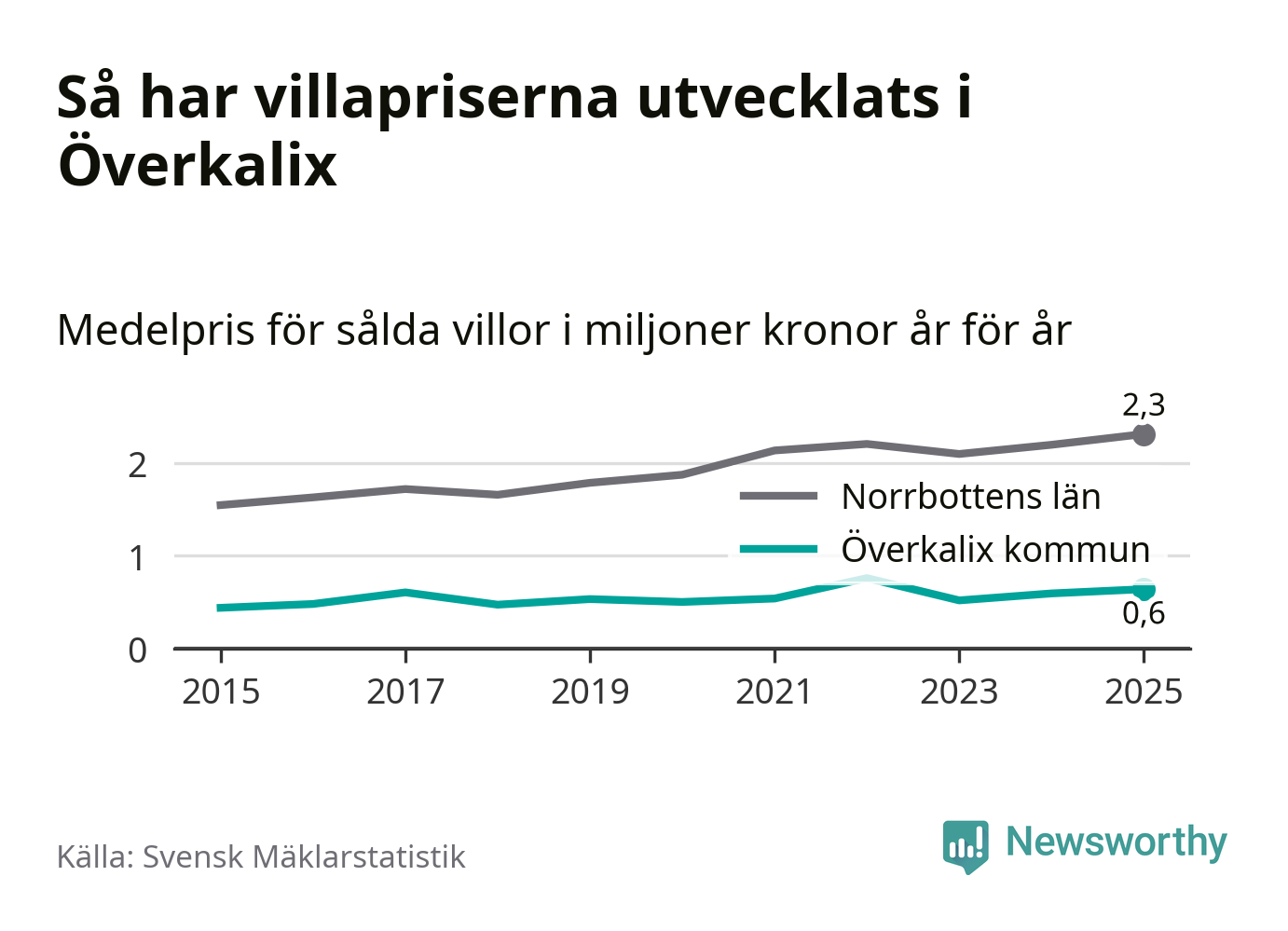 641 000 kronor är medelpriset för de villor som såldes i Överkalix kommun under året, eller 6 410 kronor per kvadratmeter. Det innebär en prisökning med åtta procent på ett år och är andra året i rad som priserna ökar i kommunen.