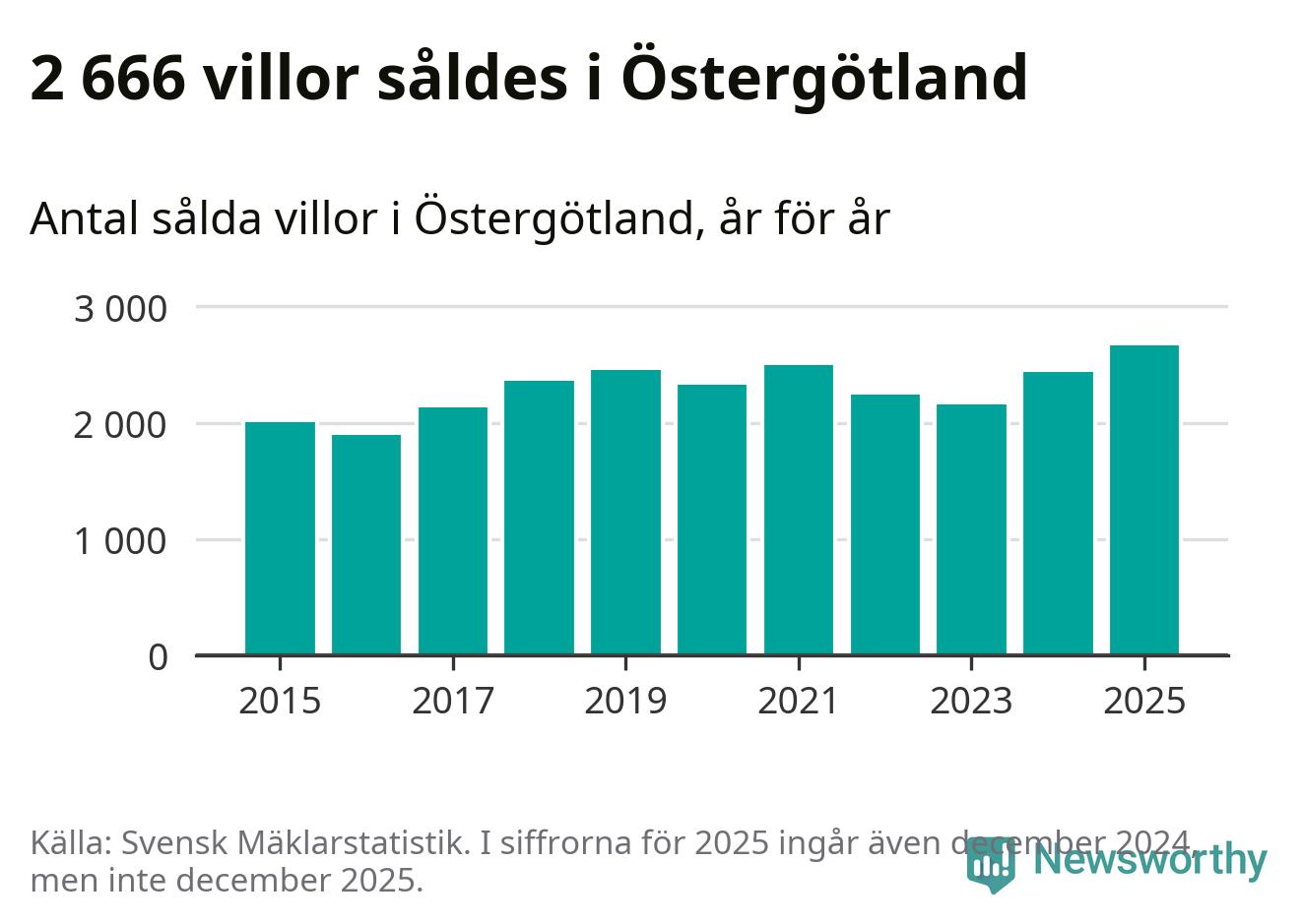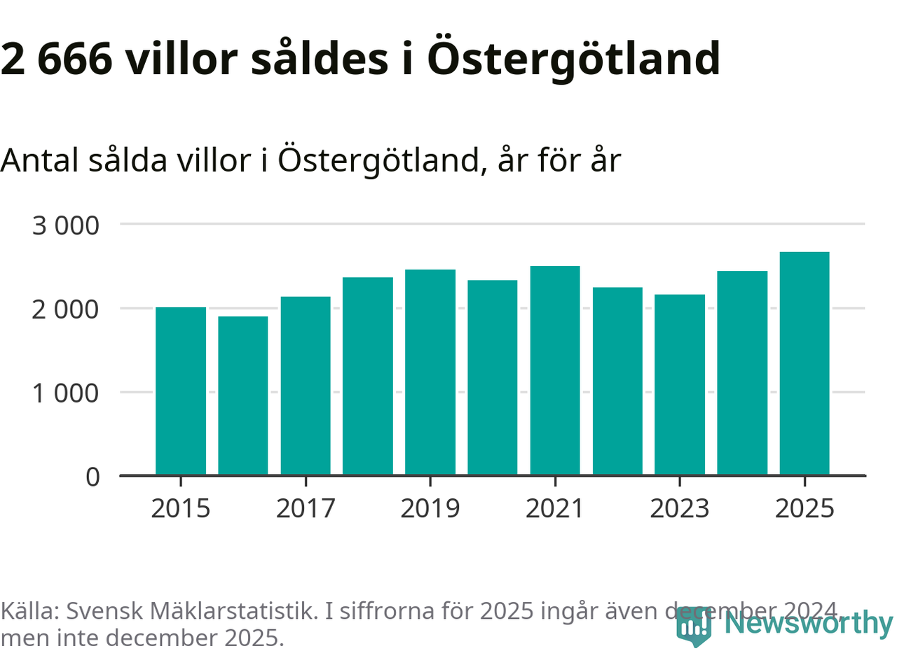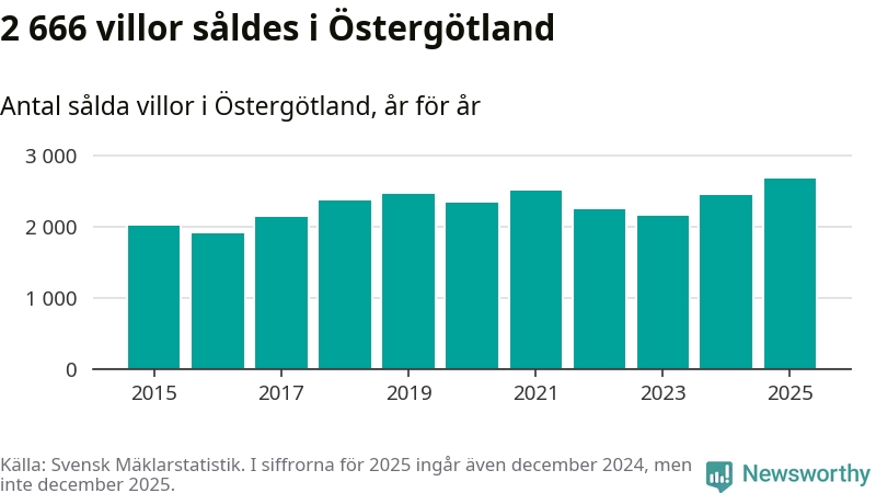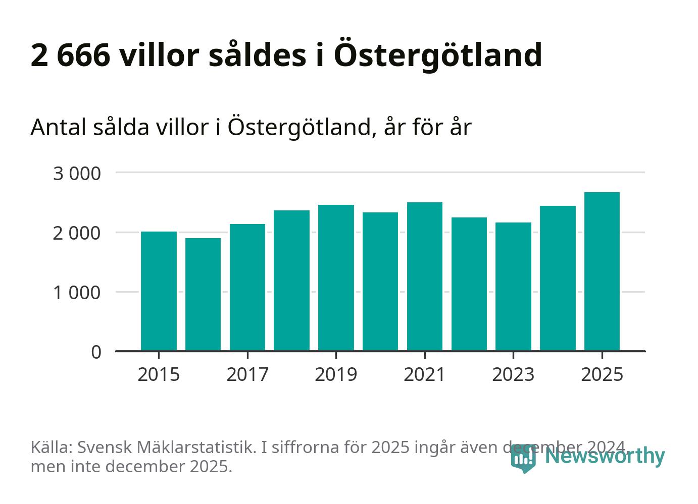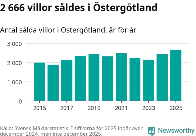 Däremot ökade antalet sålda villor. Totalt såldes 2 666 villor, att jämföra med 2 434 under 2024. Det är fler än något annat år sedan 2015.