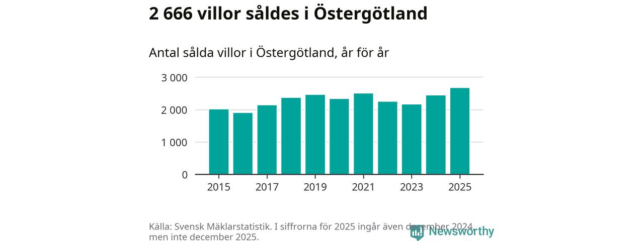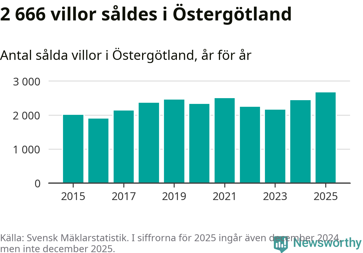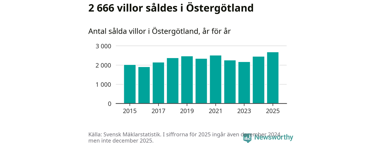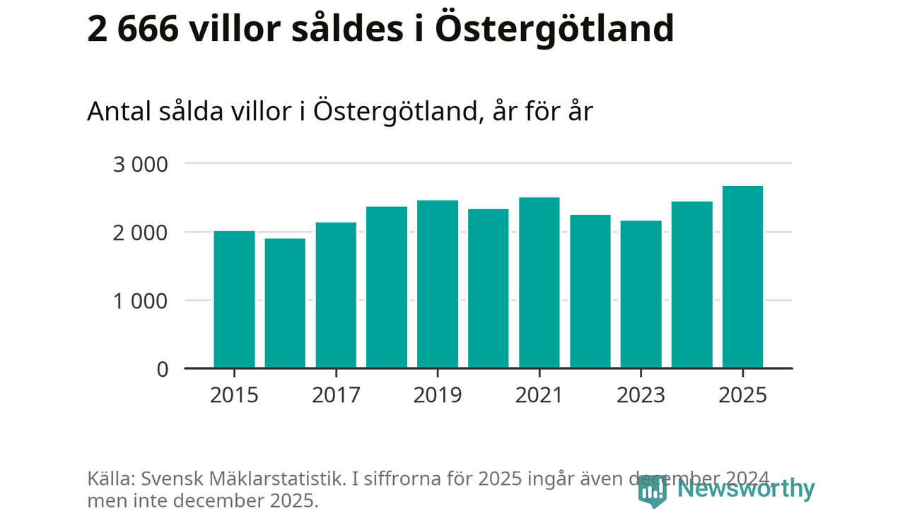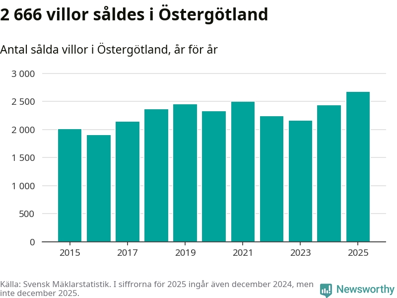 Däremot ökade antalet sålda villor. Totalt såldes 2 666 villor, att jämföra med 2 434 under 2024. Det är fler än något annat år sedan 2015.