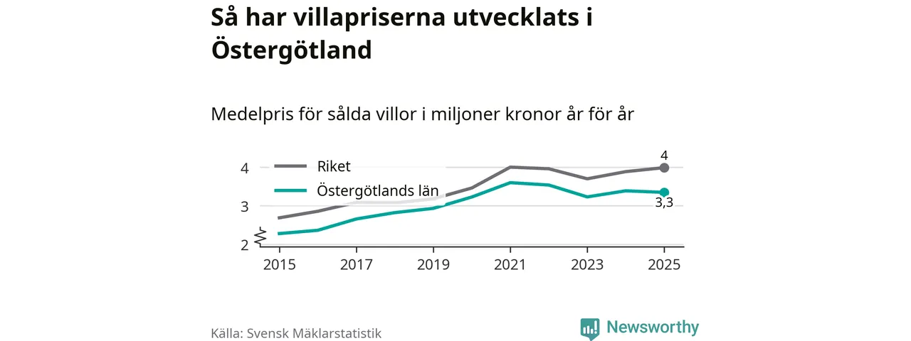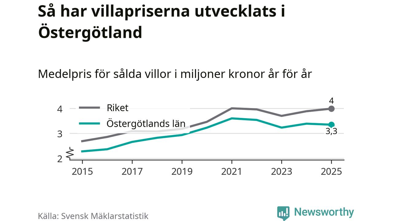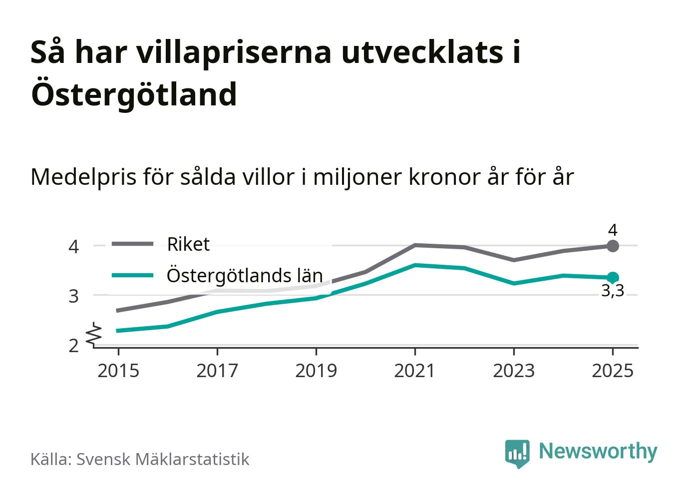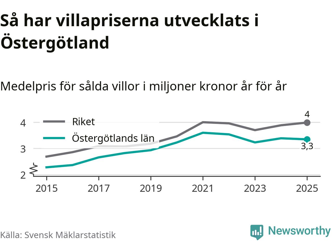 3,3 miljoner kronor är medelpriset för de villor som såldes i Östergötlands län under året, eller 27 189 kronor per kvadratmeter. Det innebär en prisminskning med en procent på ett år.