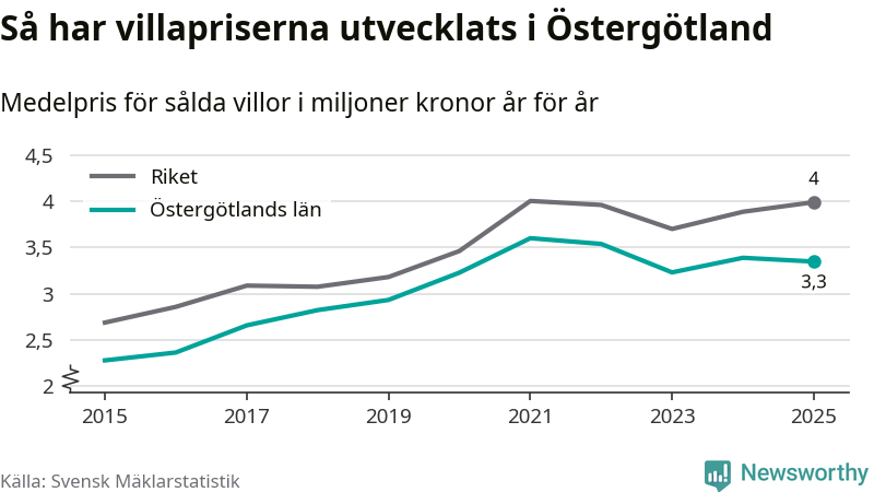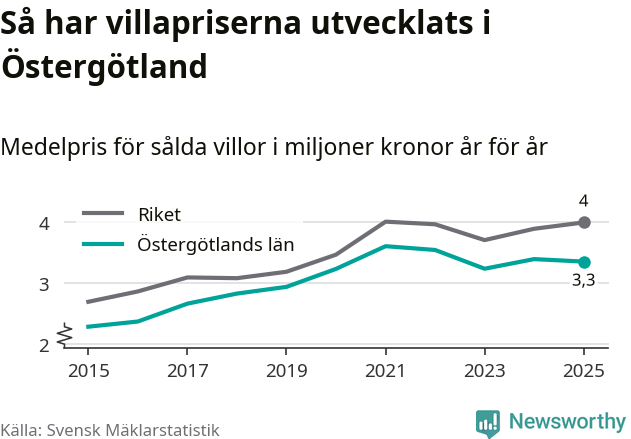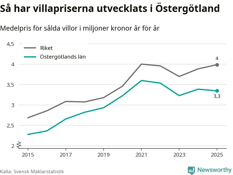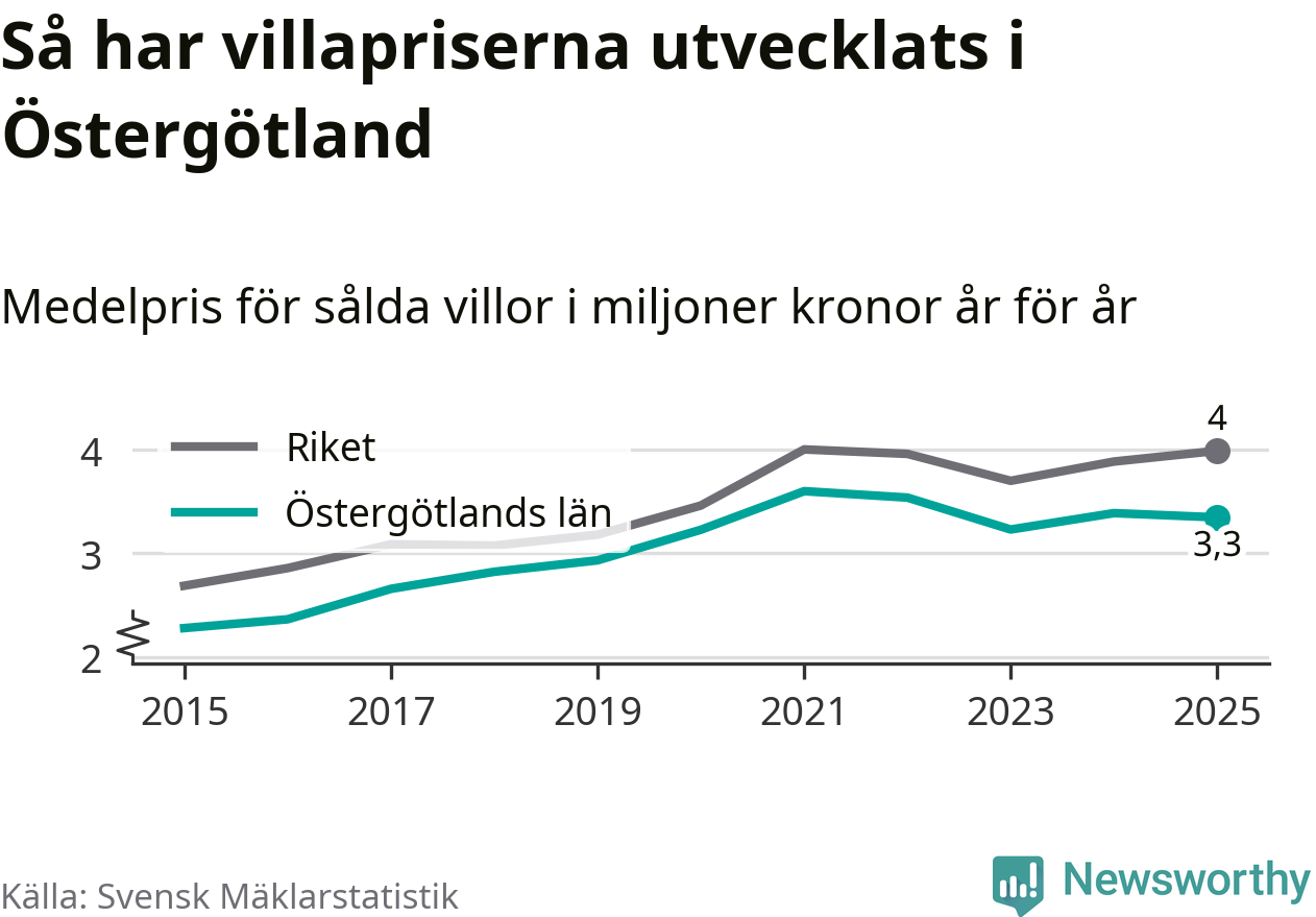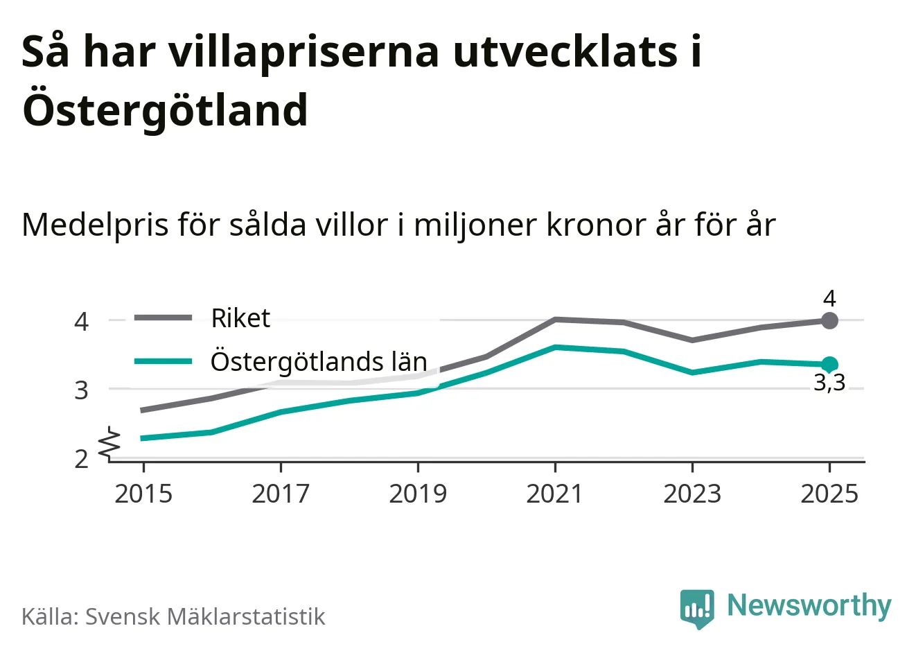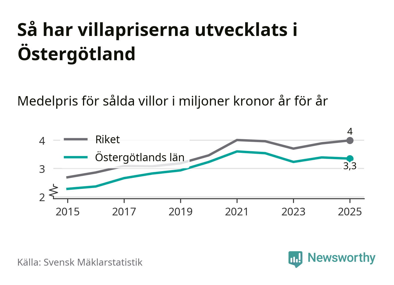 3,3 miljoner kronor är medelpriset för de villor som såldes i Östergötlands län under året, eller 27 189 kronor per kvadratmeter. Det innebär en prisminskning med en procent på ett år.