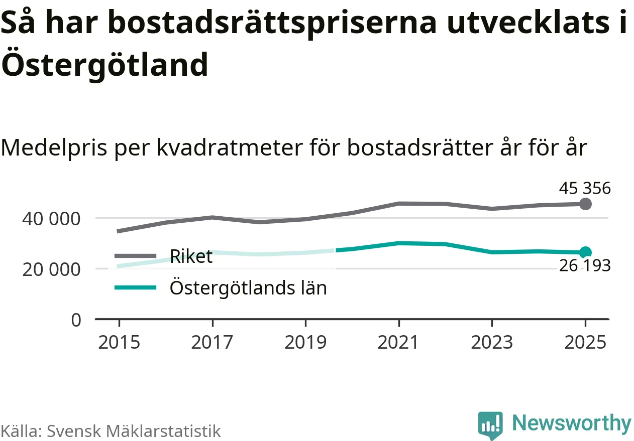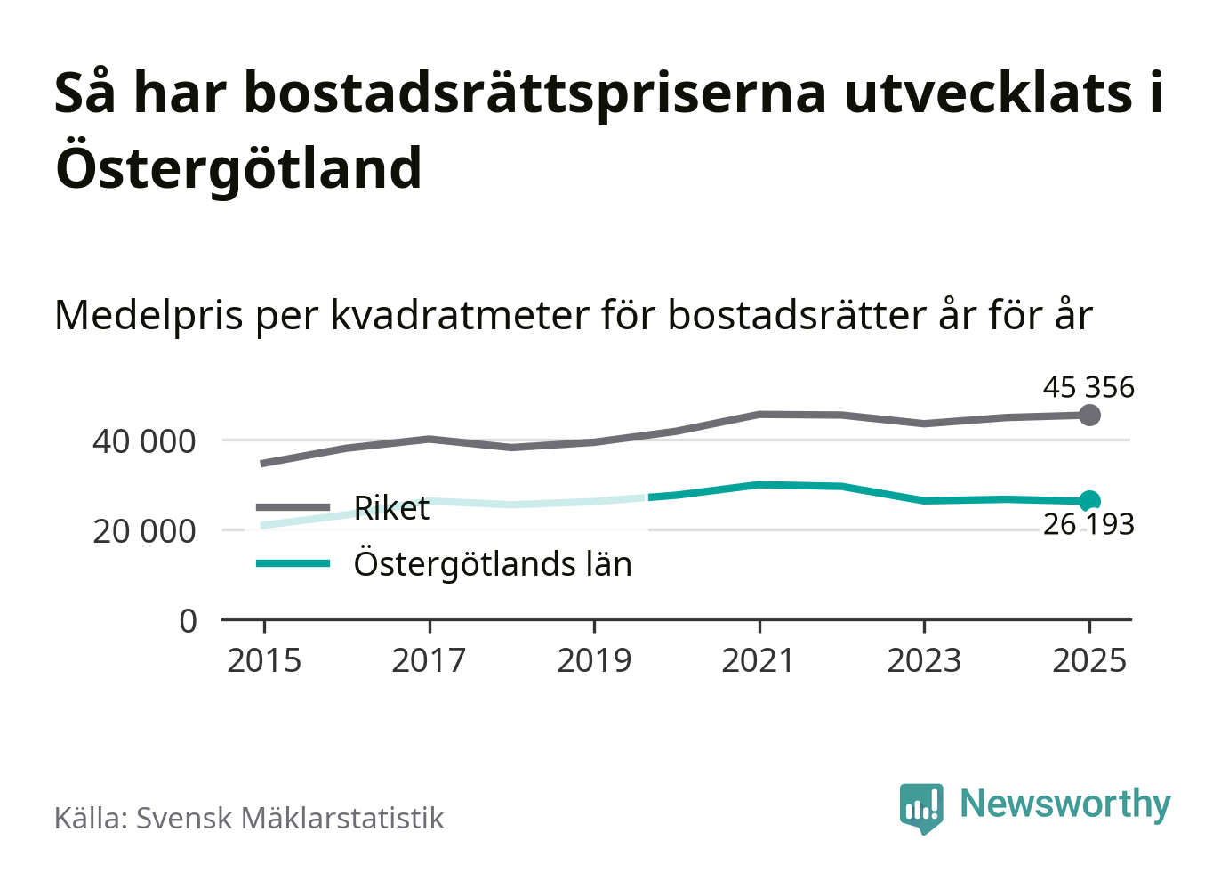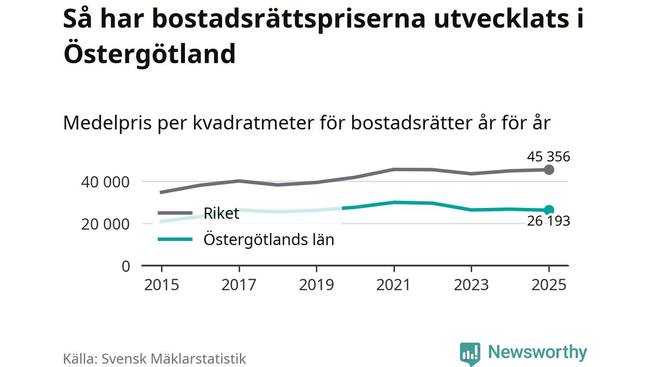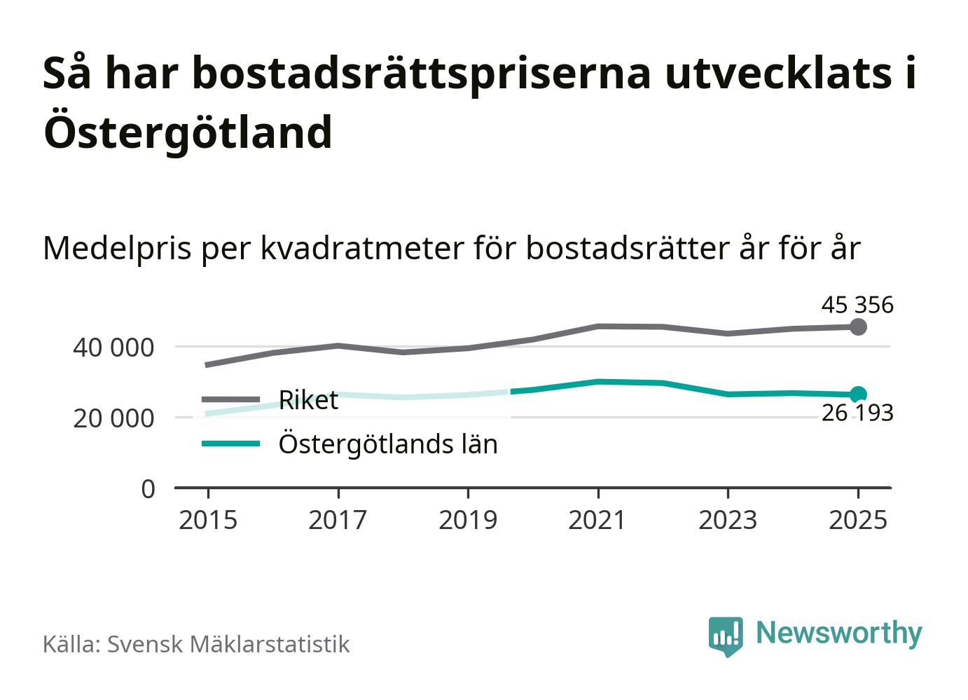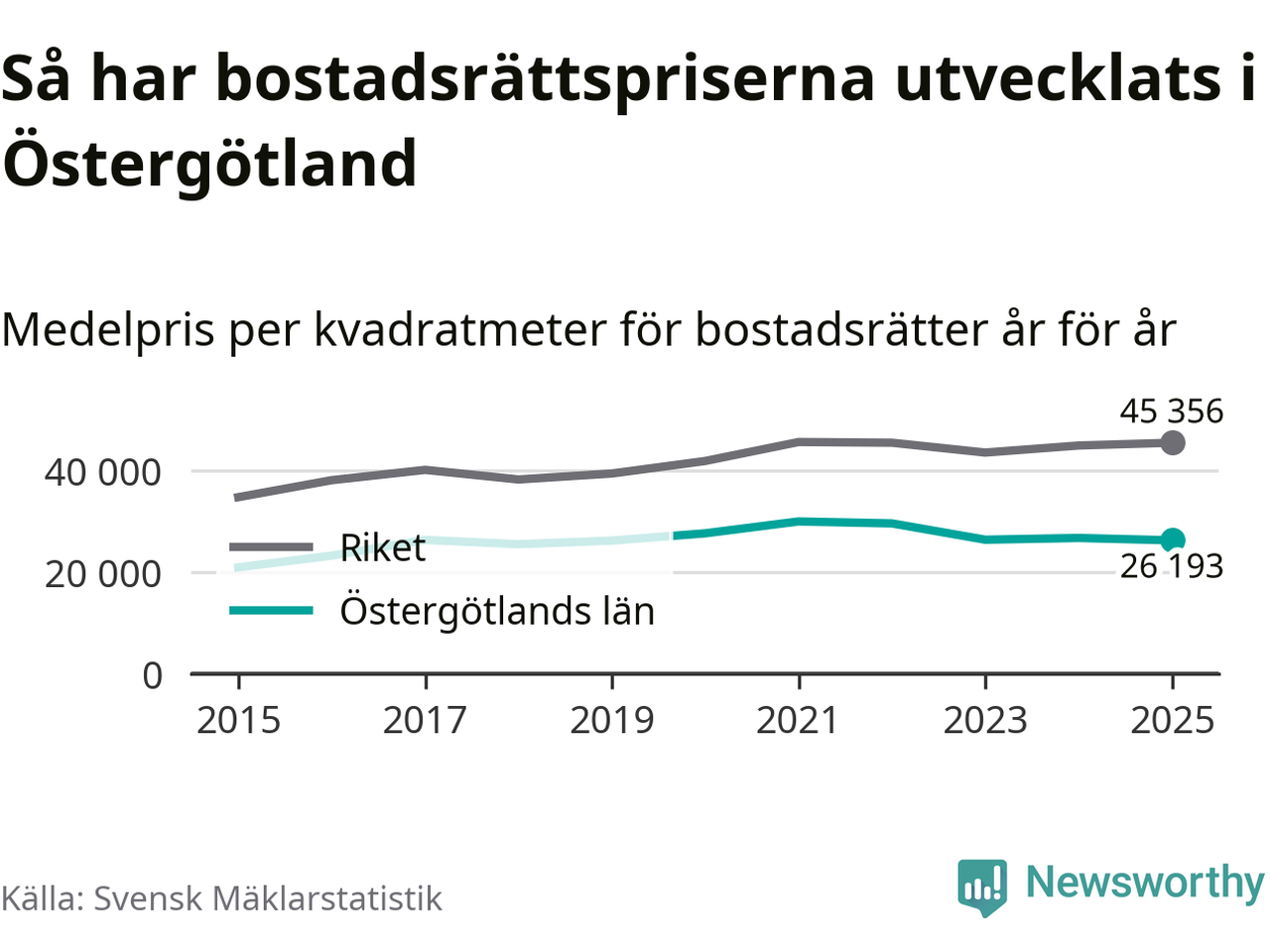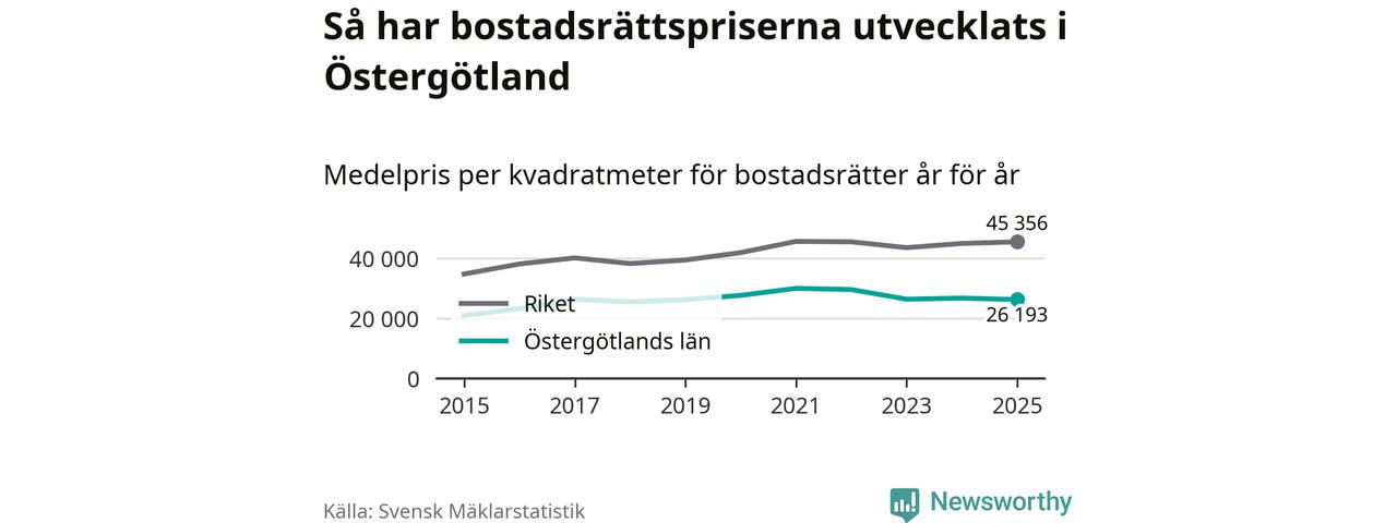 Det såldes totalt 3 511 bostadsrätter i Östergötlands län under året. Genomsnittspriset per kvadratmeter landade på 26 193 kronor. Det är en minskning med två procent i länet på ett år.