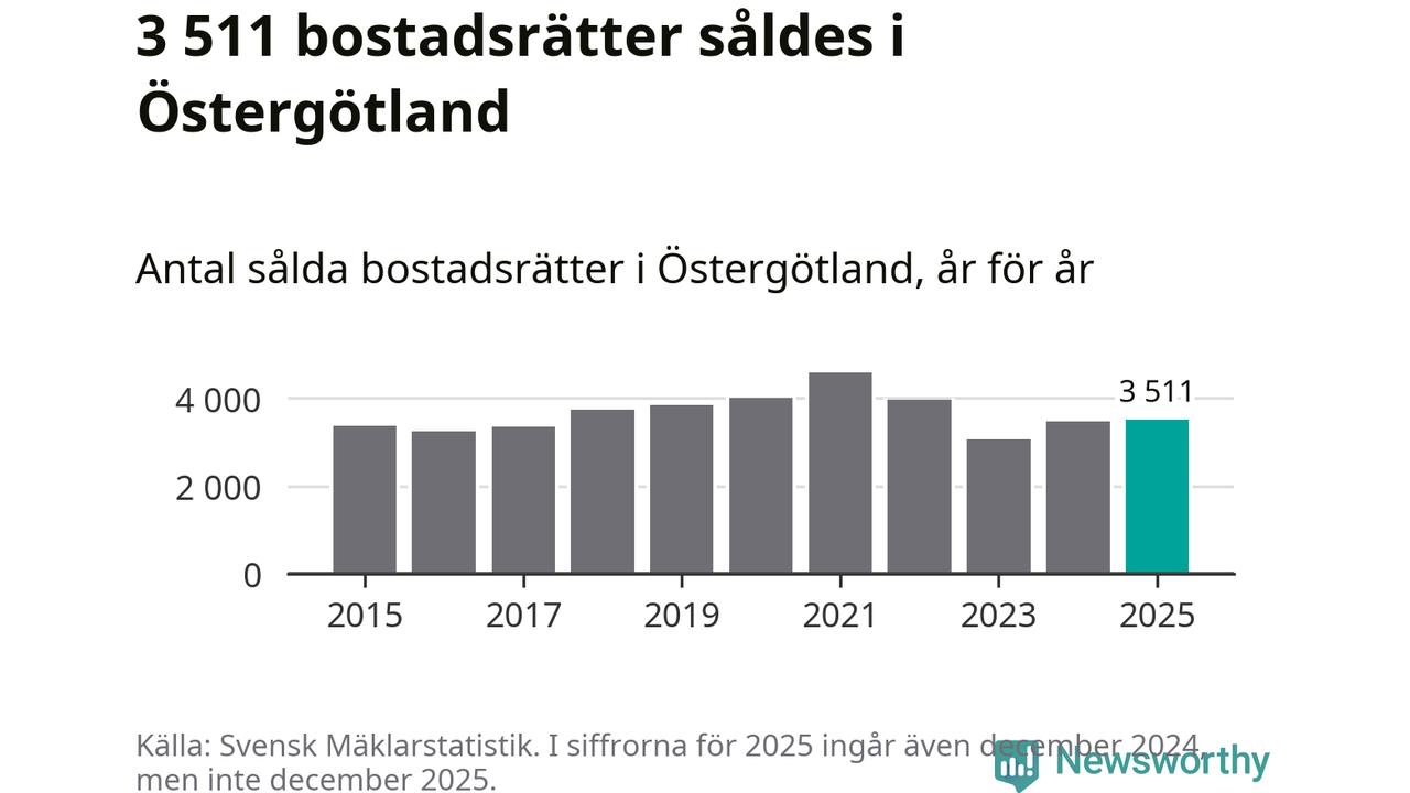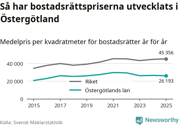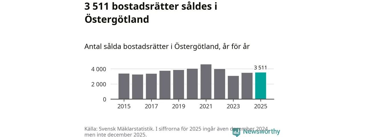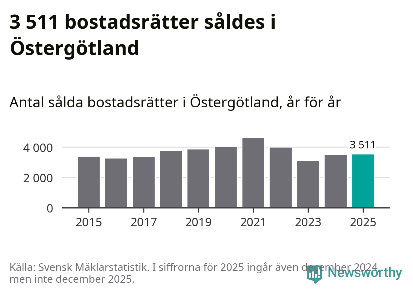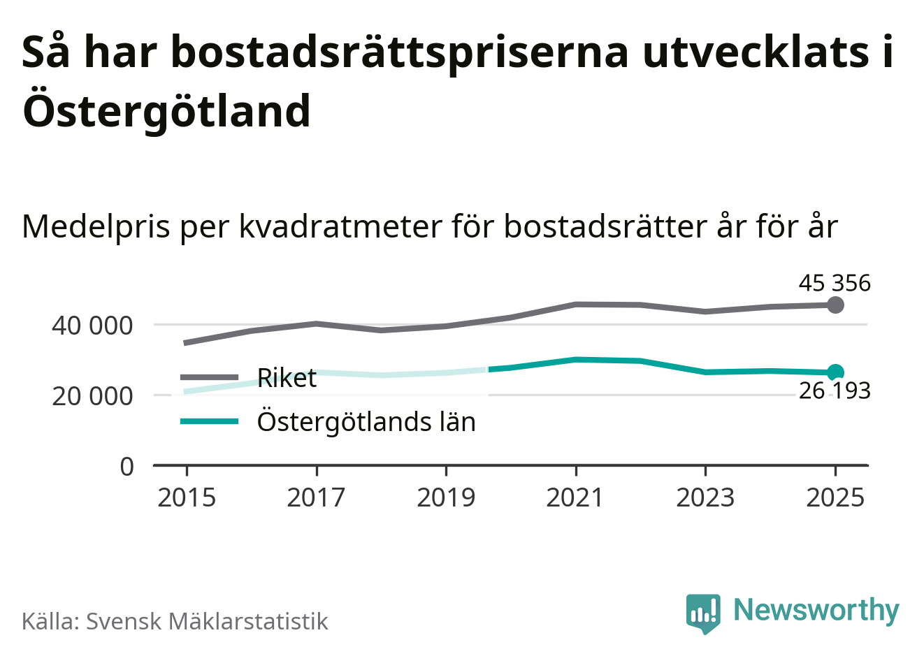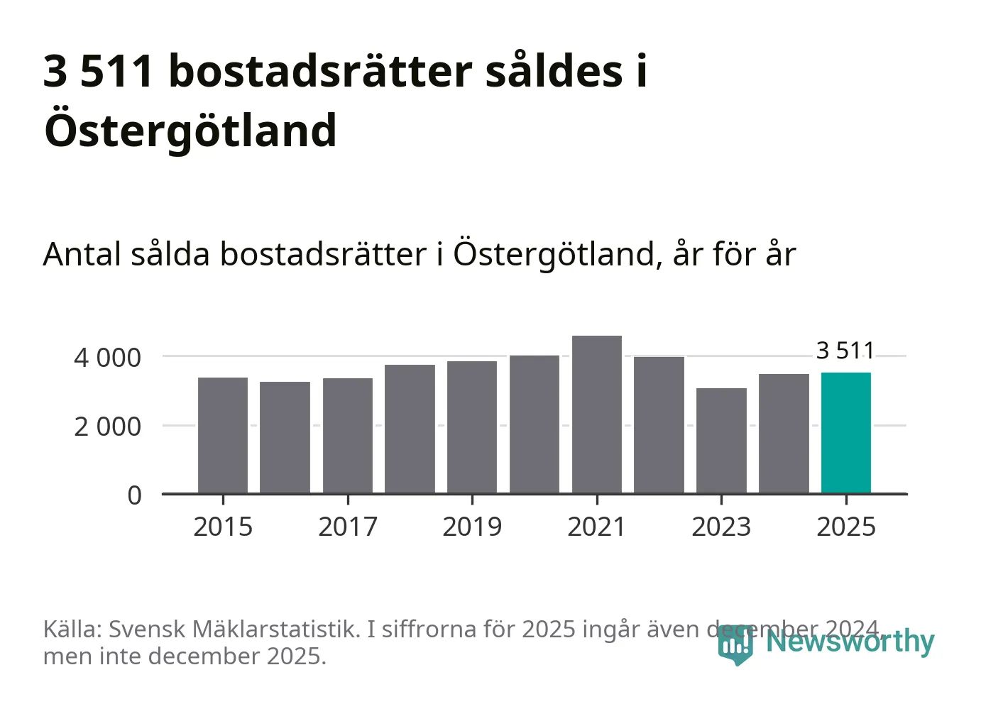 Det såldes totalt 3 511 bostadsrätter i Östergötlands län under året. Genomsnittspriset per kvadratmeter landade på 26 193 kronor. Det är en minskning med två procent i länet på ett år.