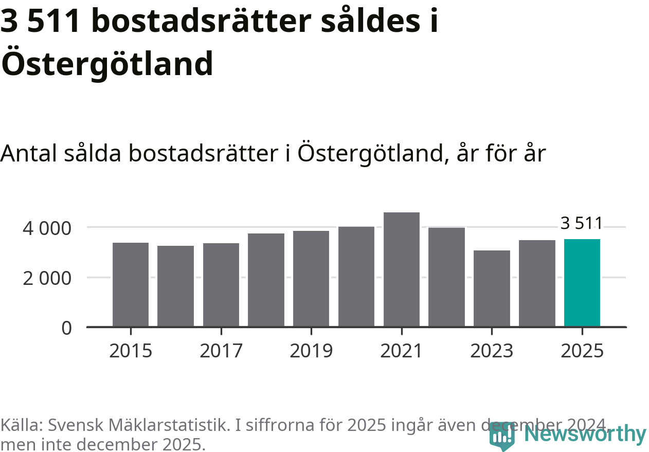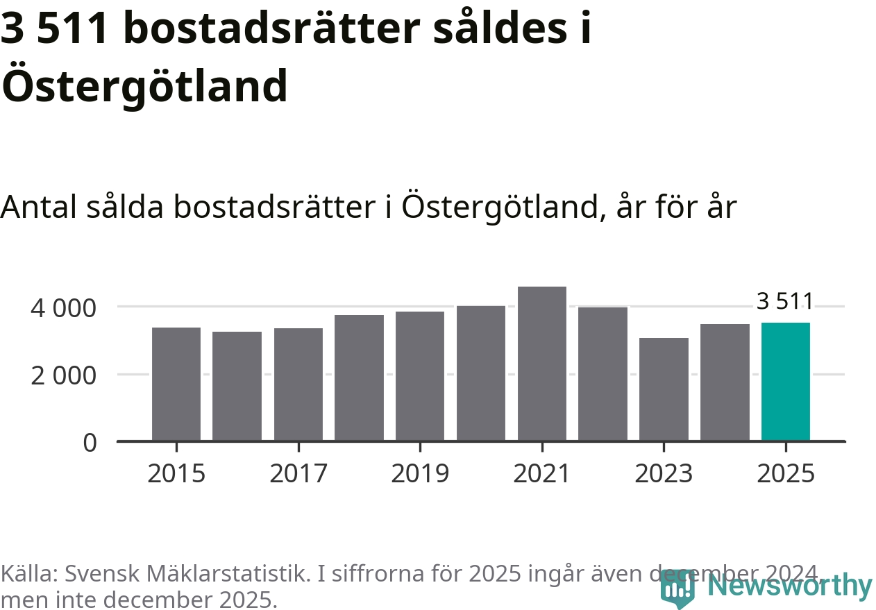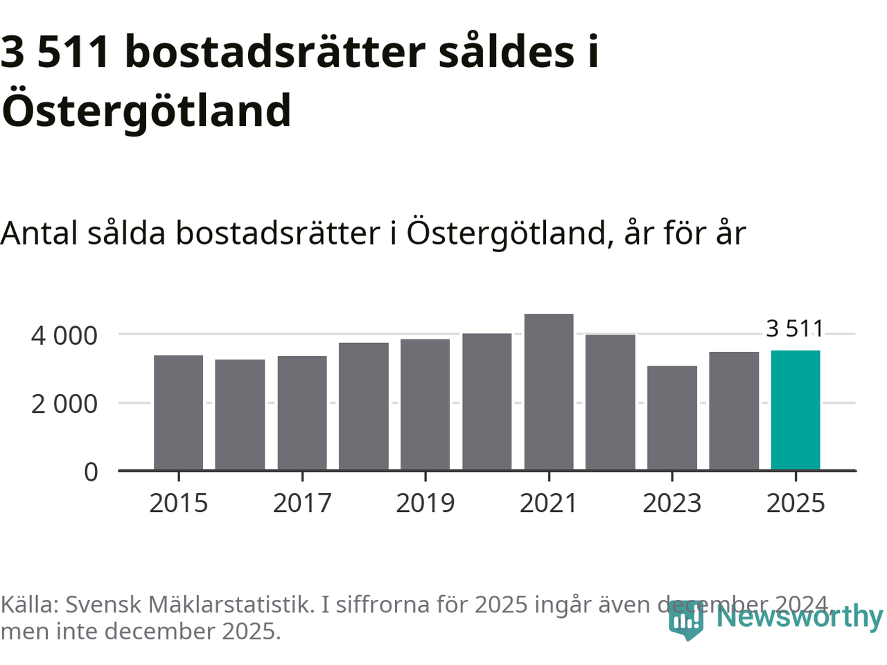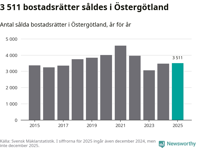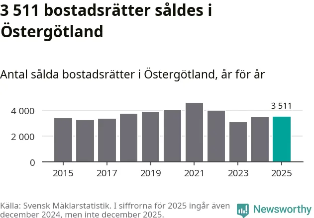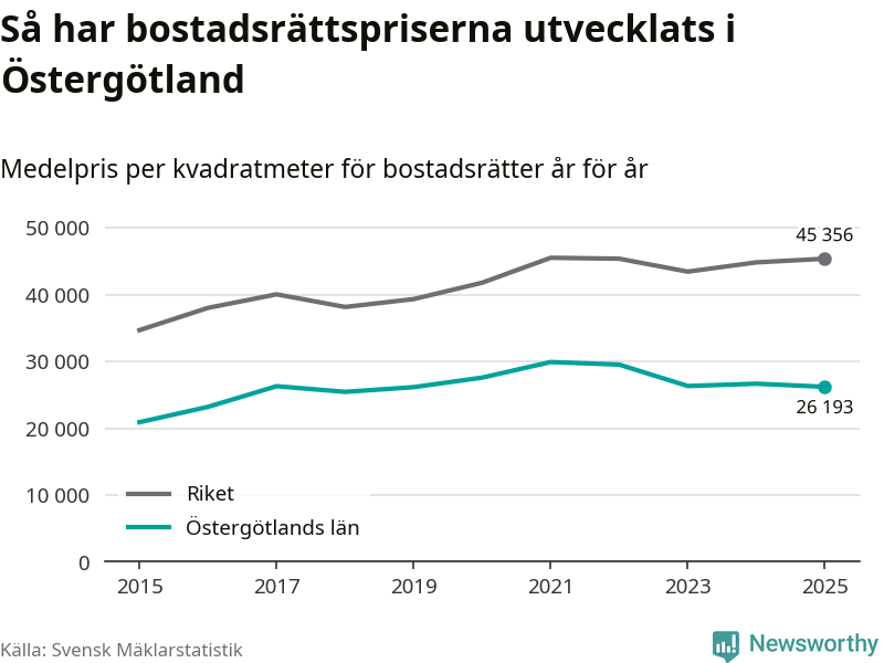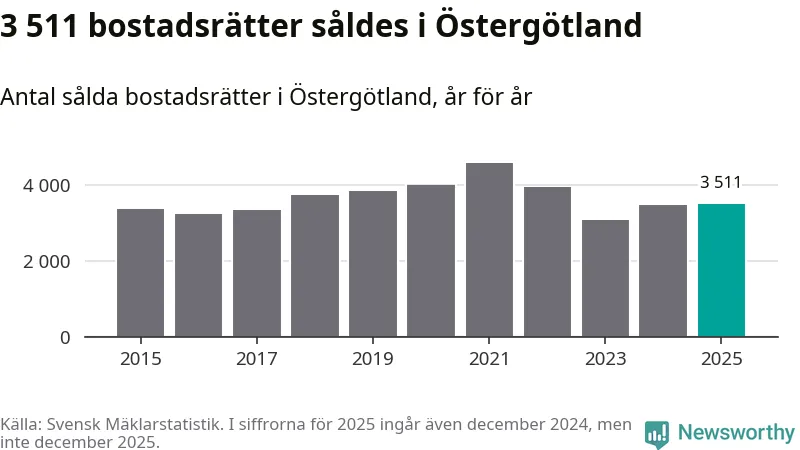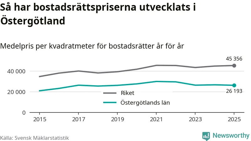 Det såldes totalt 3 511 bostadsrätter i Östergötlands län under året. Genomsnittspriset per kvadratmeter landade på 26 193 kronor. Det är en minskning med två procent i länet på ett år.