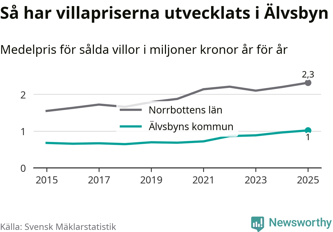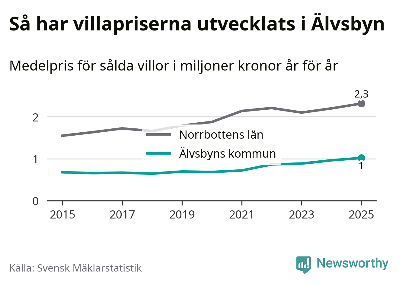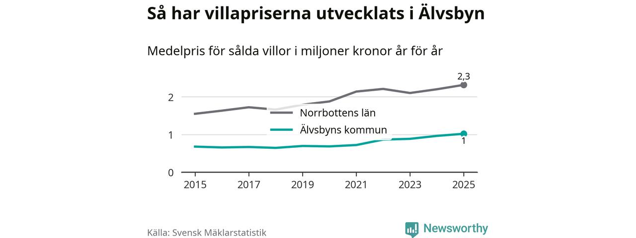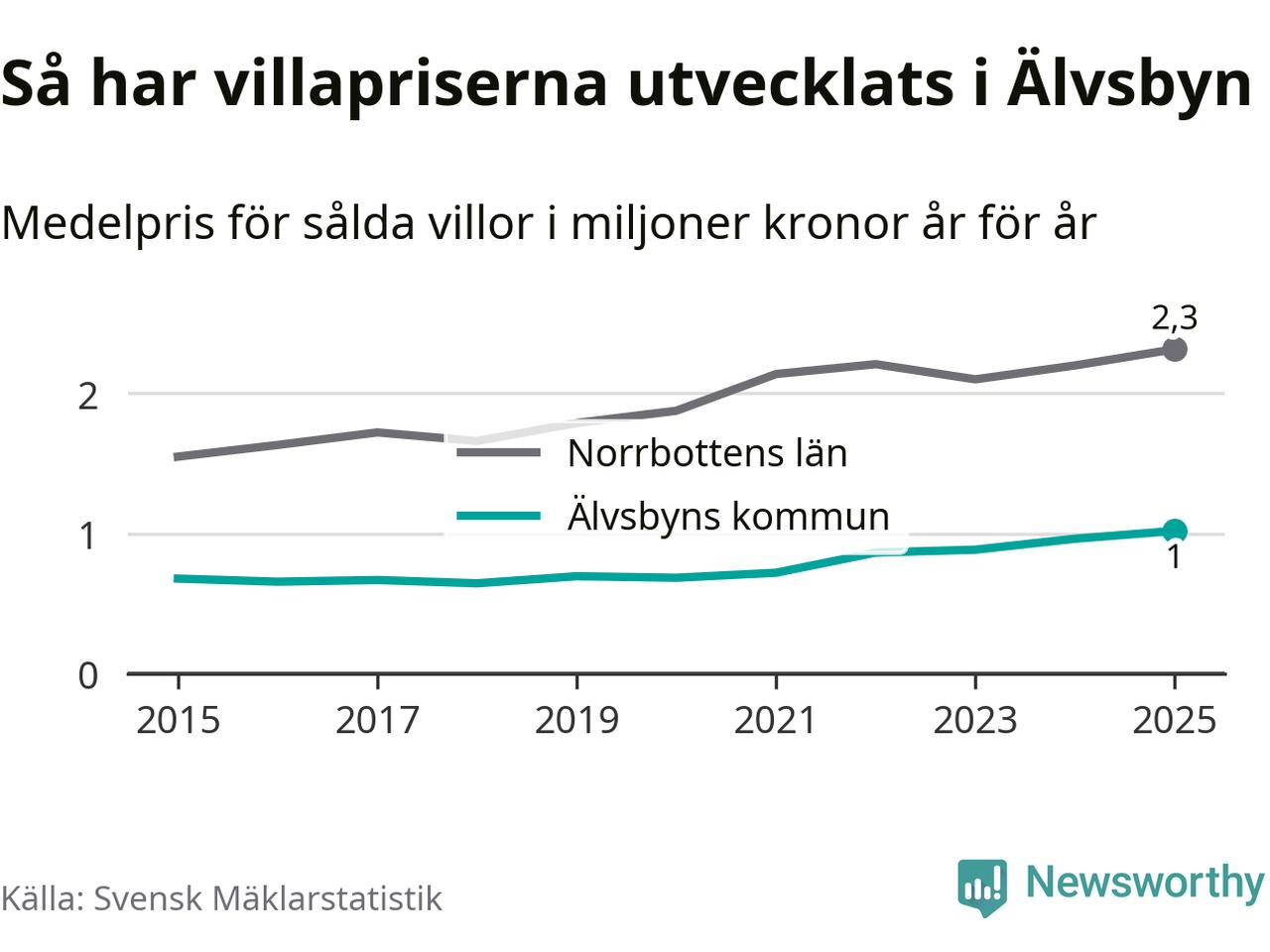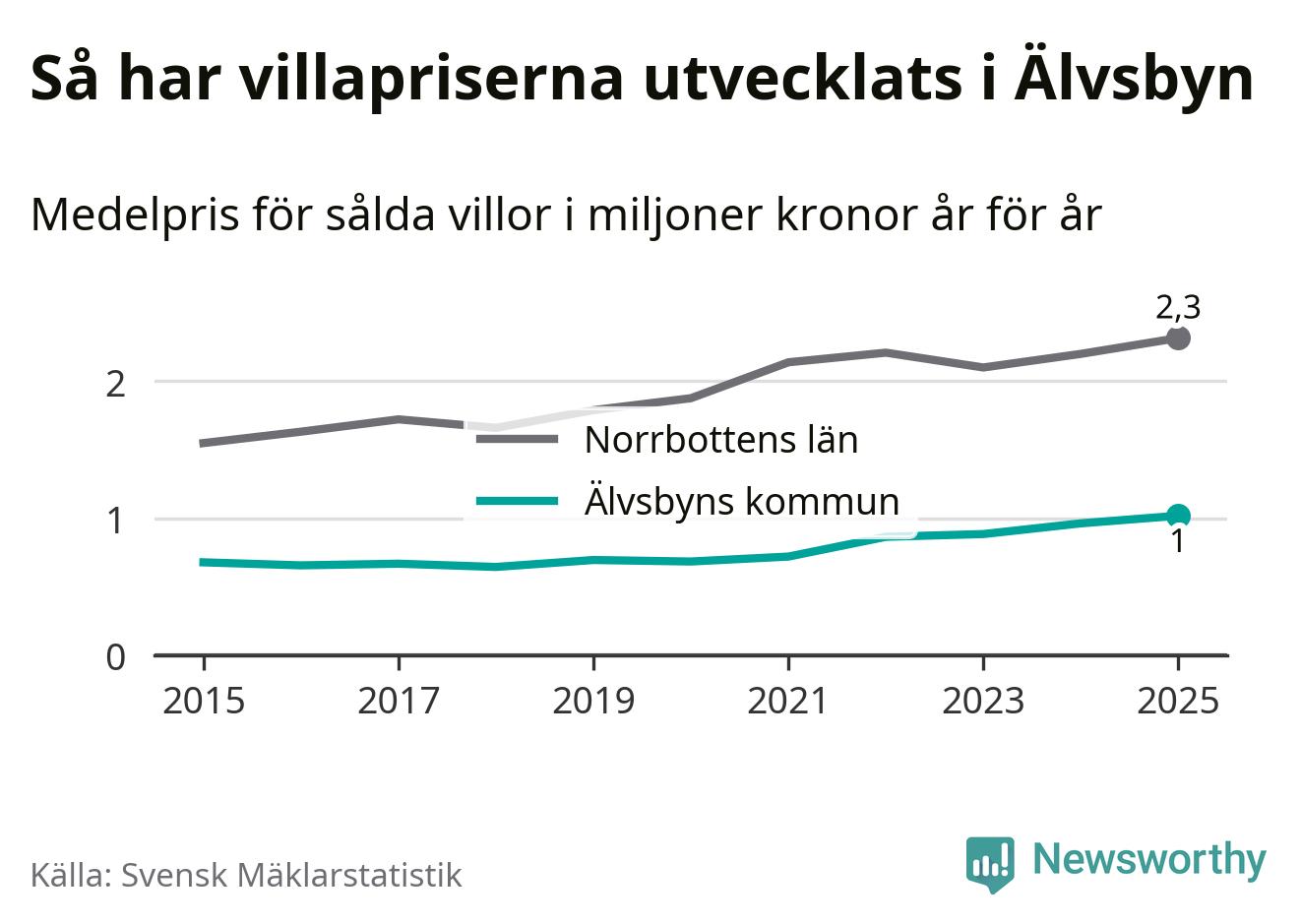 En miljon kronor är medelpriset för de villor som såldes i Älvsbyns kommun under året, eller 8 951 kronor per kvadratmeter. Det innebär en prisökning med sex procent på ett år. Det är det högsta årssnittet på åtminstone tio år.