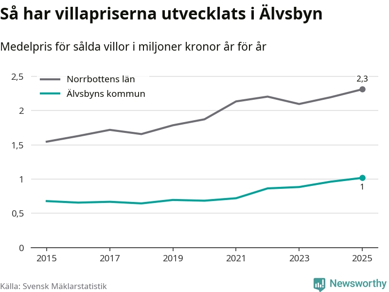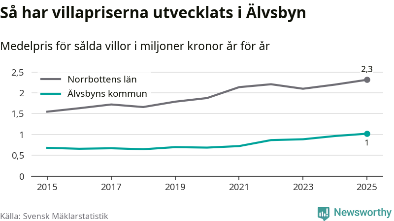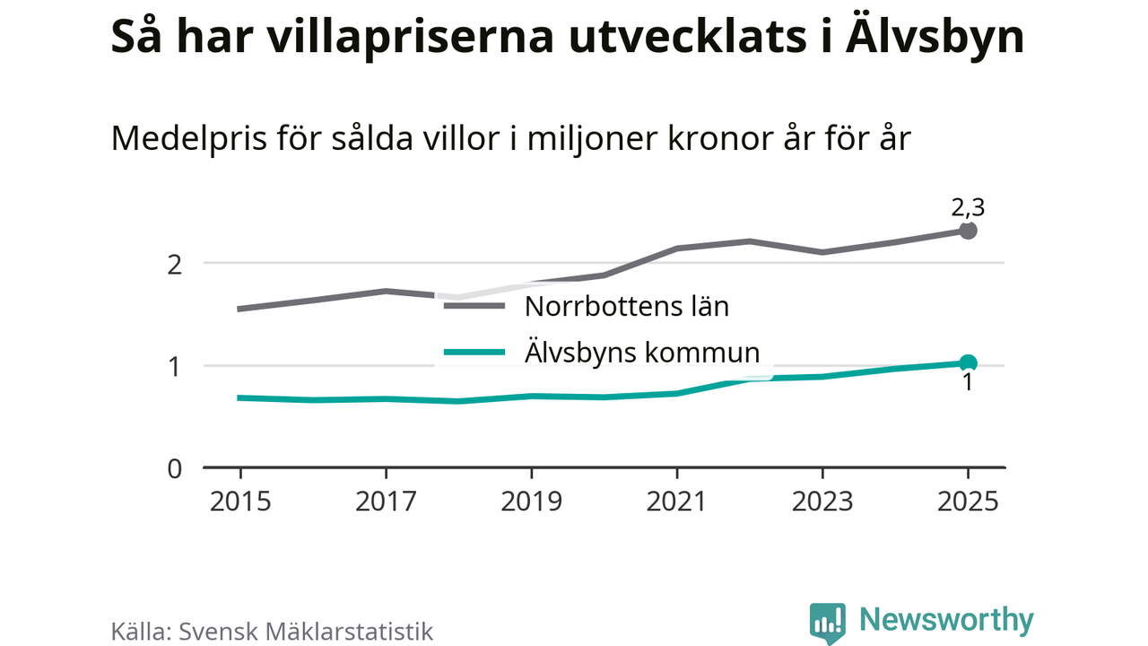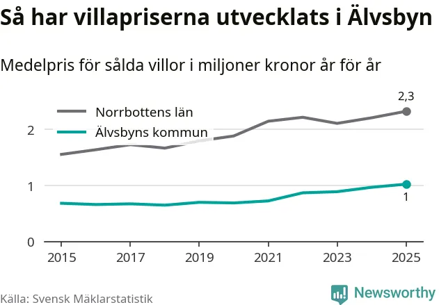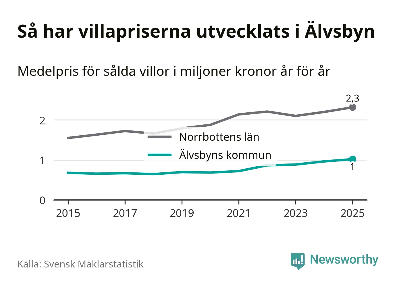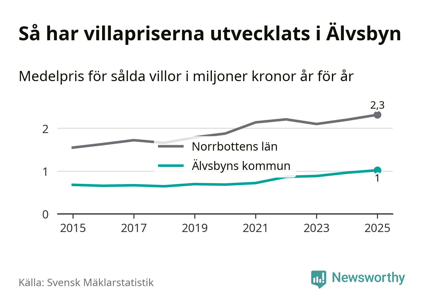 En miljon kronor är medelpriset för de villor som såldes i Älvsbyns kommun under året, eller 8 951 kronor per kvadratmeter. Det innebär en prisökning med sex procent på ett år. Det är det högsta årssnittet på åtminstone tio år.
