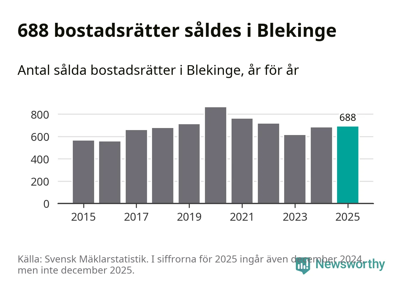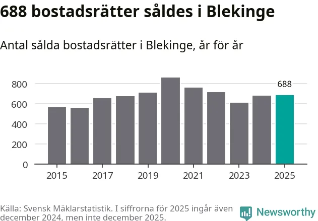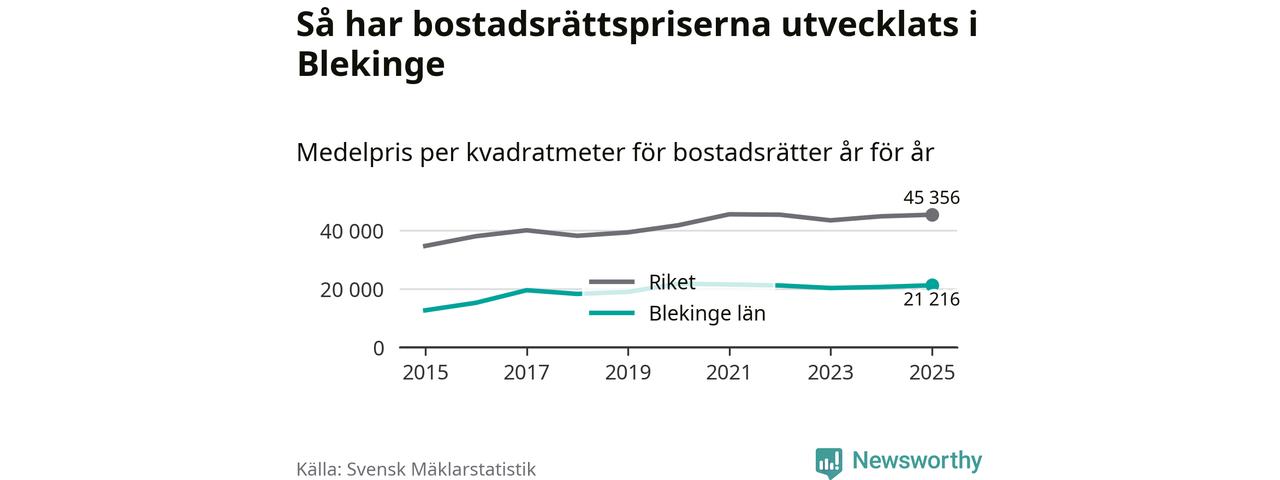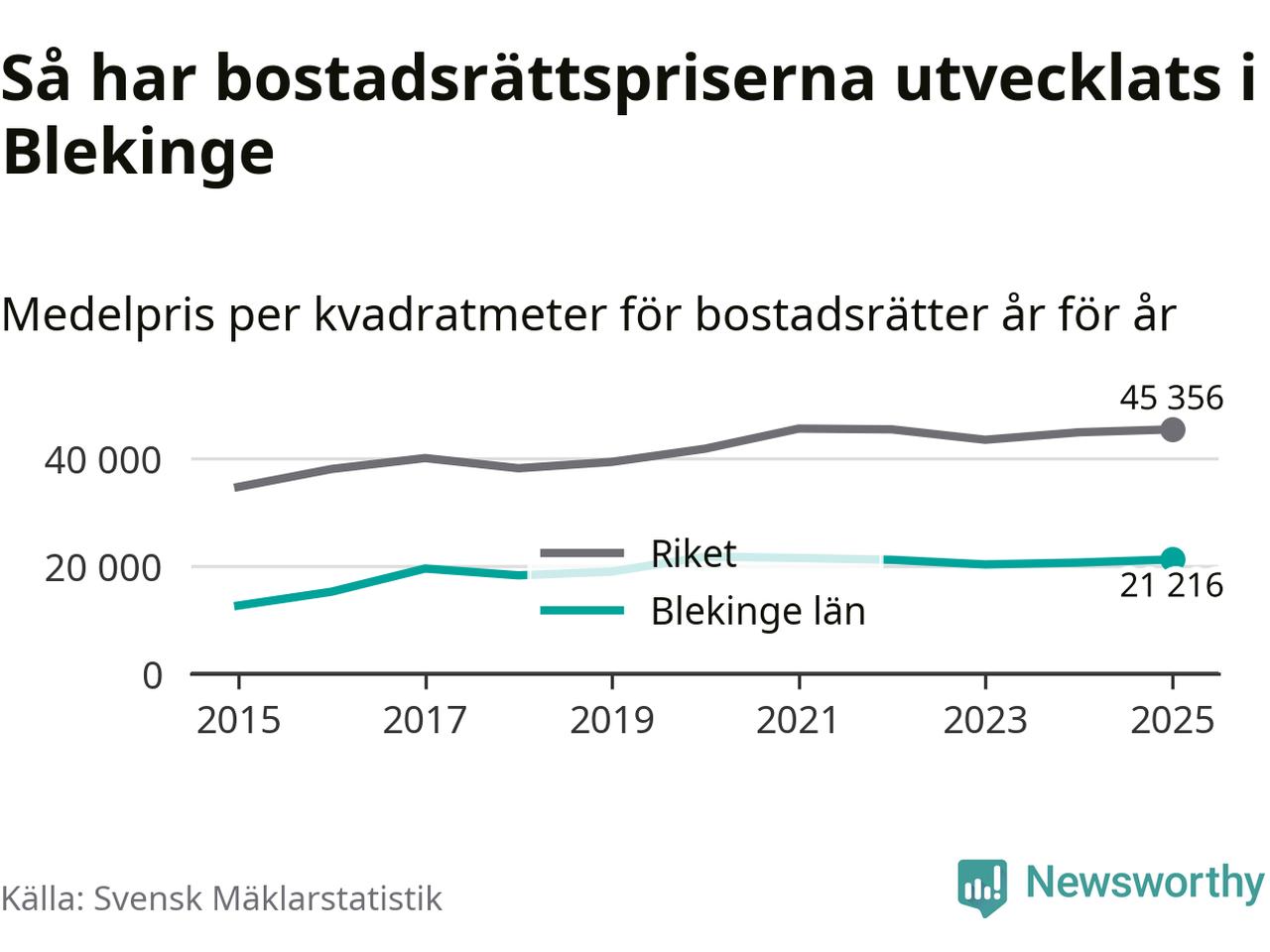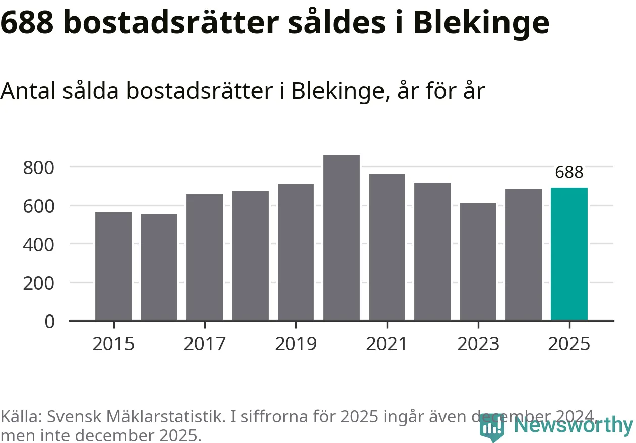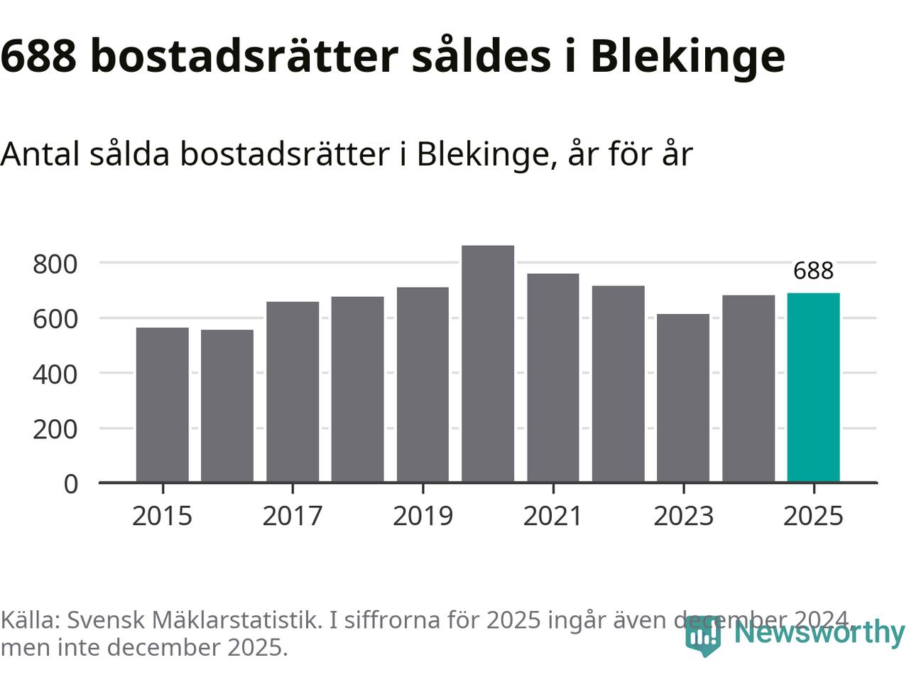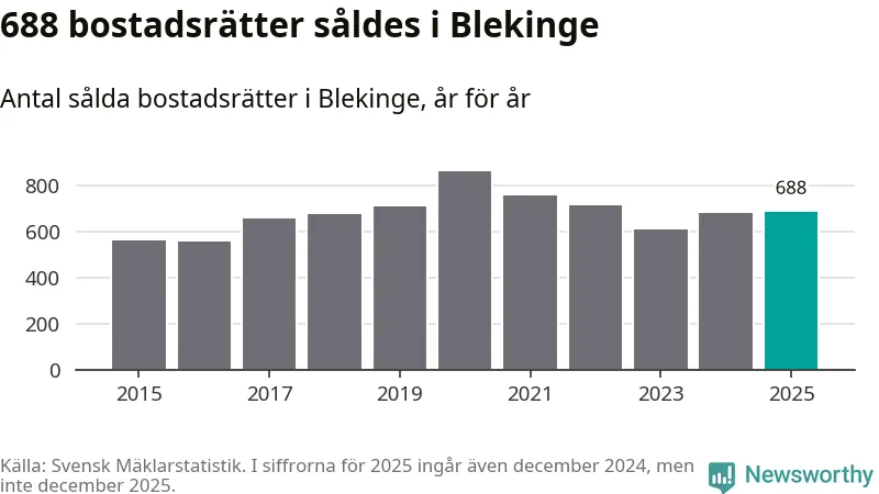 Det såldes totalt 688 bostadsrätter i Blekinge län under året. Genomsnittspriset per kvadratmeter landade på 21 216 kronor. Det är en ökning med tre procent i länet på ett år.