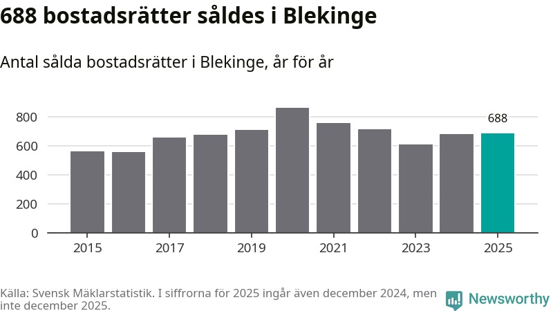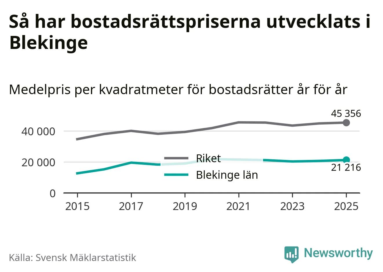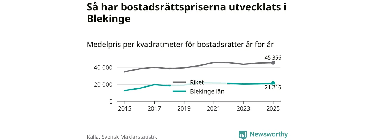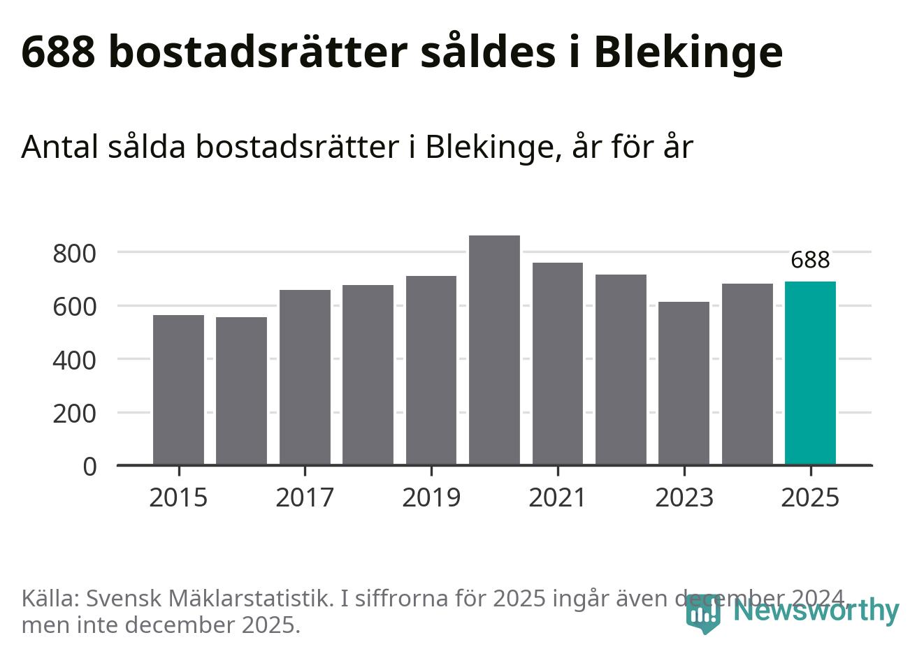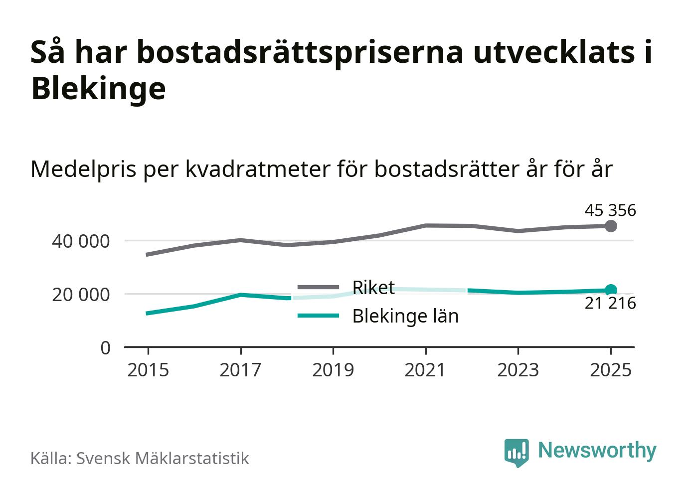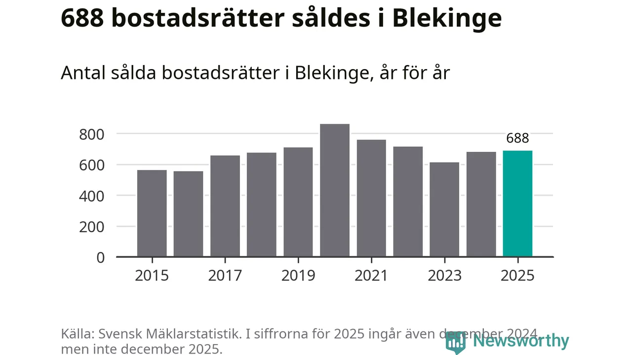 Det såldes totalt 688 bostadsrätter i Blekinge län under året. Genomsnittspriset per kvadratmeter landade på 21 216 kronor. Det är en ökning med tre procent i länet på ett år.