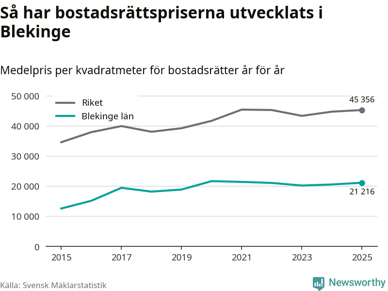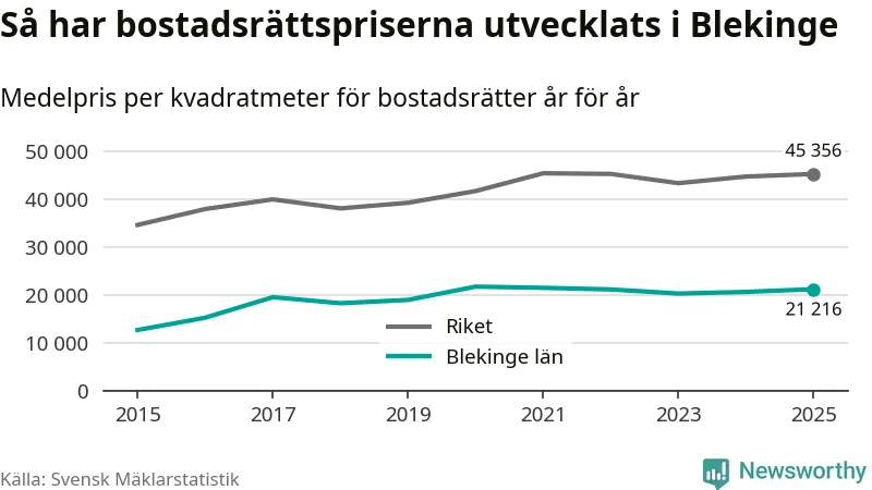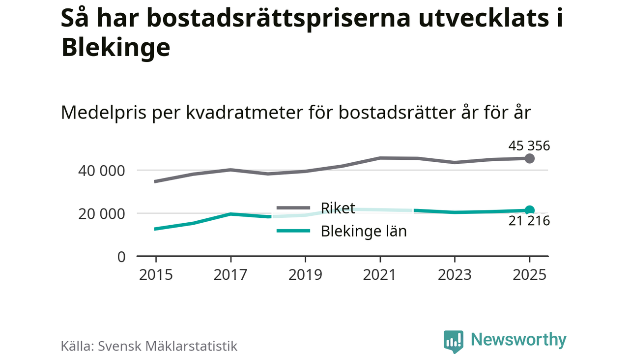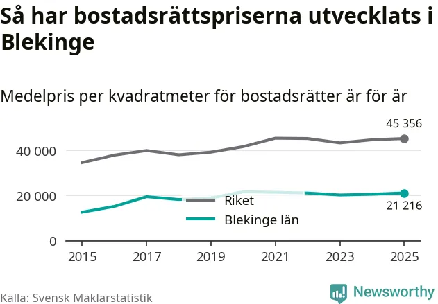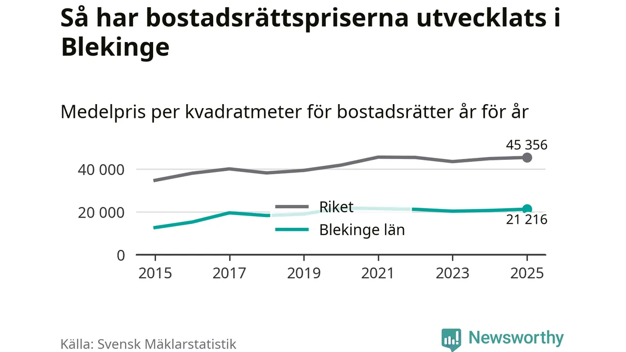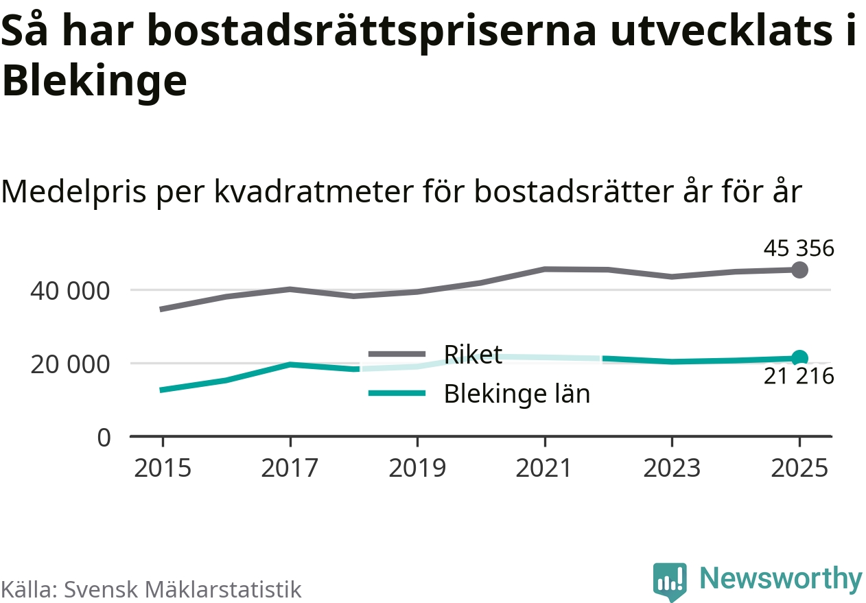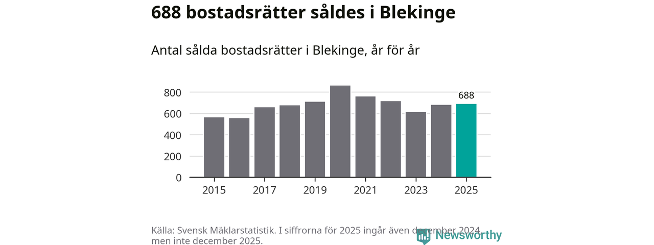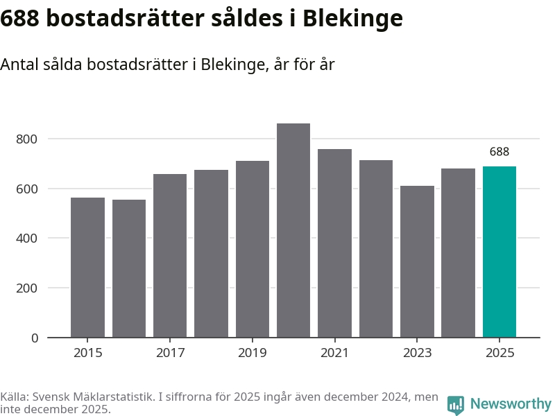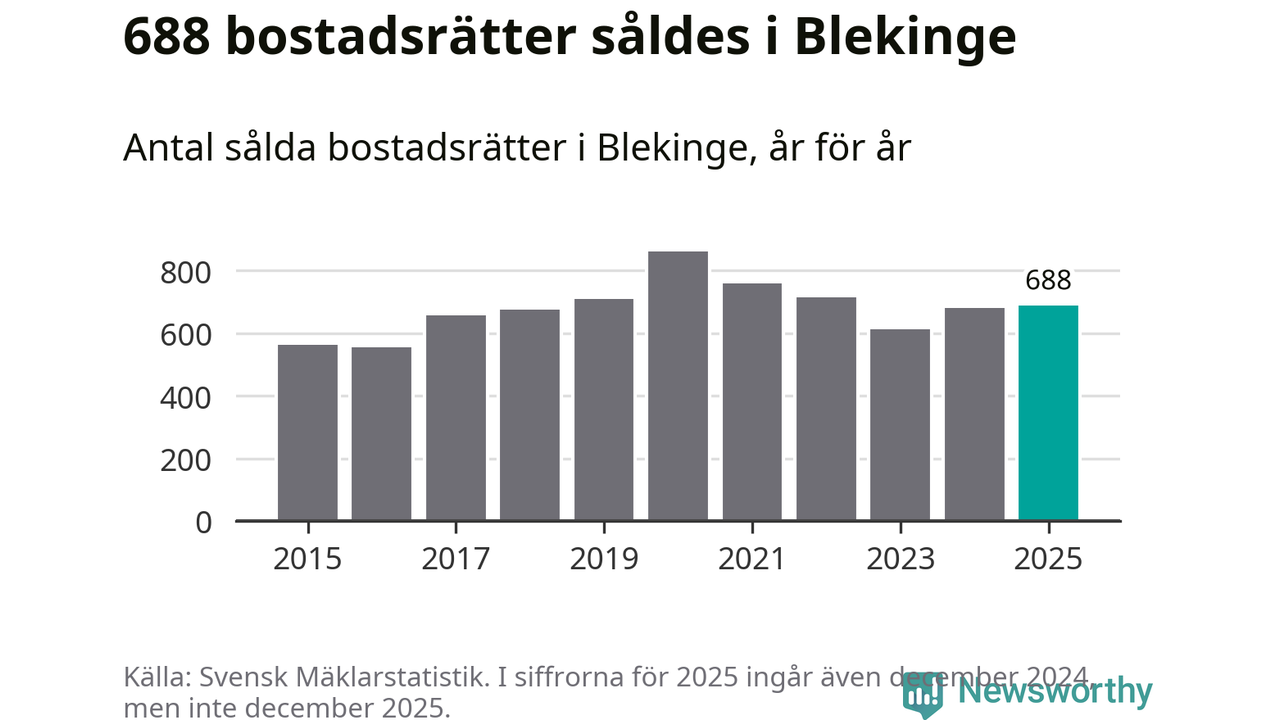 Det såldes totalt 688 bostadsrätter i Blekinge län under året. Genomsnittspriset per kvadratmeter landade på 21 216 kronor. Det är en ökning med tre procent i länet på ett år.