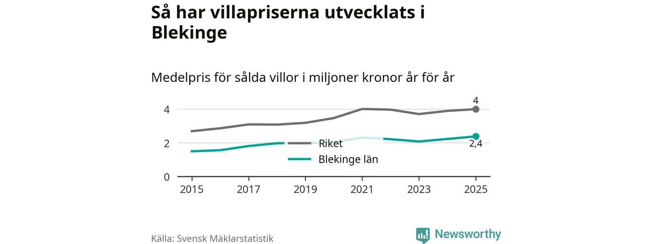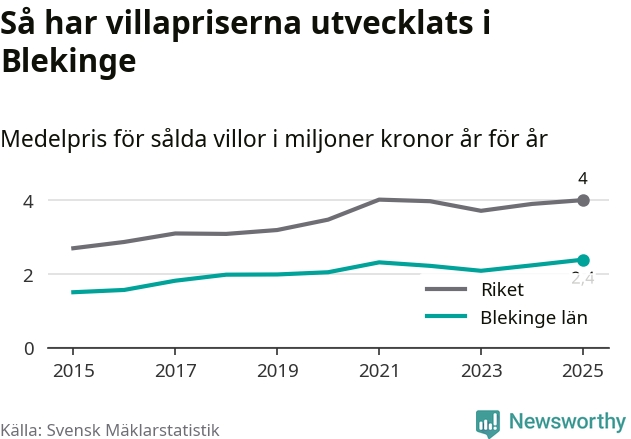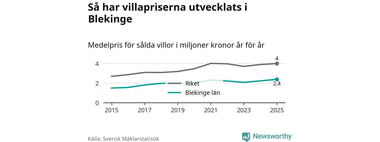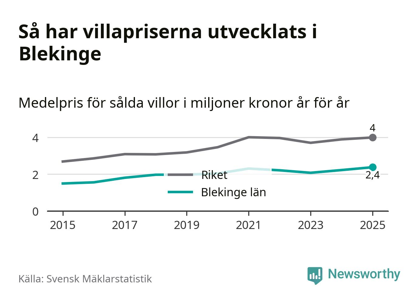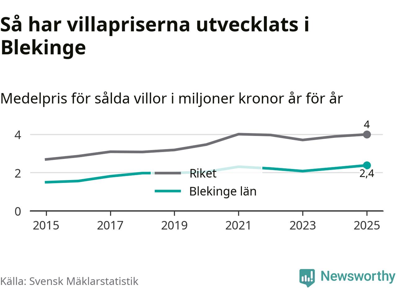 2,4 miljoner kronor är medelpriset för de villor som såldes i Blekinge län under året, eller 19 434 kronor per kvadratmeter. Det innebär en prisökning med sju procent på ett år. Det är det högsta årssnittet på åtminstone tio år.