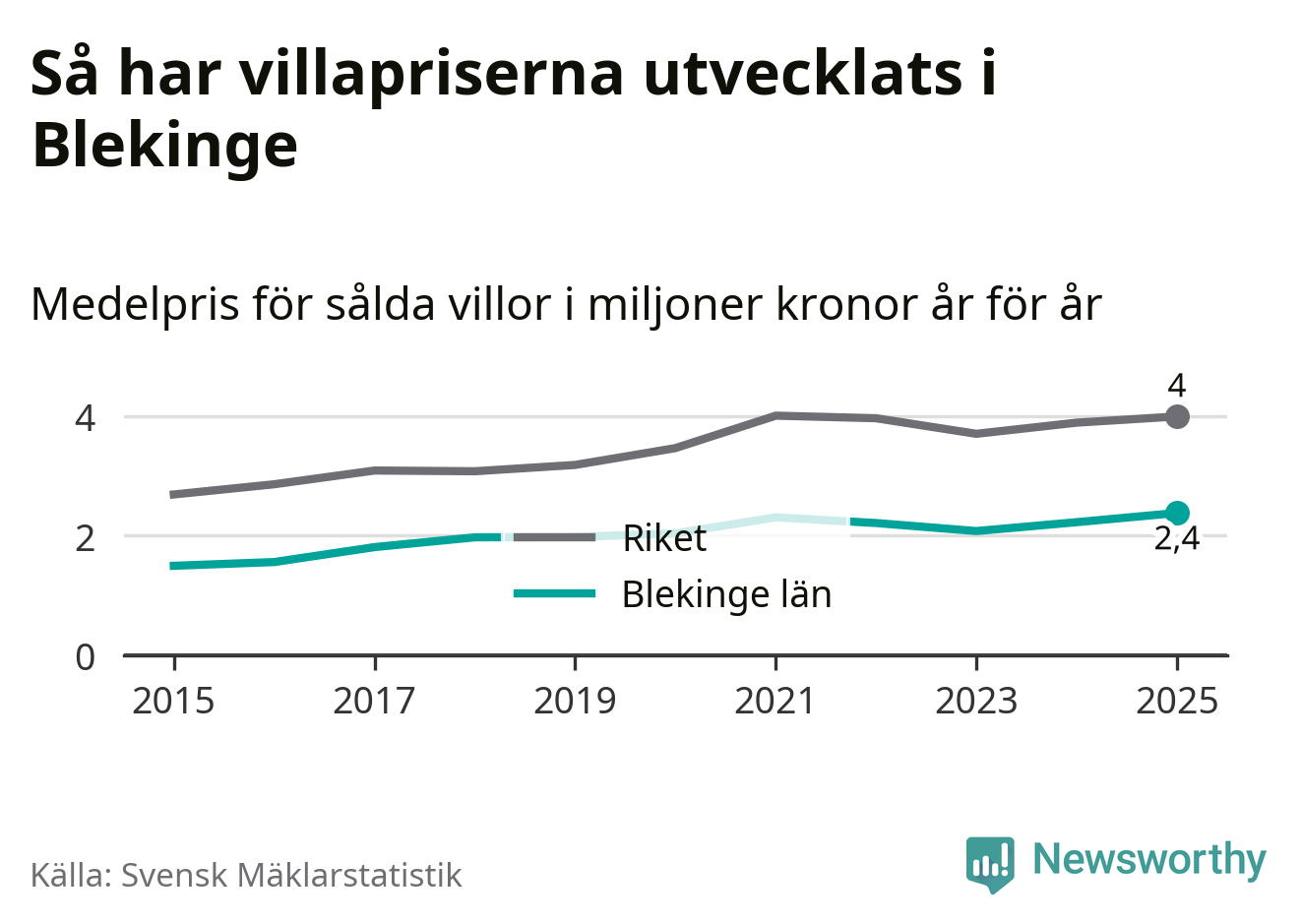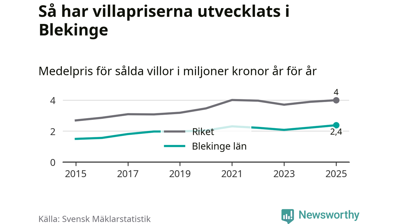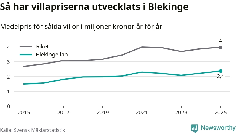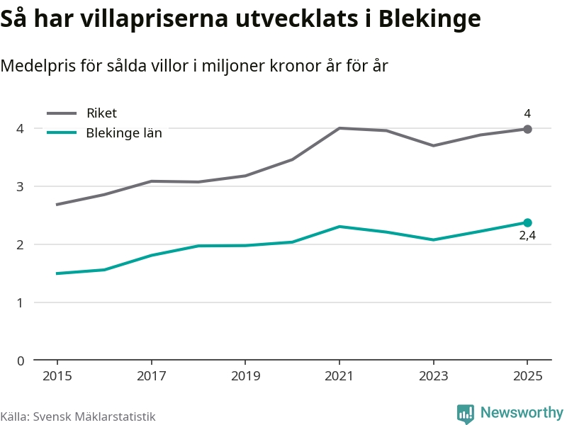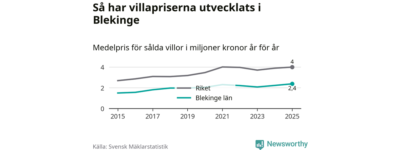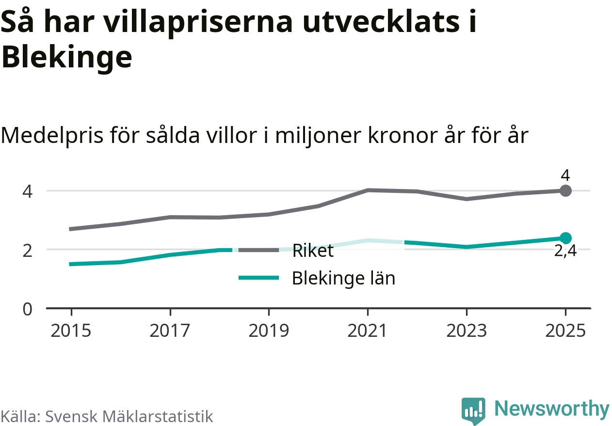 2,4 miljoner kronor är medelpriset för de villor som såldes i Blekinge län under året, eller 19 434 kronor per kvadratmeter. Det innebär en prisökning med sju procent på ett år. Det är det högsta årssnittet på åtminstone tio år.