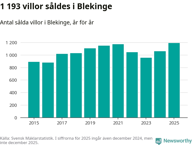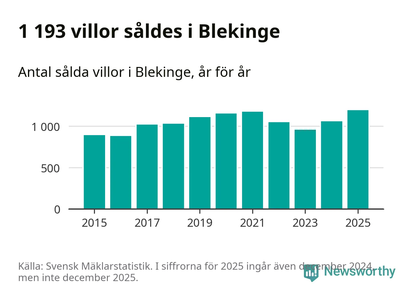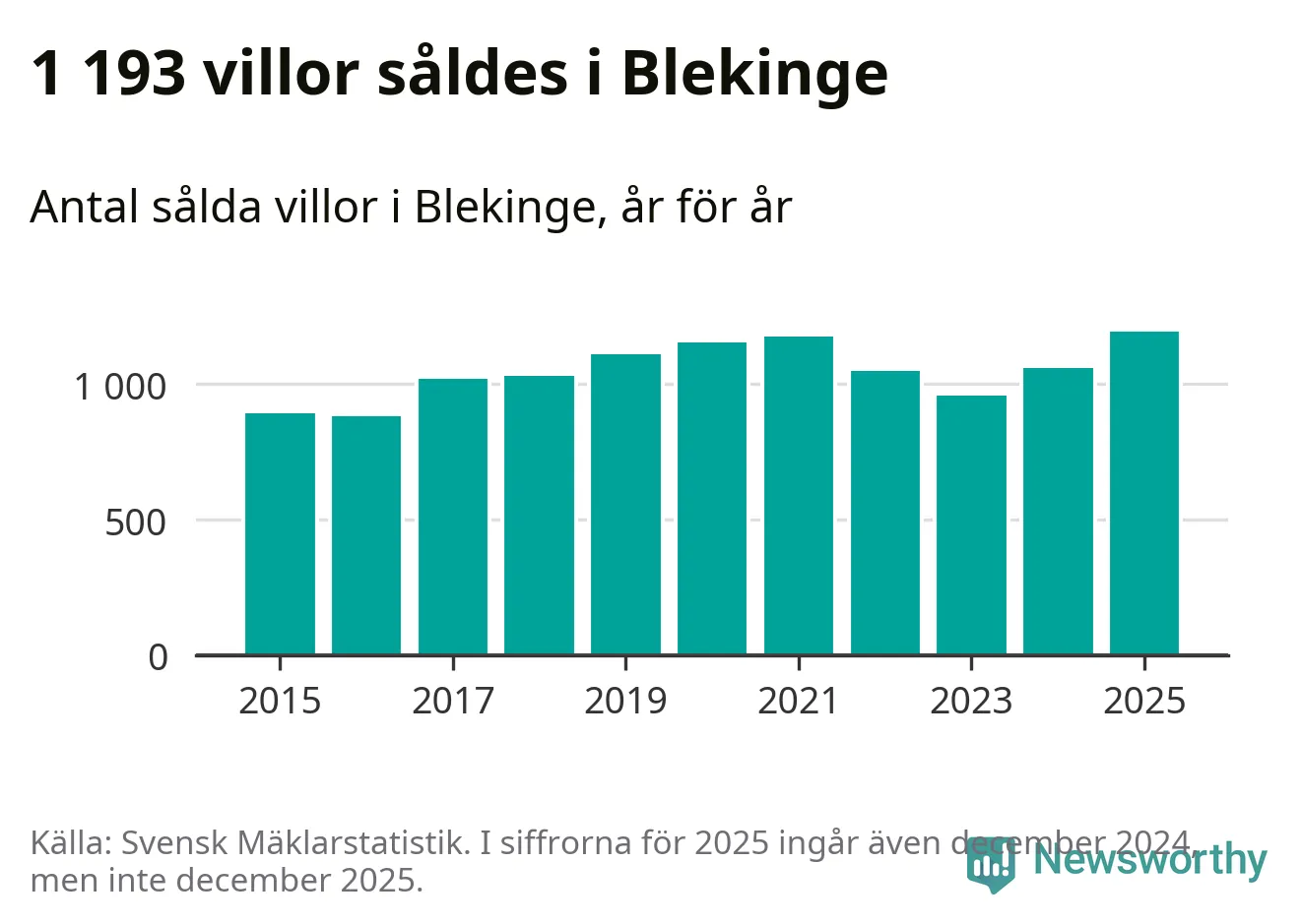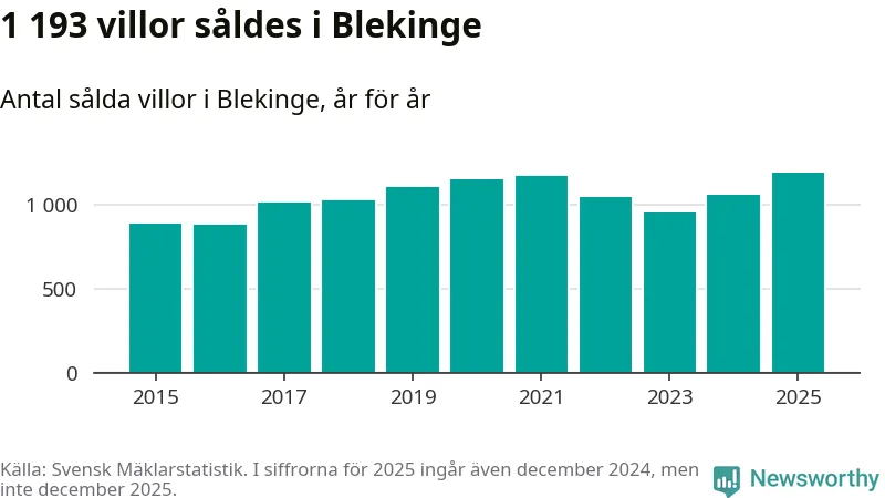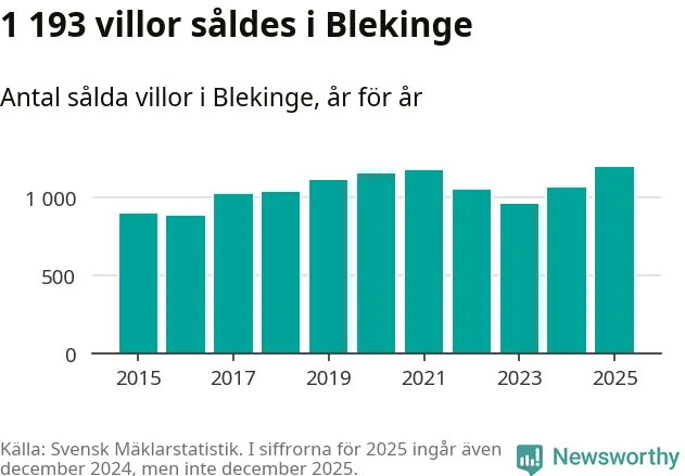 Antalet sålda villor ökade också. Totalt såldes 1 193 villor, att jämföra med 1 060 under 2024. Det är fler än något annat år sedan 2015.