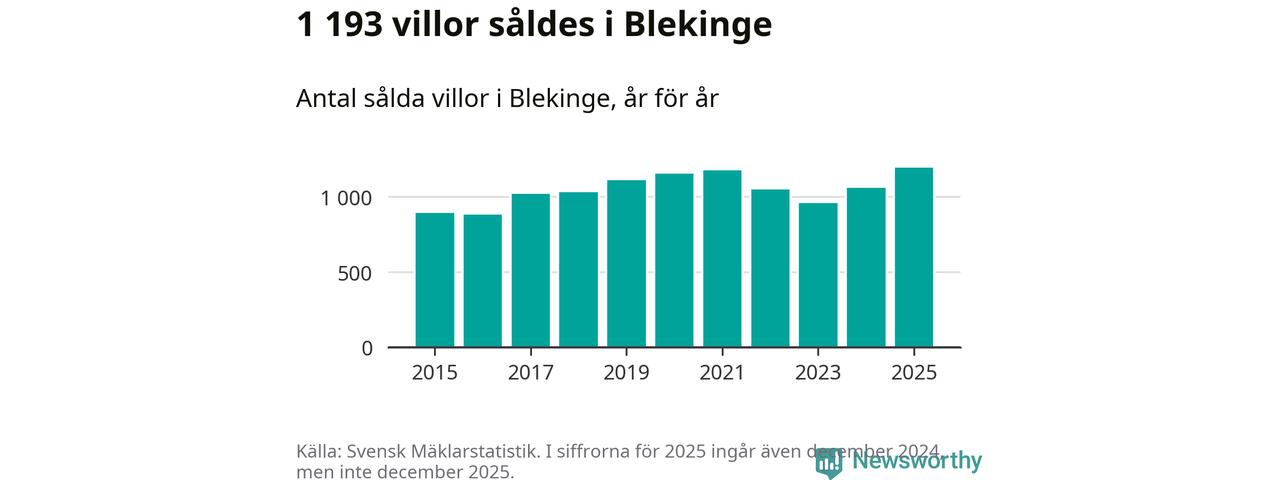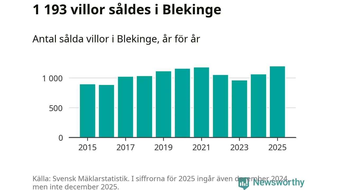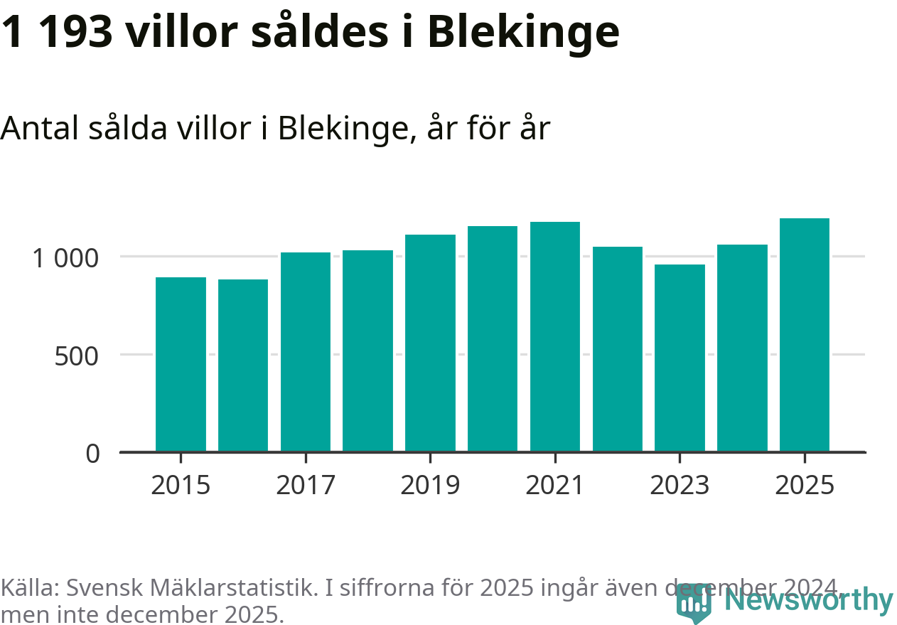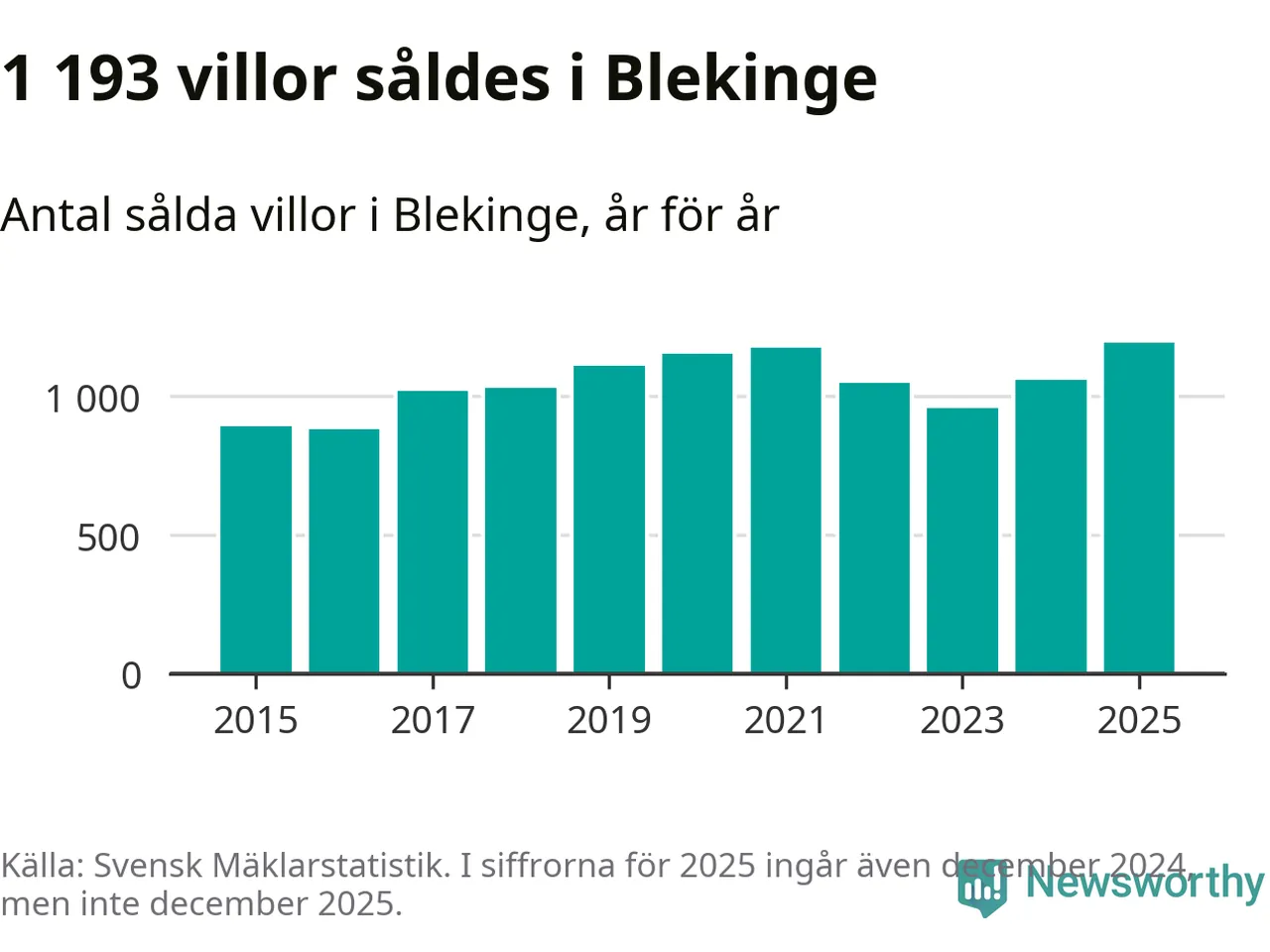 Antalet sålda villor ökade också. Totalt såldes 1 193 villor, att jämföra med 1 060 under 2024. Det är fler än något annat år sedan 2015.