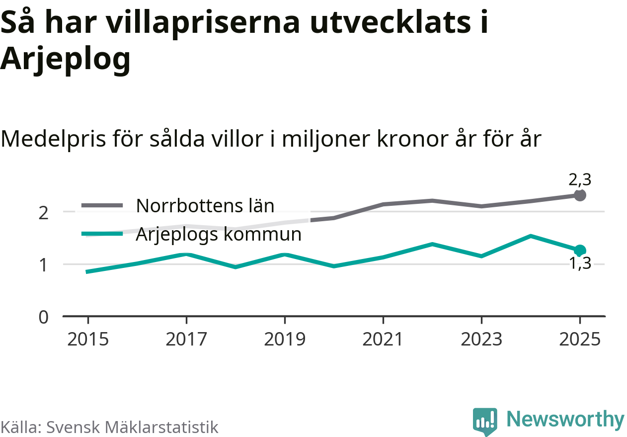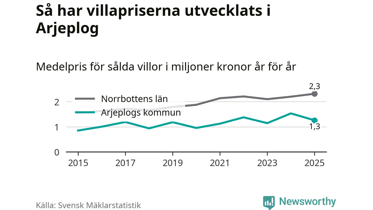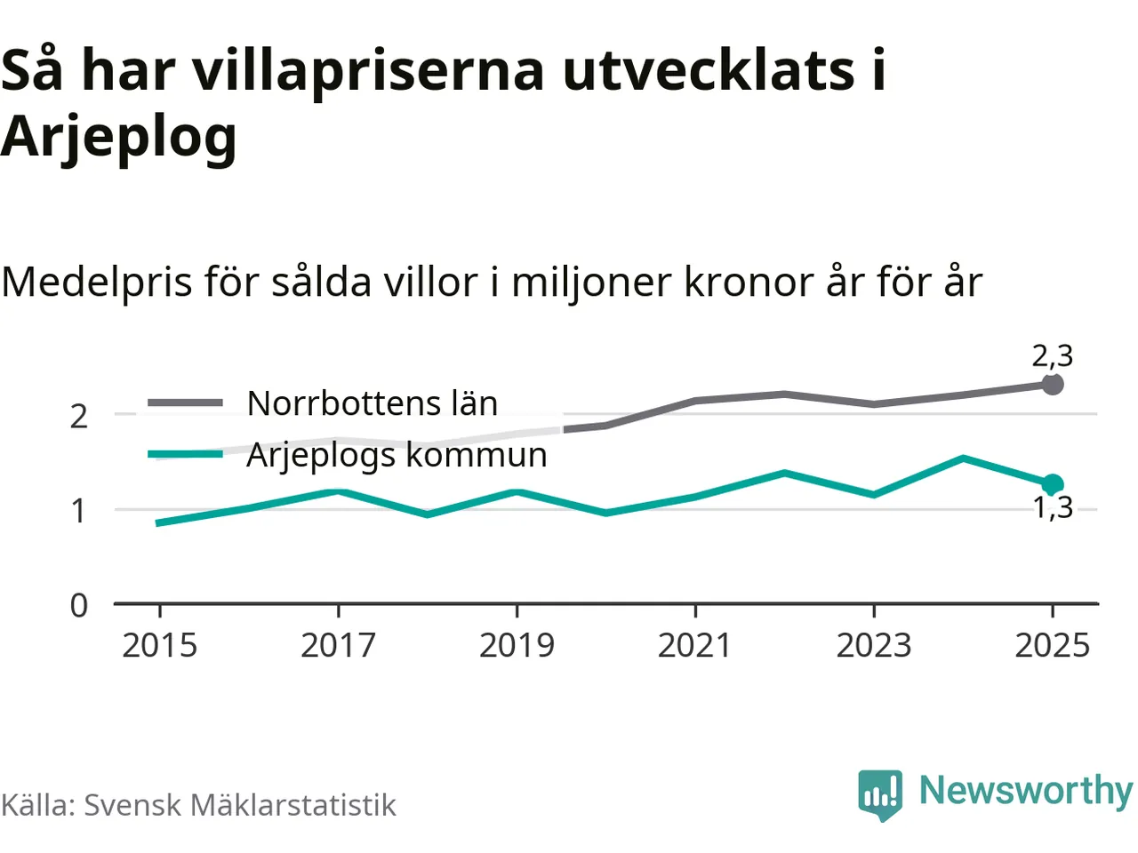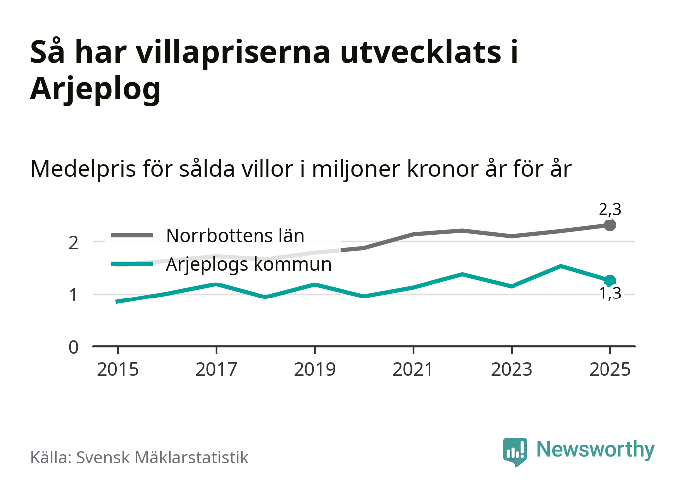 1,3 miljoner kronor är medelpriset för de villor som såldes i Arjeplogs kommun under året, eller 14 704 kronor per kvadratmeter. Det innebär en prisminskning med 18 procent på ett år.