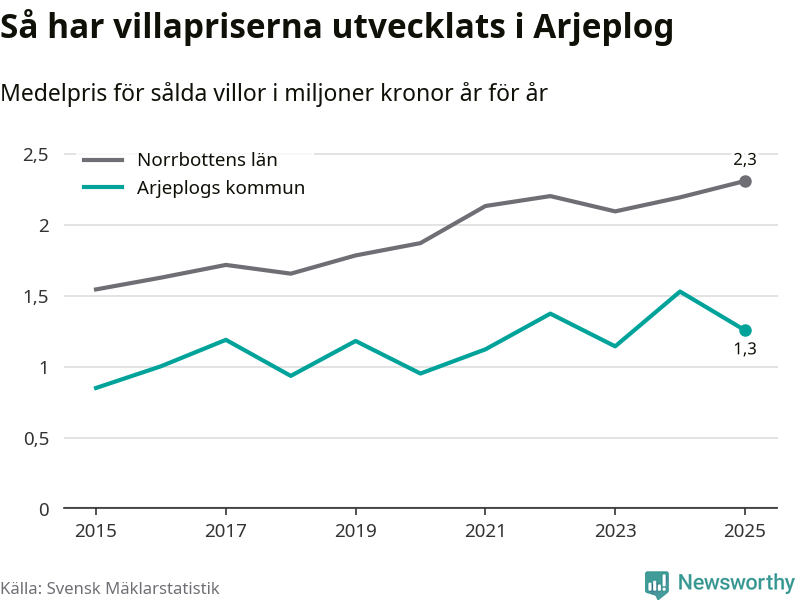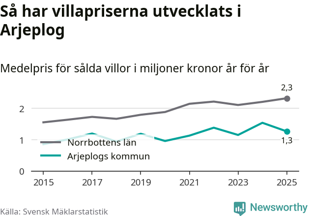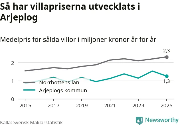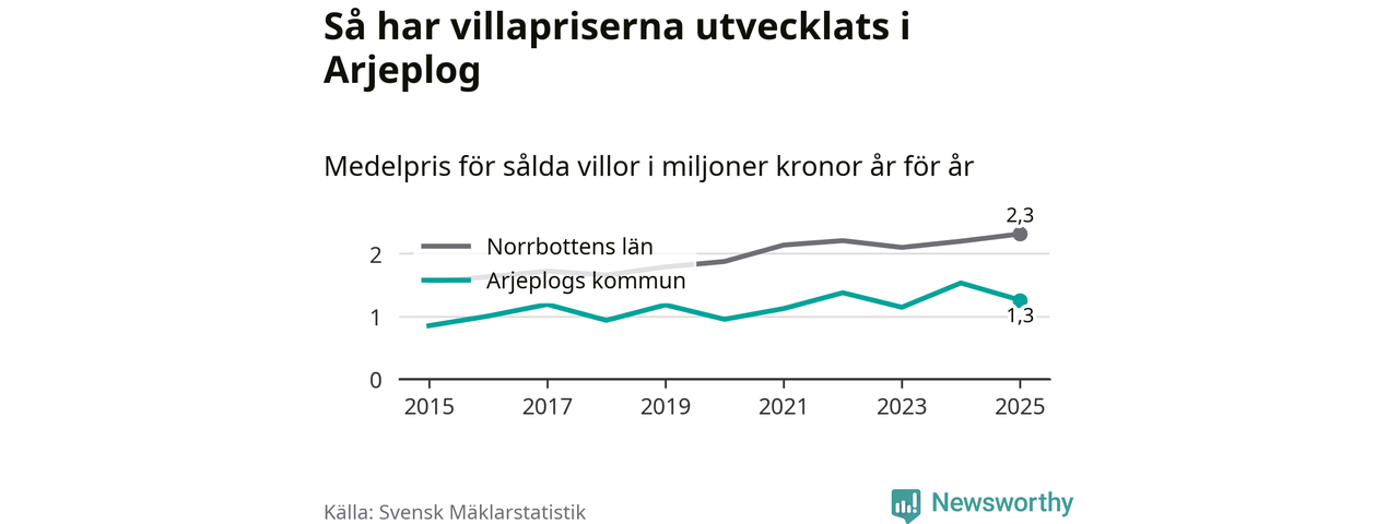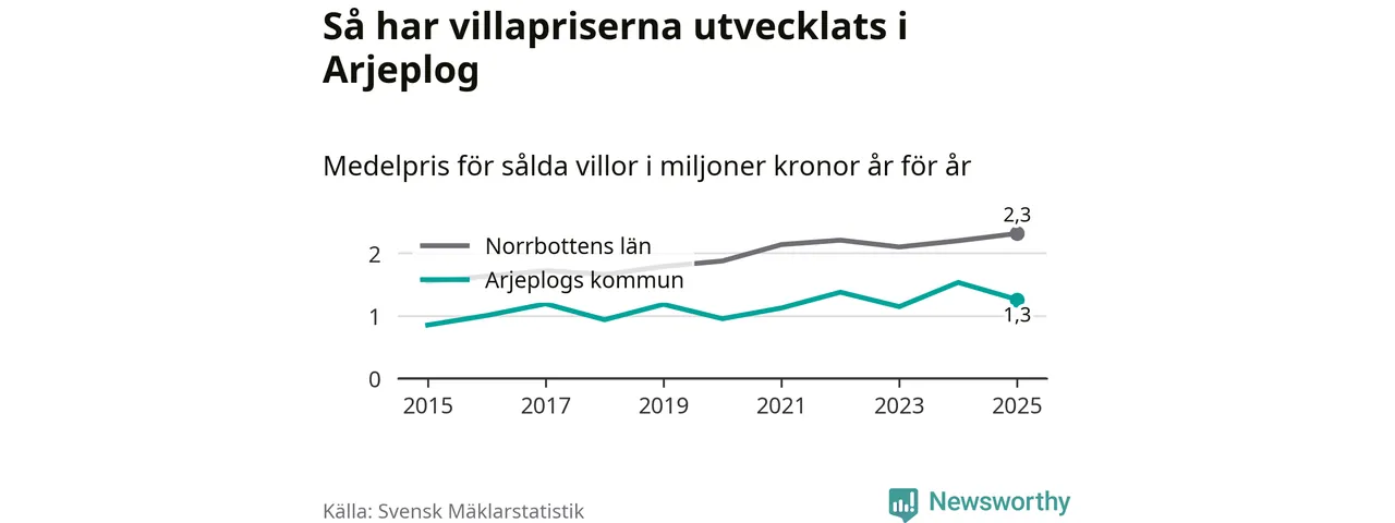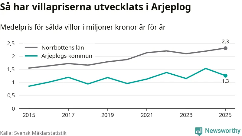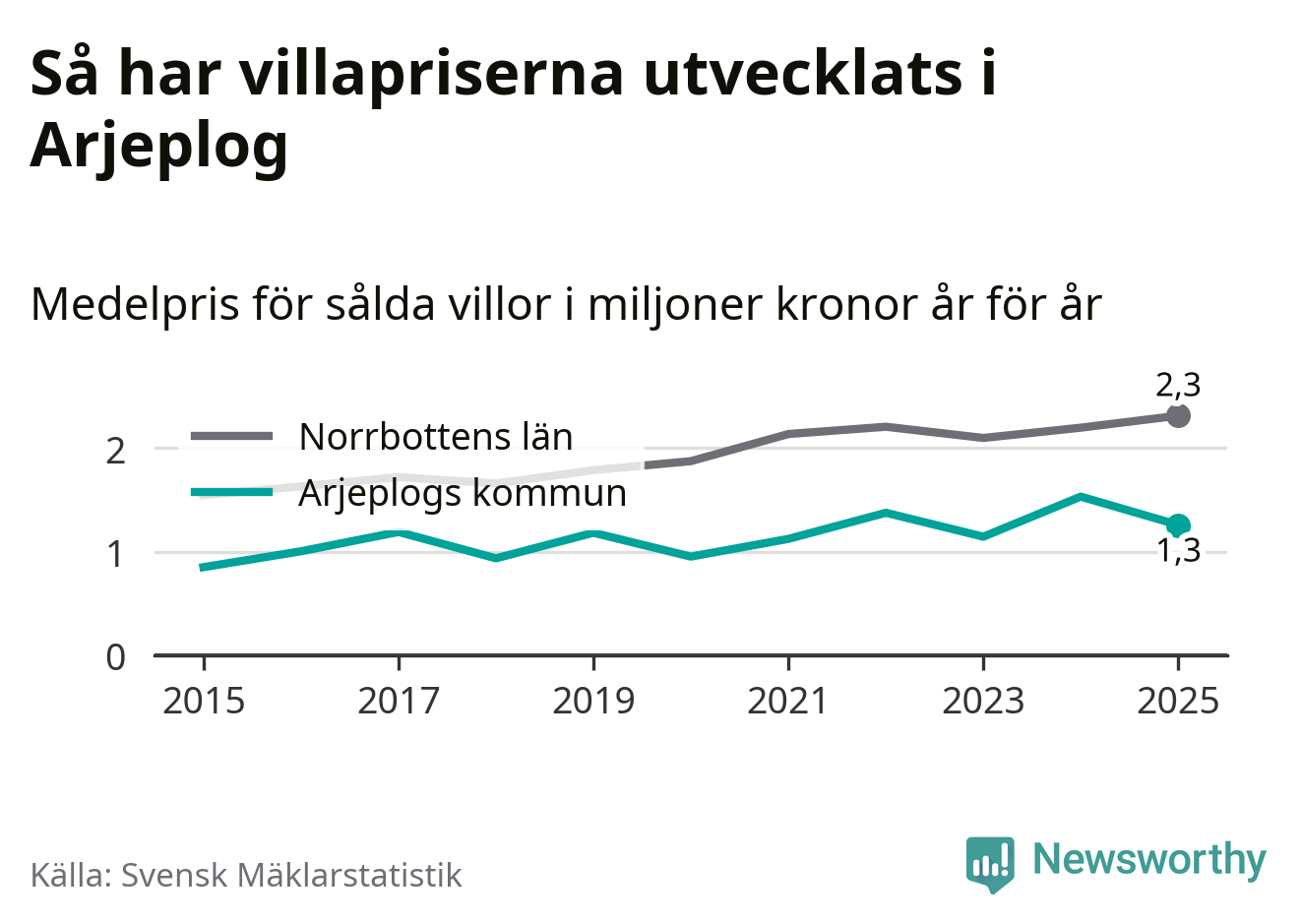 1,3 miljoner kronor är medelpriset för de villor som såldes i Arjeplogs kommun under året, eller 14 704 kronor per kvadratmeter. Det innebär en prisminskning med 18 procent på ett år.