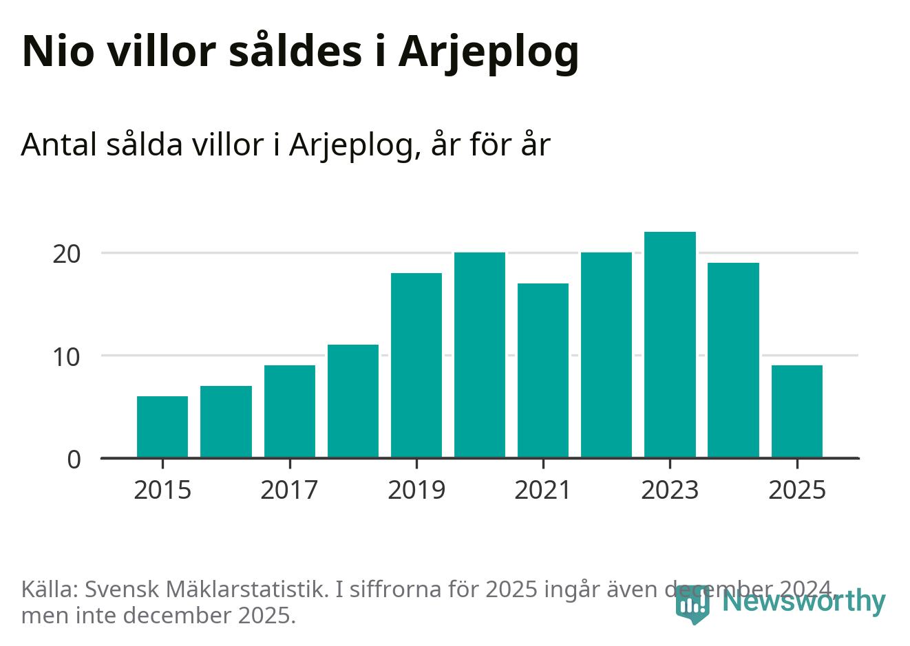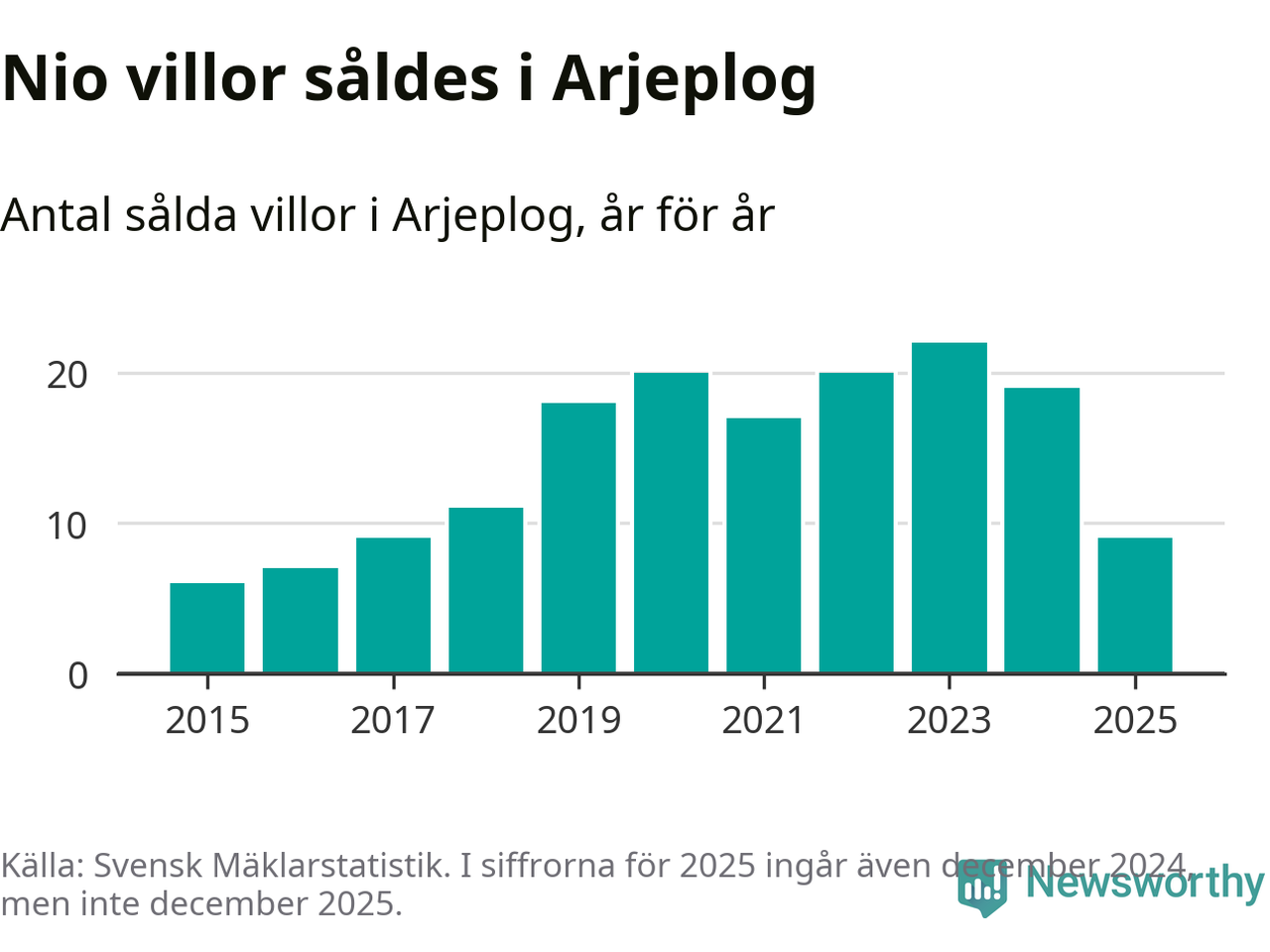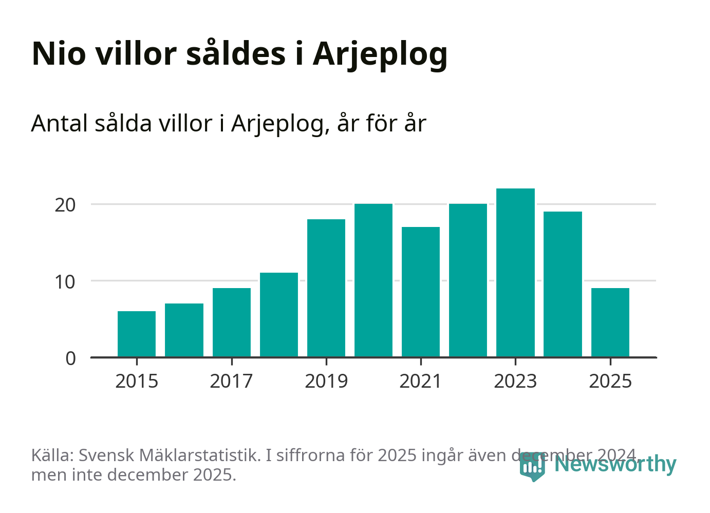 Antalet sålda villor minskade också. Totalt såldes nio villor, att jämföra med 19 under 2024. Det är andra året i rad som antalet sålda villor minskar i kommunen.