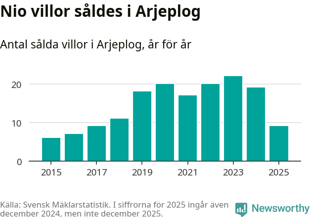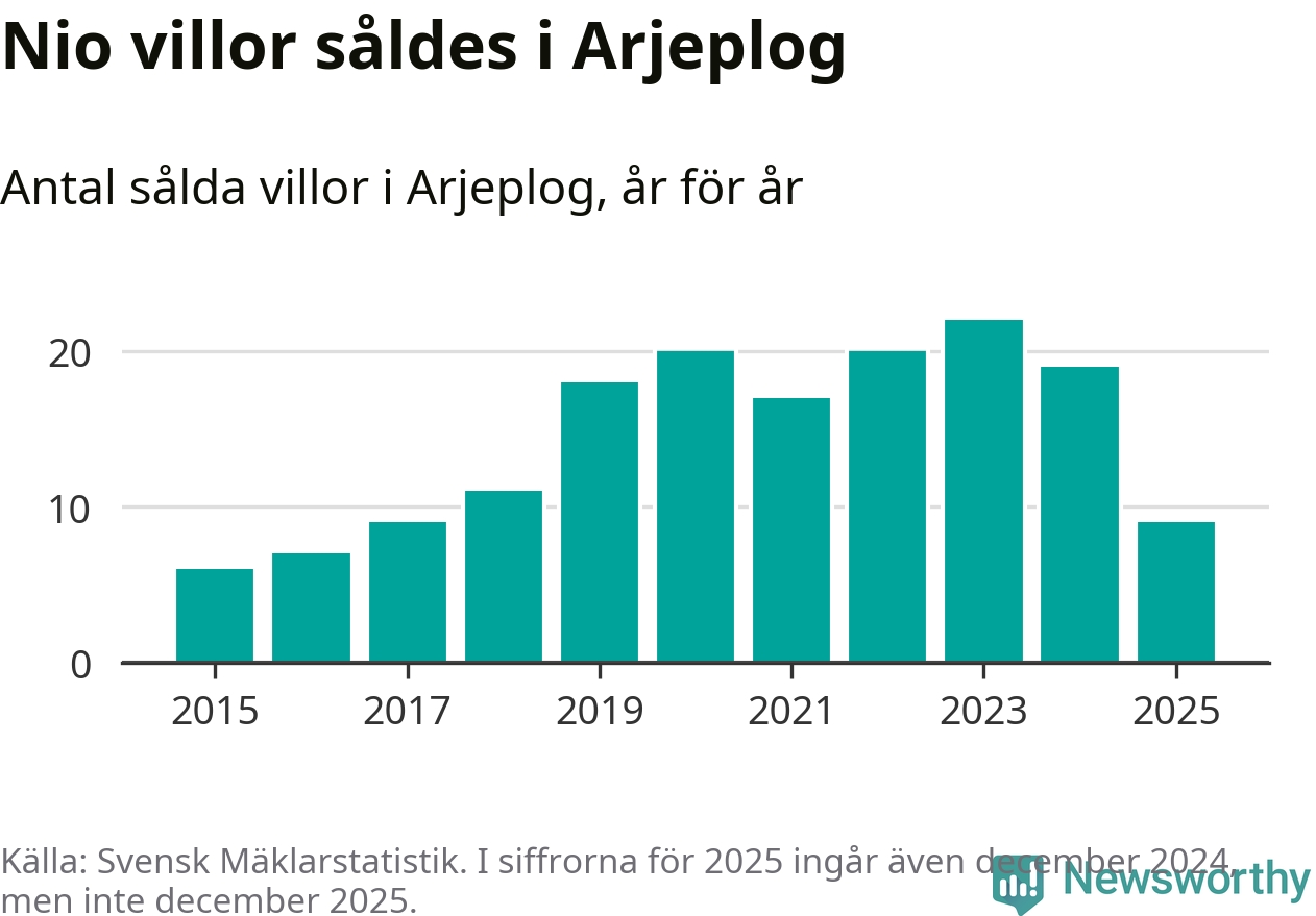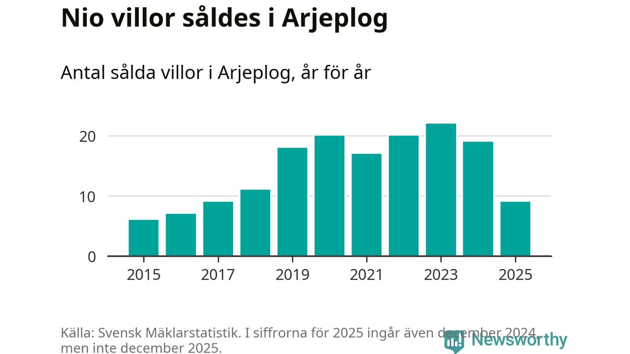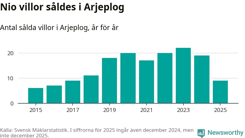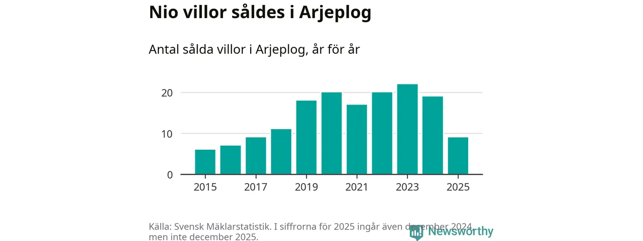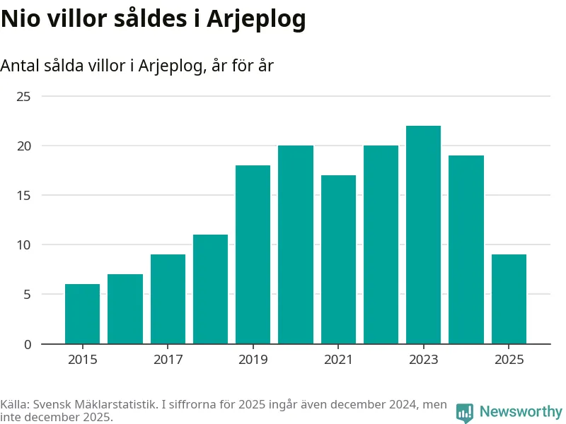 Antalet sålda villor minskade också. Totalt såldes nio villor, att jämföra med 19 under 2024. Det är andra året i rad som antalet sålda villor minskar i kommunen.