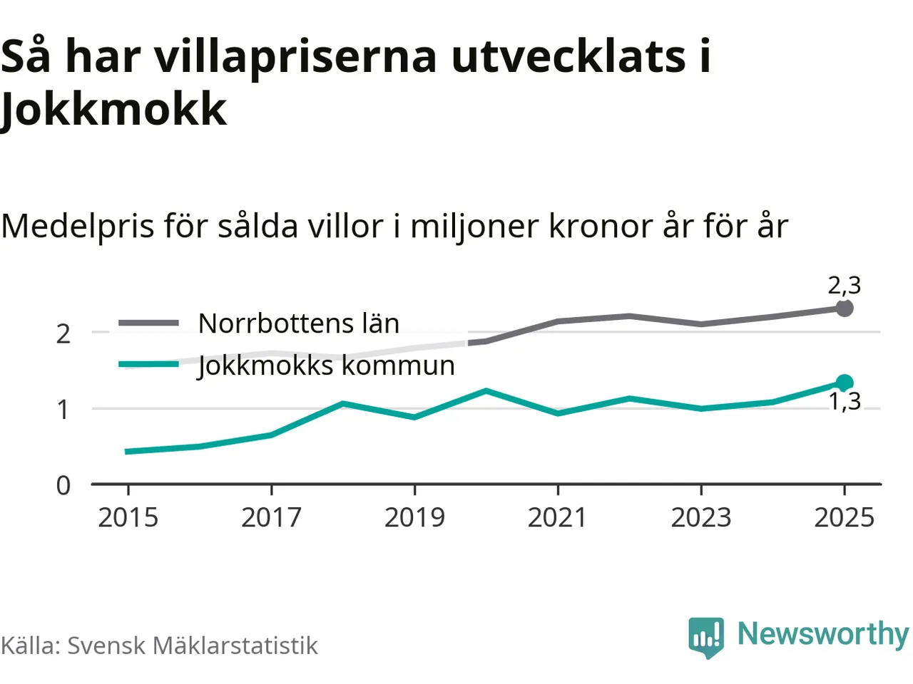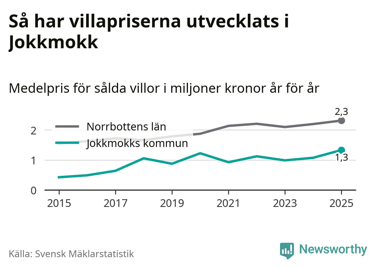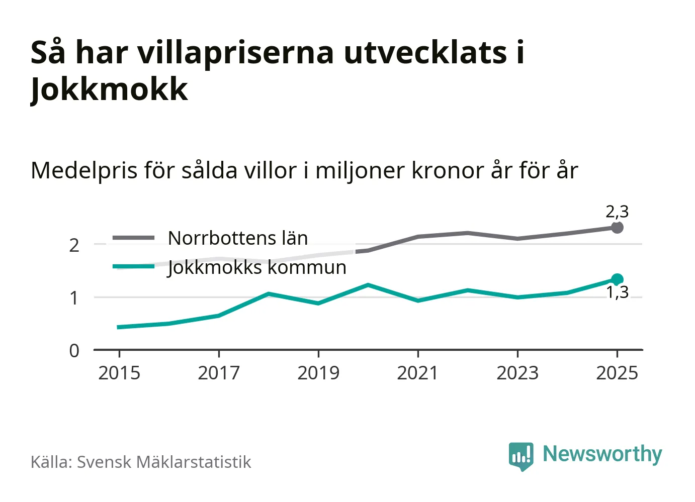 1,3 miljoner kronor är medelpriset för de villor som såldes i Jokkmokks kommun under året, eller 14 097 kronor per kvadratmeter. Det innebär en prisökning med 24 procent på ett år. Det är det högsta årssnittet på åtminstone tio år.