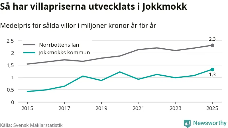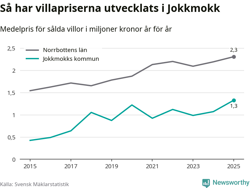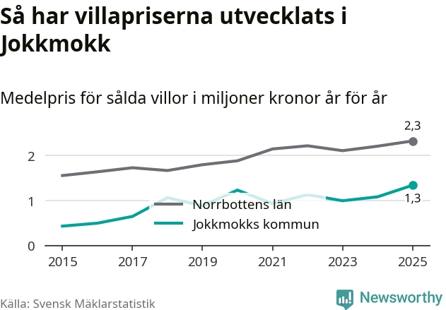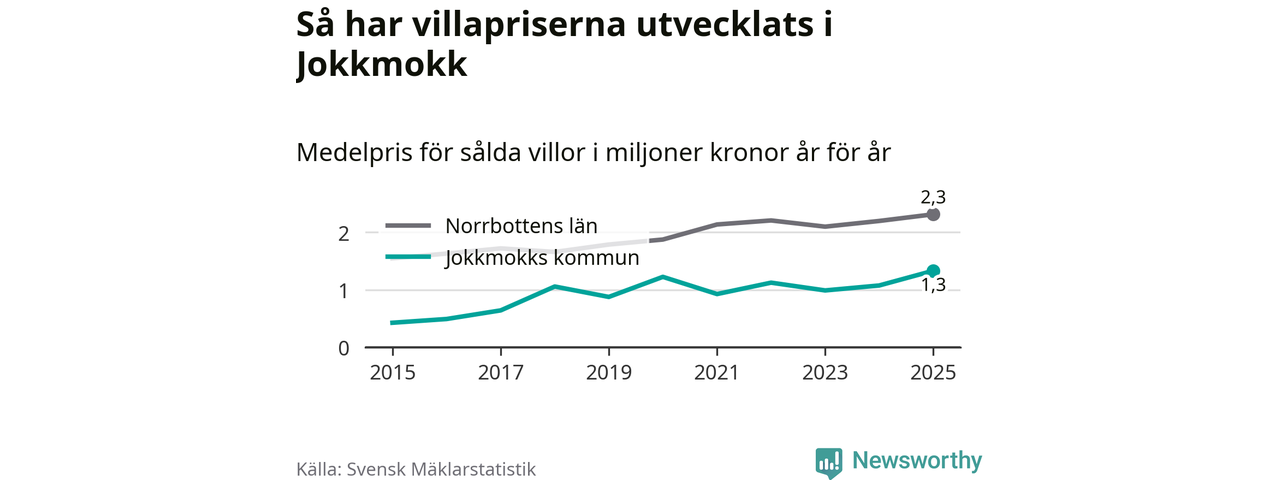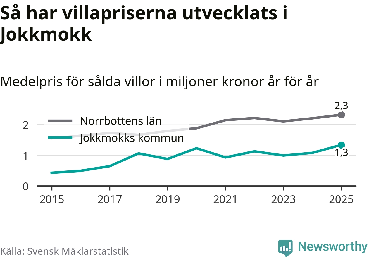 1,3 miljoner kronor är medelpriset för de villor som såldes i Jokkmokks kommun under året, eller 14 097 kronor per kvadratmeter. Det innebär en prisökning med 24 procent på ett år. Det är det högsta årssnittet på åtminstone tio år.