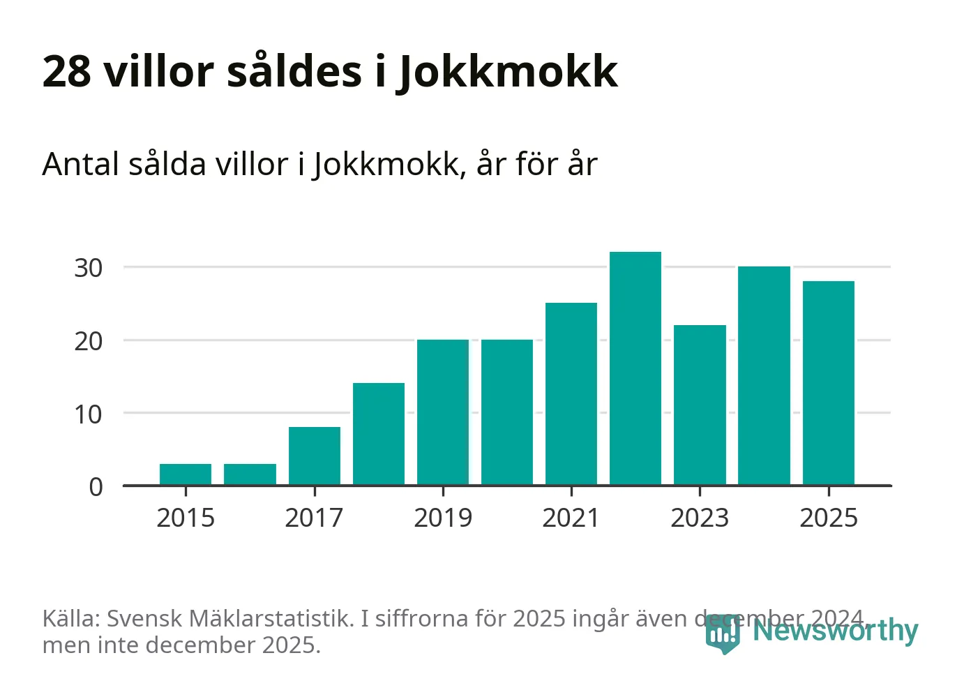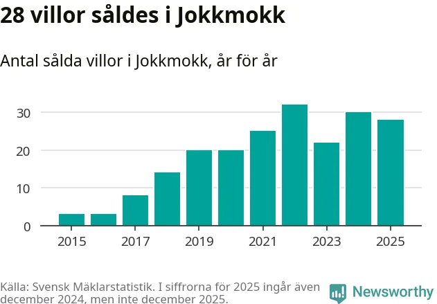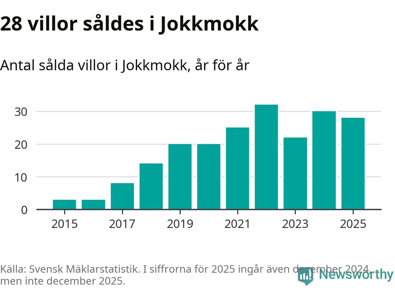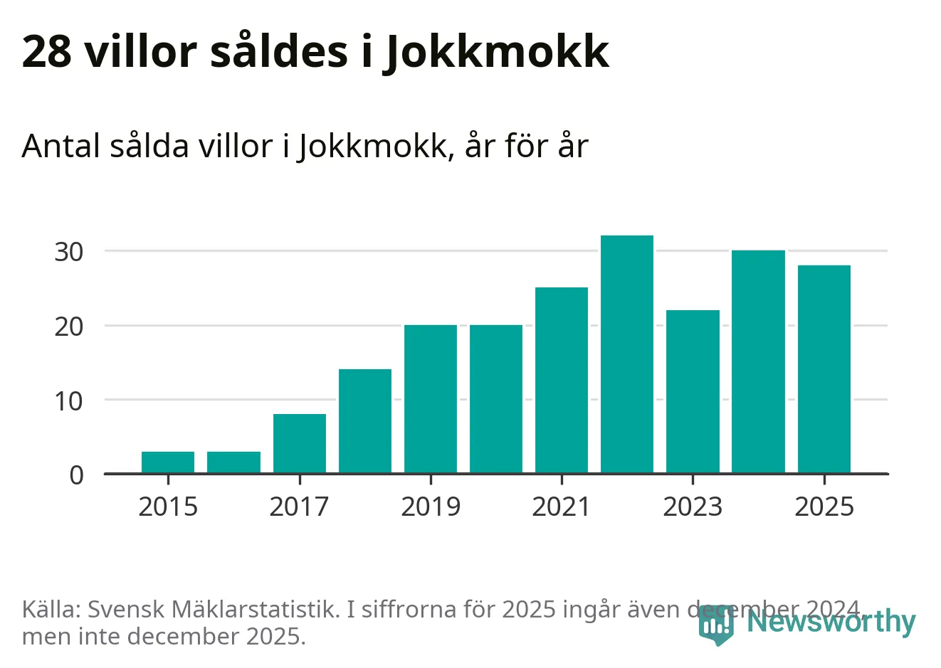 Däremot minskade antalet sålda villor något. Totalt såldes 28 villor, att jämföra med 30 under 2024.