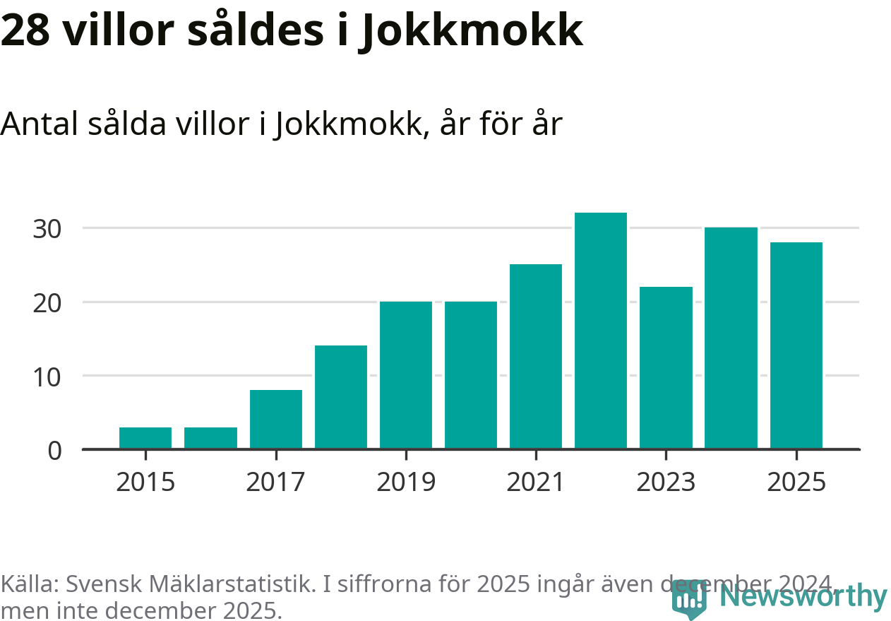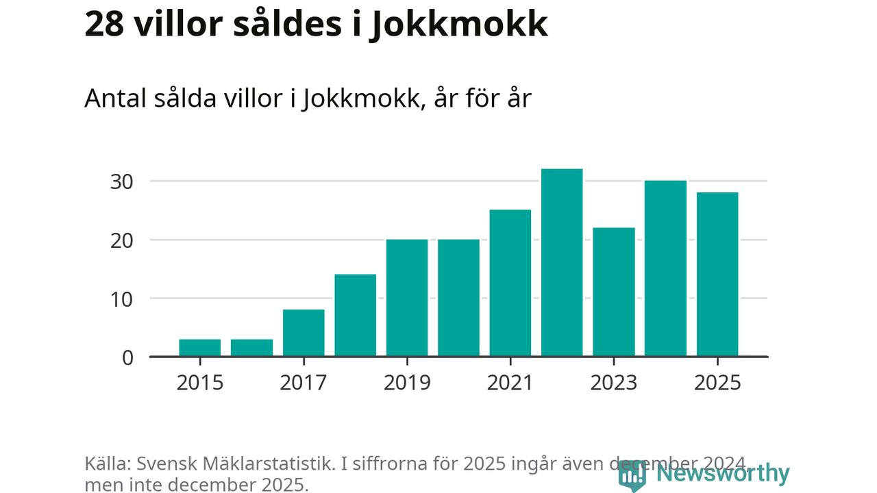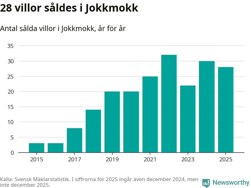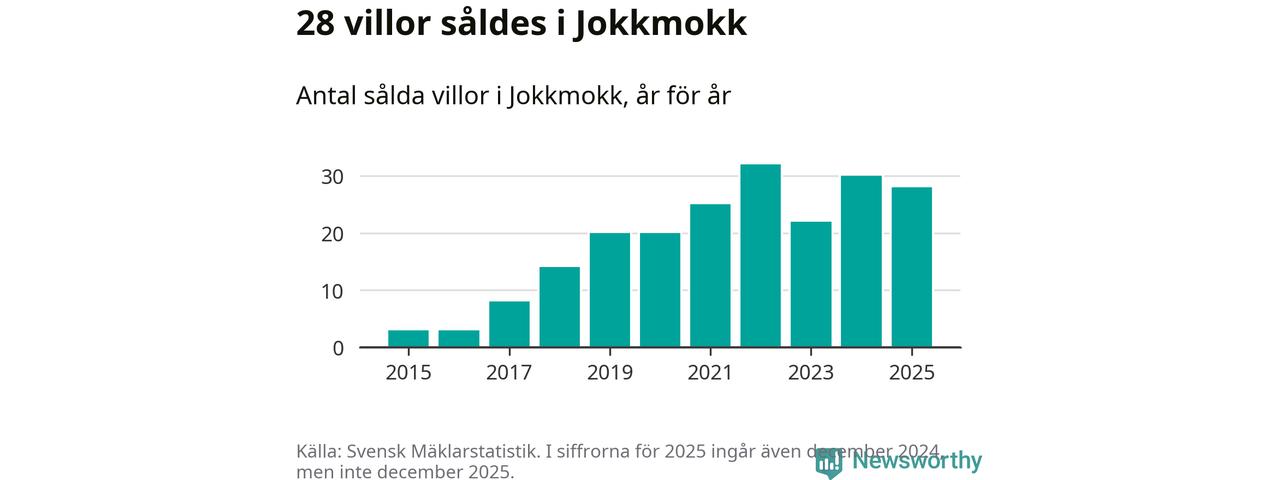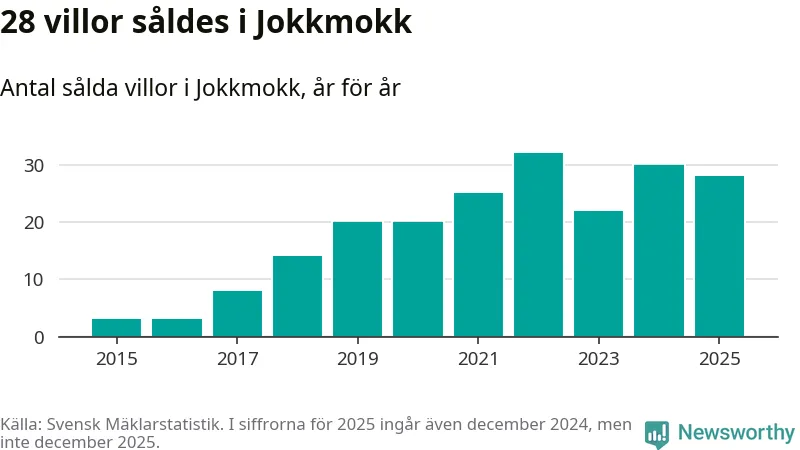 Däremot minskade antalet sålda villor något. Totalt såldes 28 villor, att jämföra med 30 under 2024.