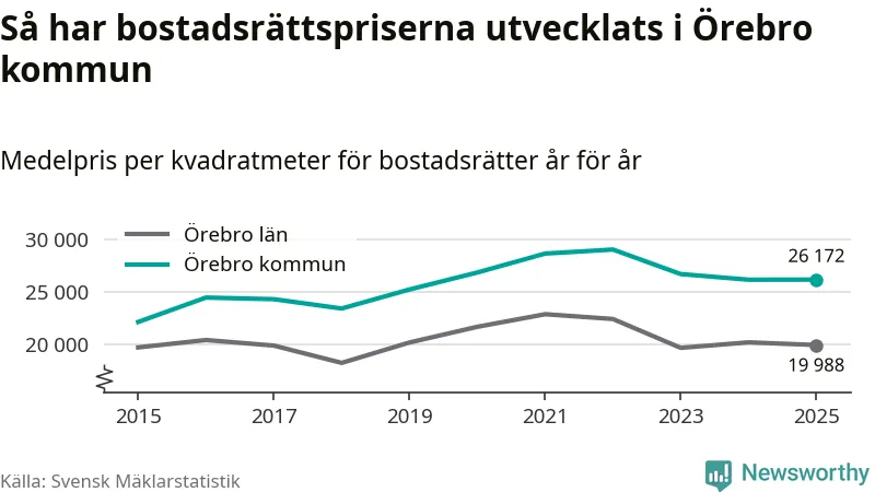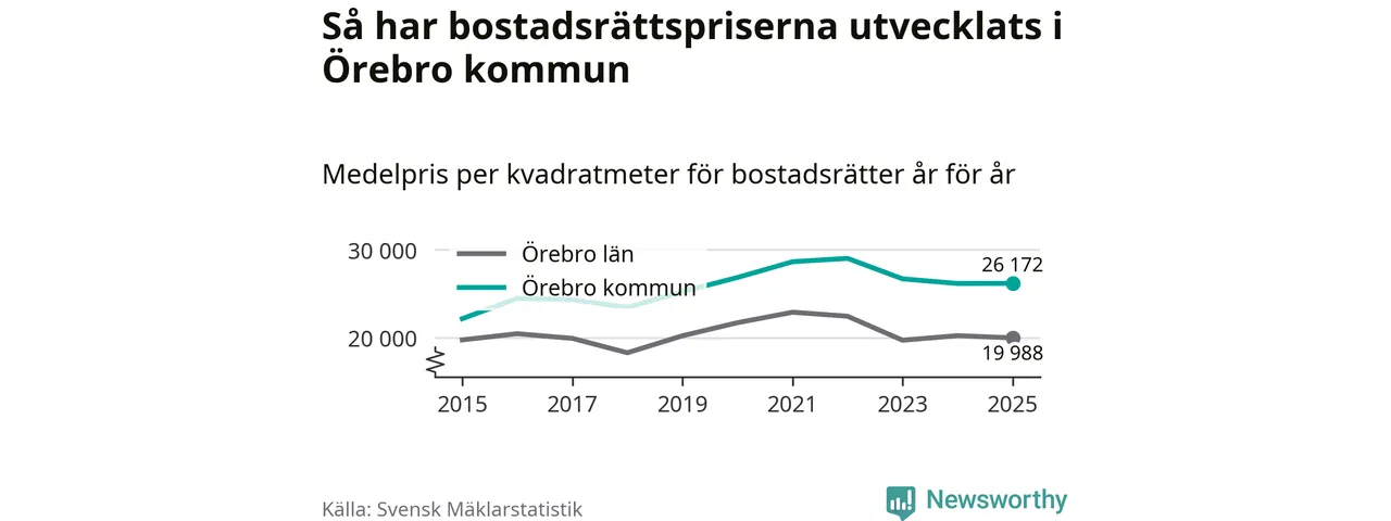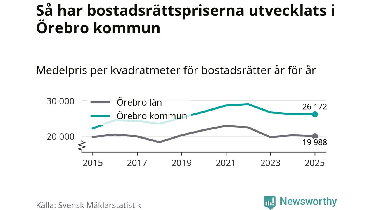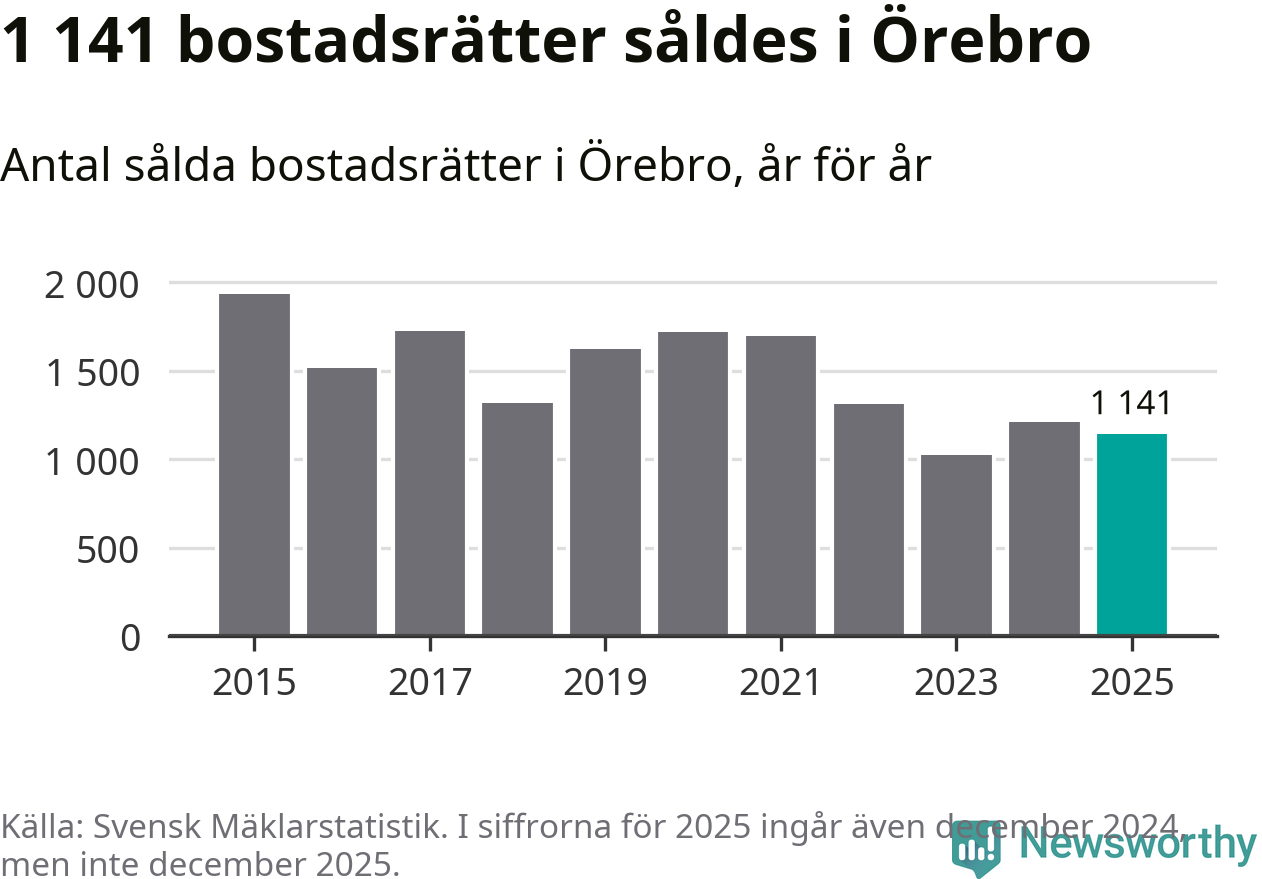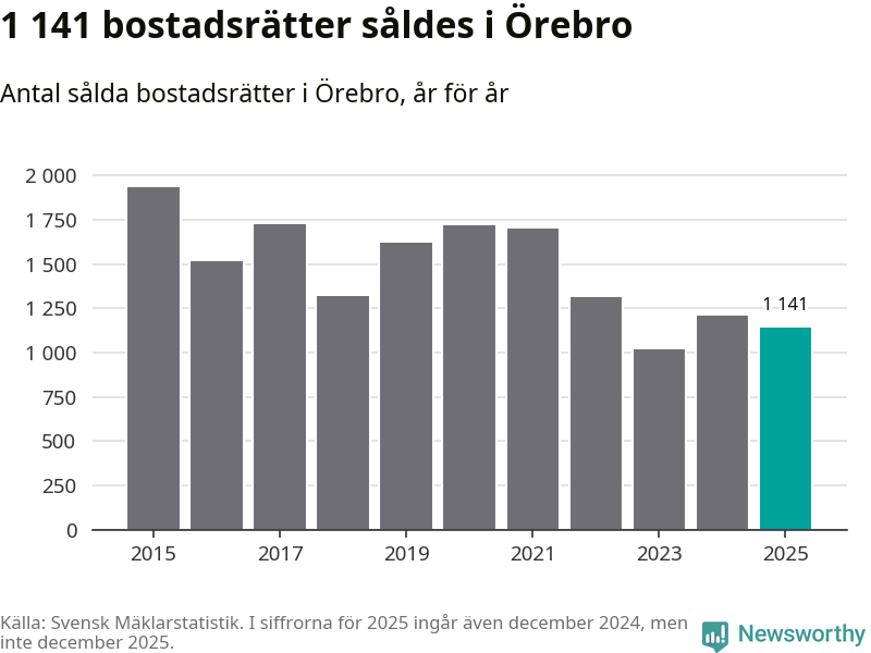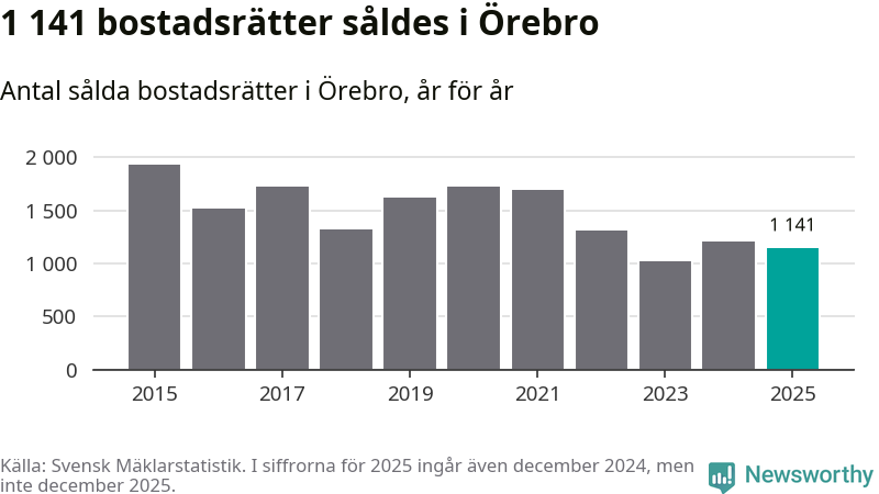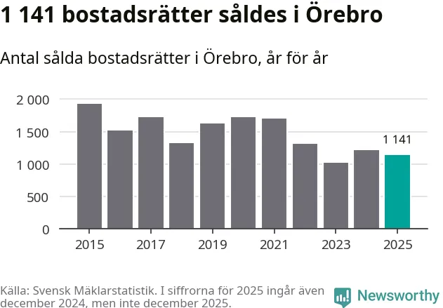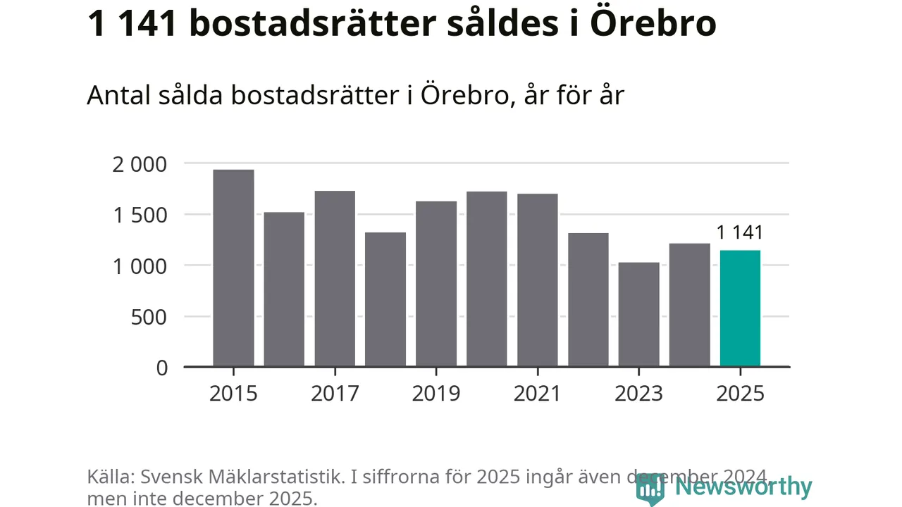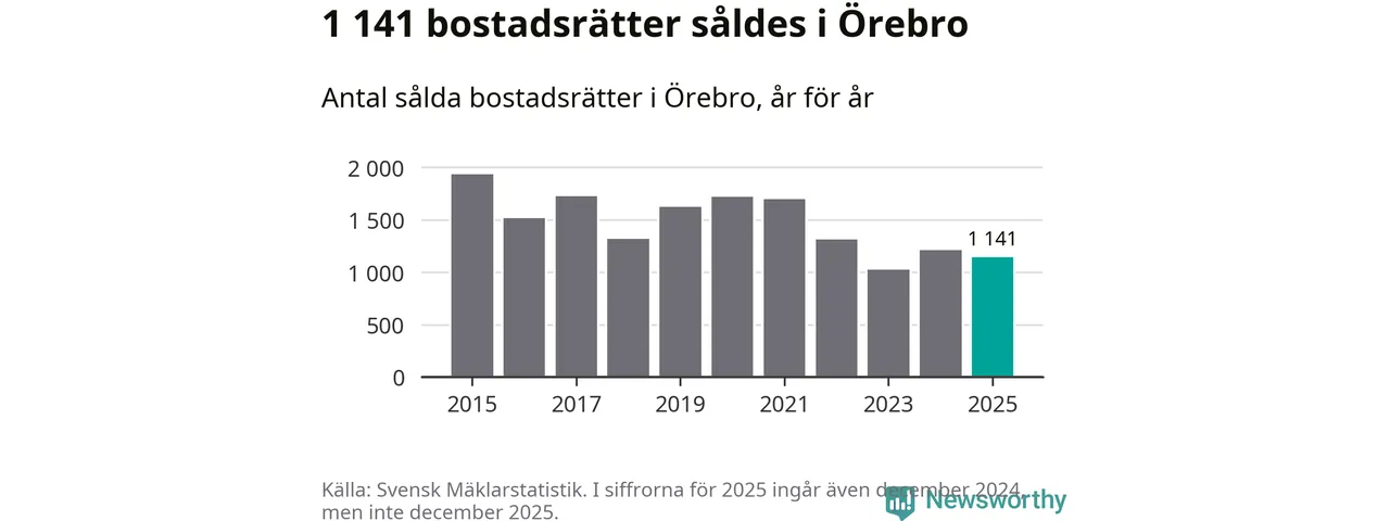 Det såldes totalt 1 141 bostadsrätter i Örebro kommun under året. Genomsnittspriset per kvadratmeter landade på 26 172 kronor, vilket är ungefär samma nivå som förra året.