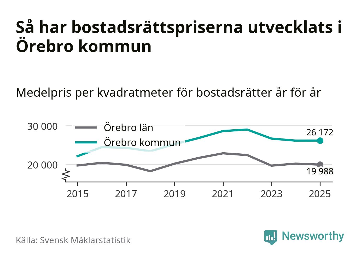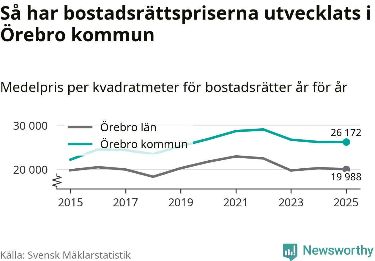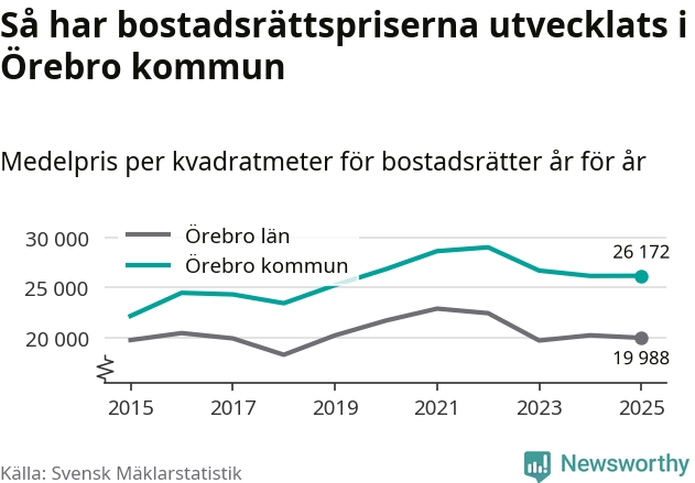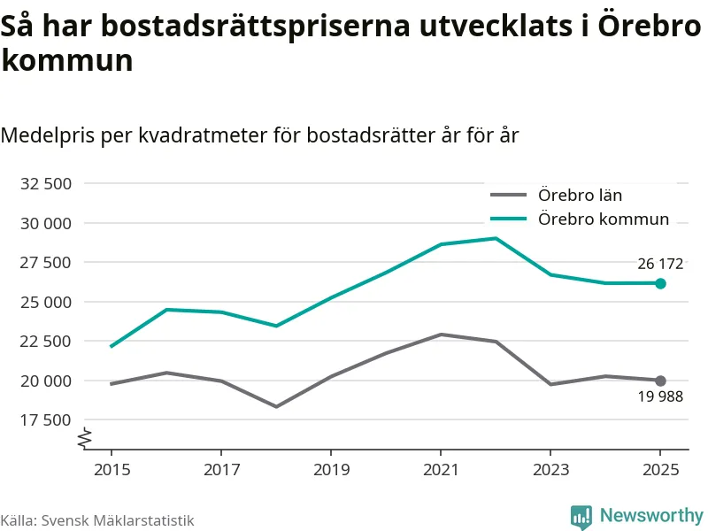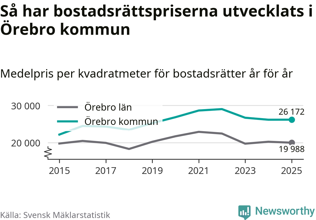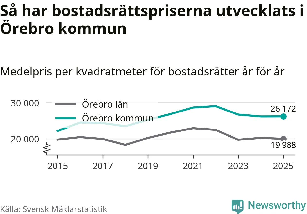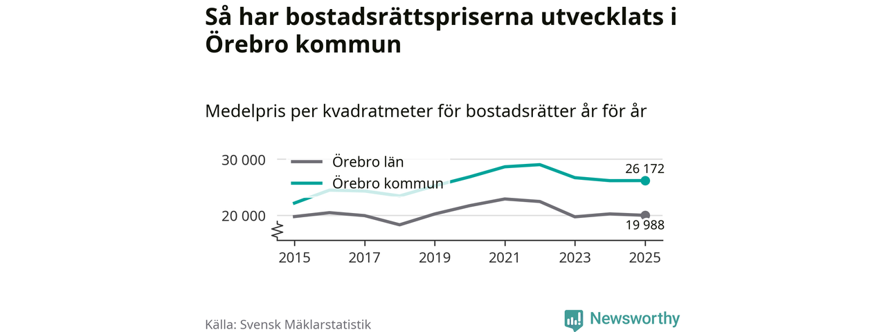 Det såldes totalt 1 141 bostadsrätter i Örebro kommun under året. Genomsnittspriset per kvadratmeter landade på 26 172 kronor, vilket är ungefär samma nivå som förra året.