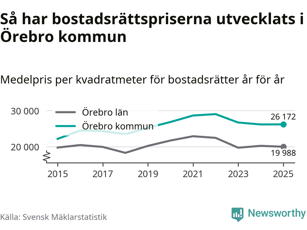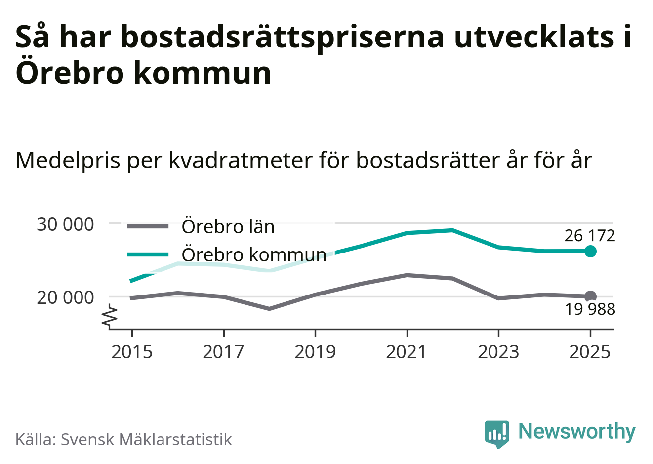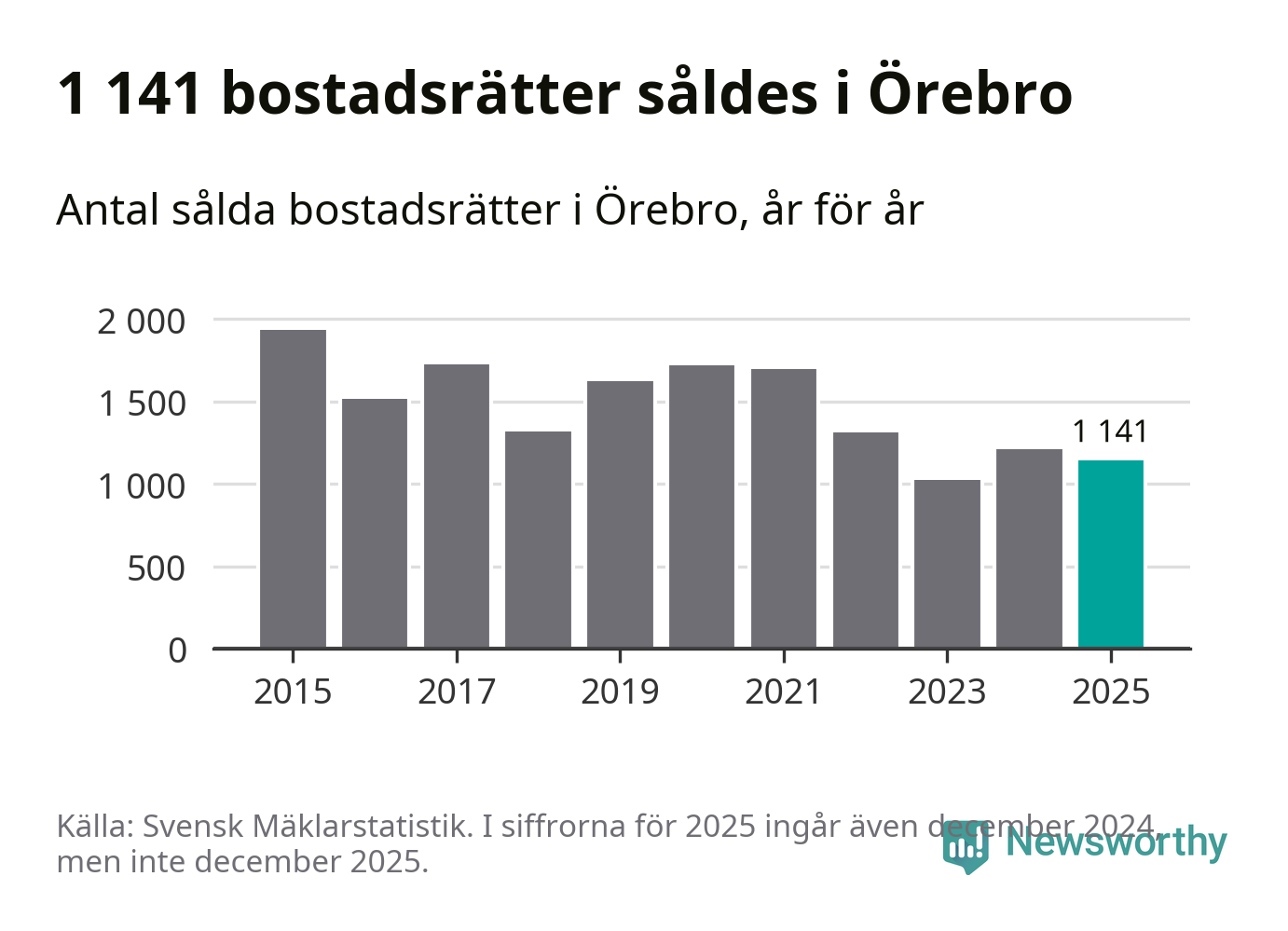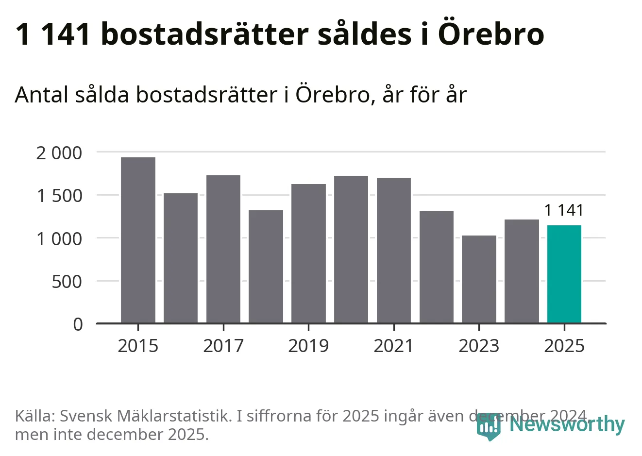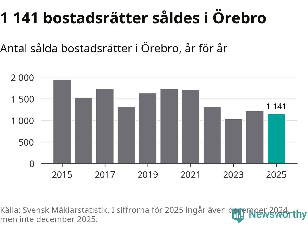 Det såldes totalt 1 141 bostadsrätter i Örebro kommun under året. Genomsnittspriset per kvadratmeter landade på 26 172 kronor, vilket är ungefär samma nivå som förra året.
