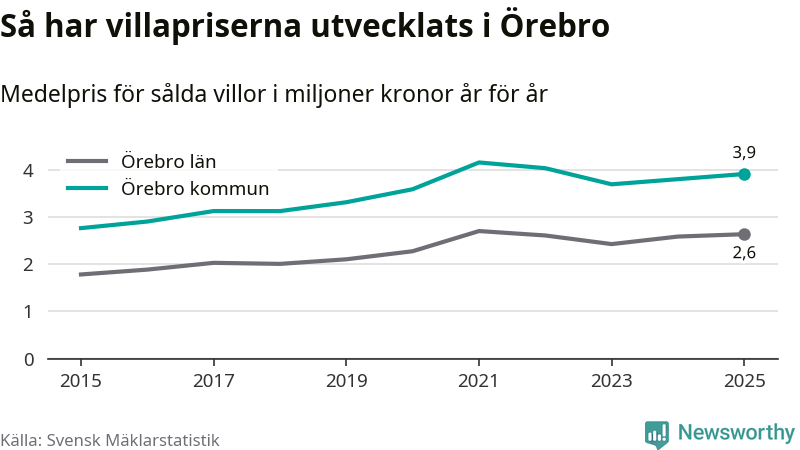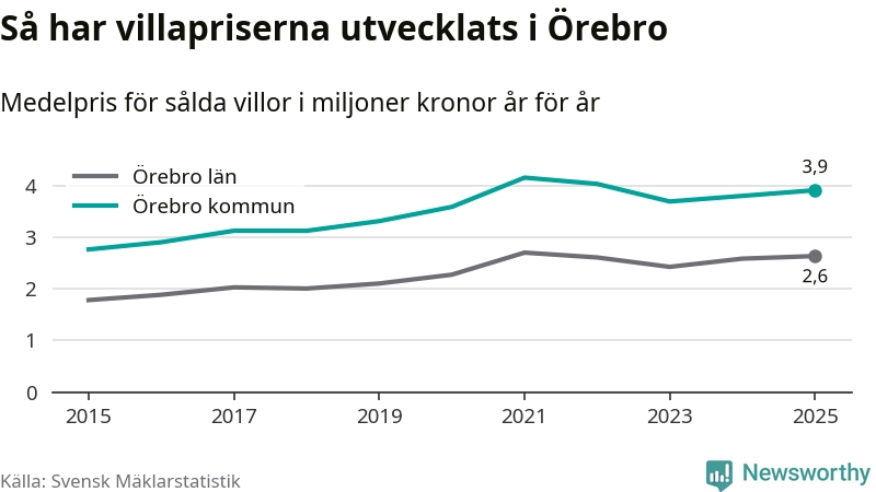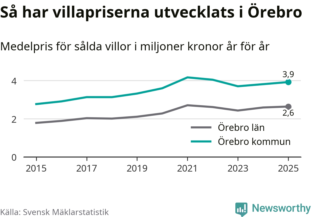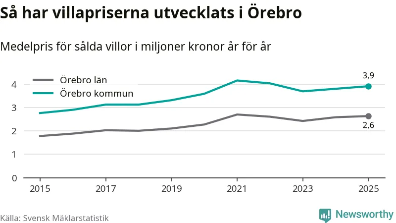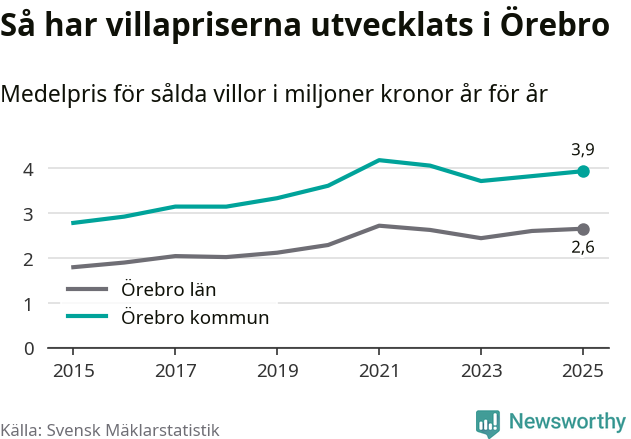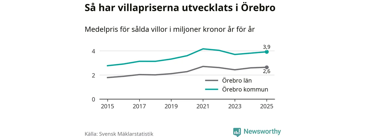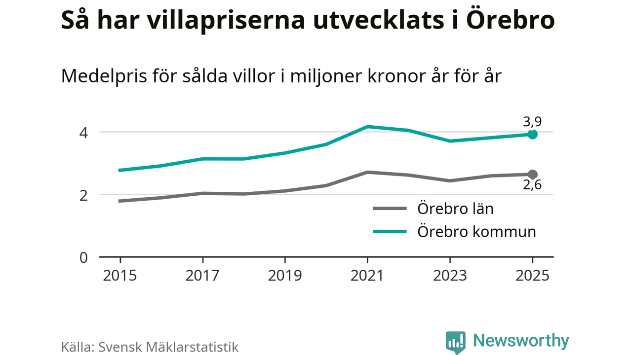 3,9 miljoner kronor är medelpriset för de villor som såldes i Örebro kommun under året, eller 30 004 kronor per kvadratmeter. Det innebär en prisökning med tre procent på ett år och är andra året i rad som priserna ökar i kommunen.