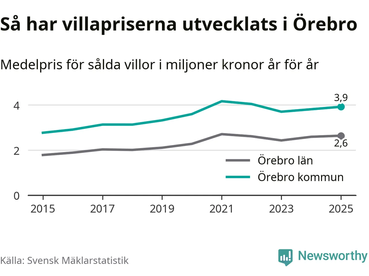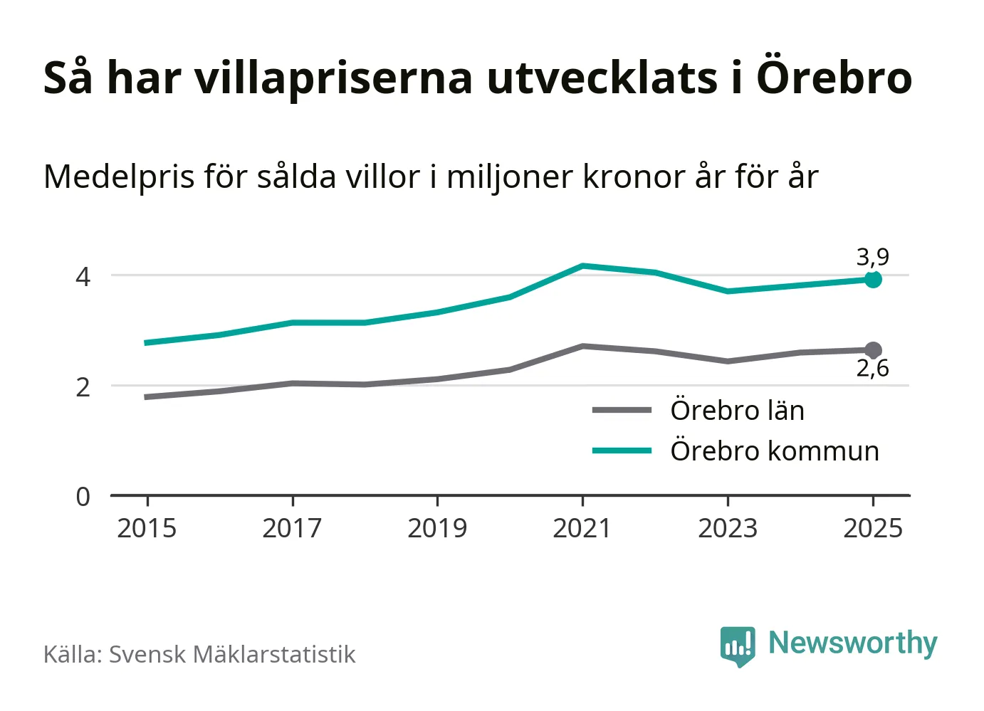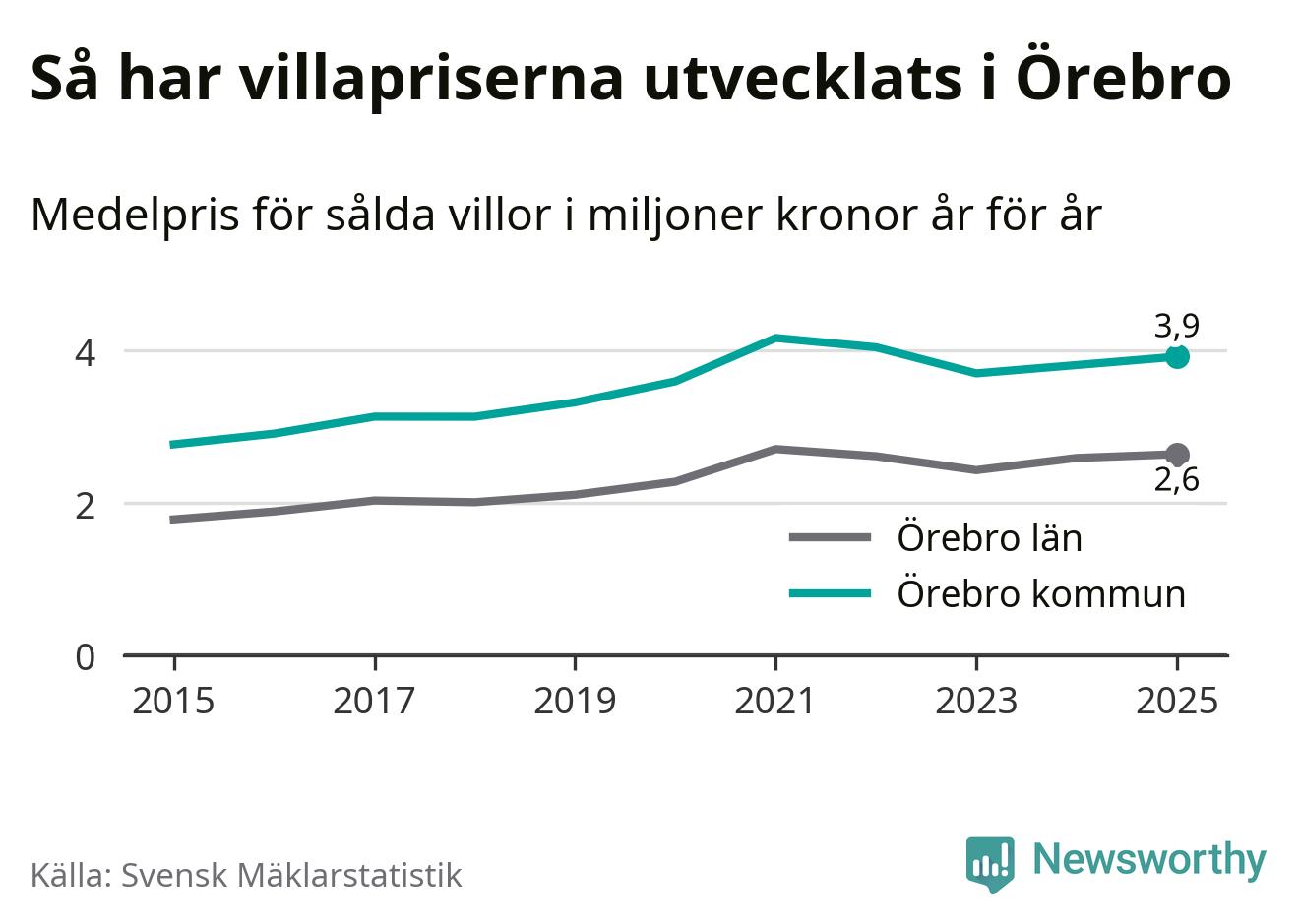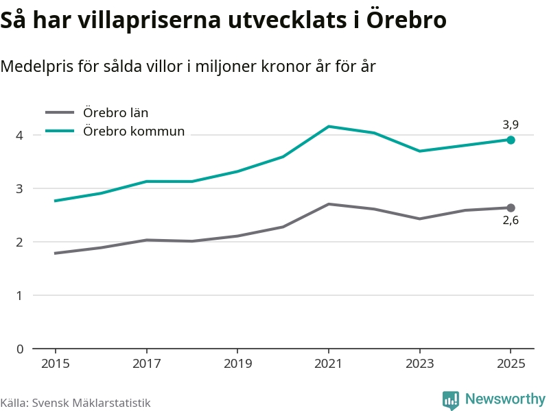 3,9 miljoner kronor är medelpriset för de villor som såldes i Örebro kommun under året, eller 30 004 kronor per kvadratmeter. Det innebär en prisökning med tre procent på ett år och är andra året i rad som priserna ökar i kommunen.