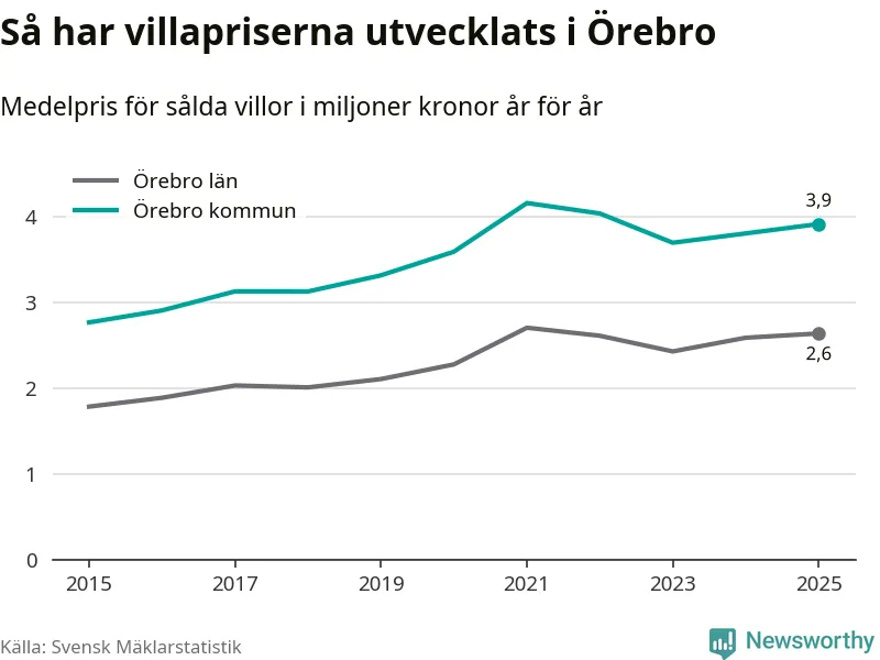 Priserna på villor i Örebro län som helhet har ökat med två procent sedan förra året. Dock har de inte nått samma nivåer som toppåret i länet 2021.
