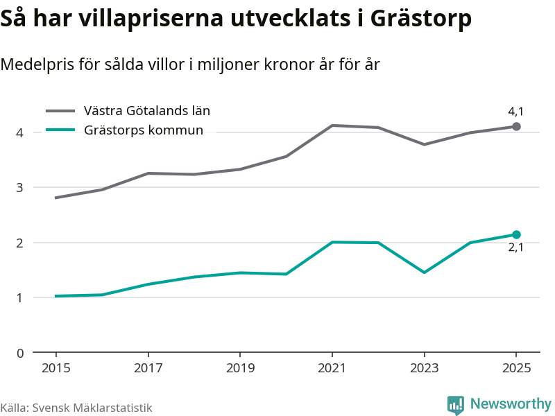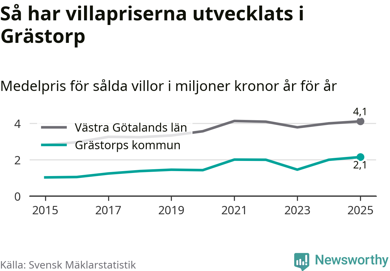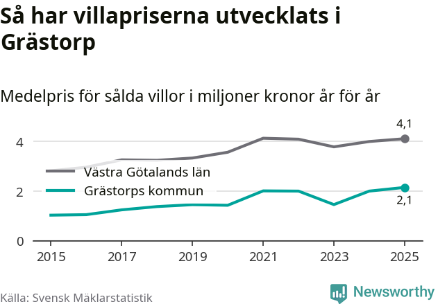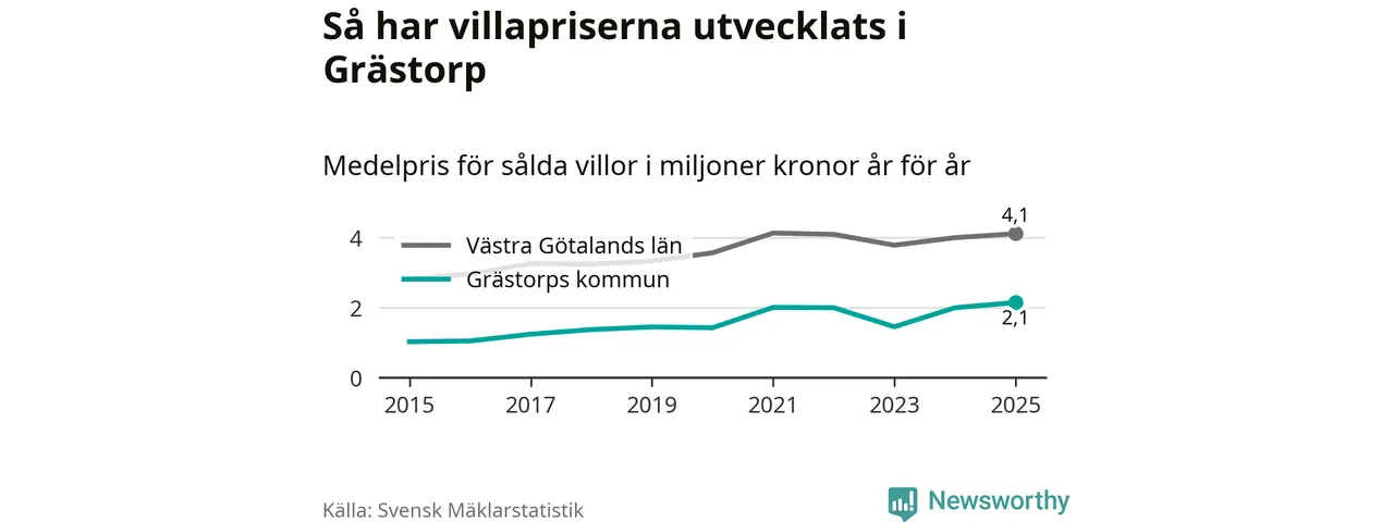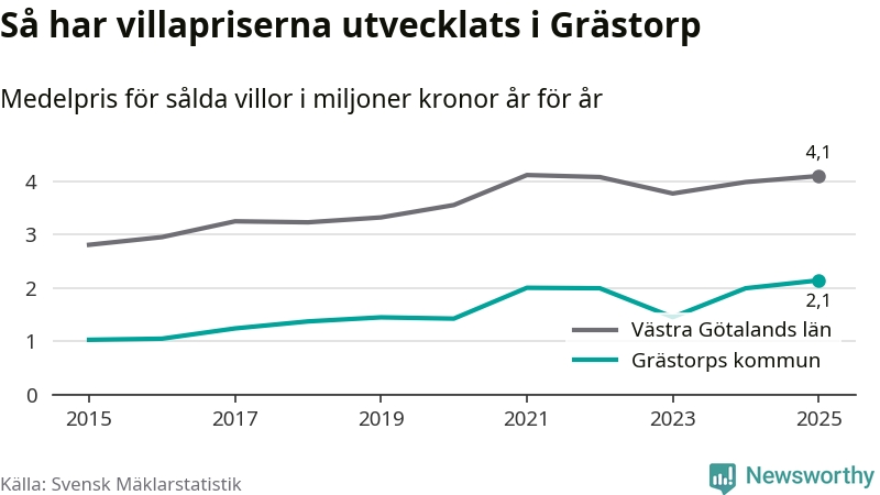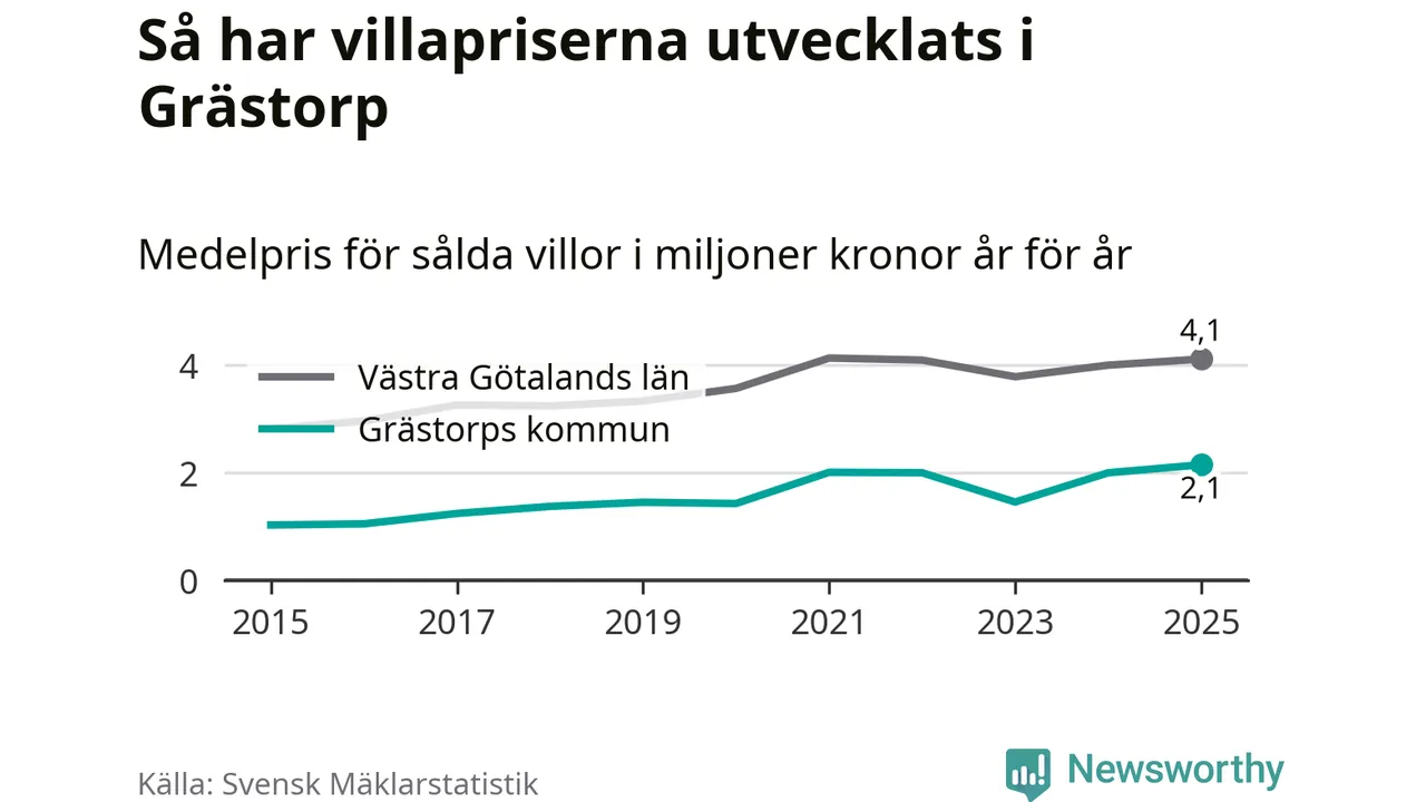 2,1 miljoner kronor är medelpriset för de villor som såldes i Grästorps kommun under året, eller 15 552 kronor per kvadratmeter. Det innebär en prisökning med sju procent på ett år. Det är det högsta årssnittet på åtminstone tio år. Bryter man upp siffrorna per kvartal har dock ännu högre villapriser noterats i Grästorp våren 2021.