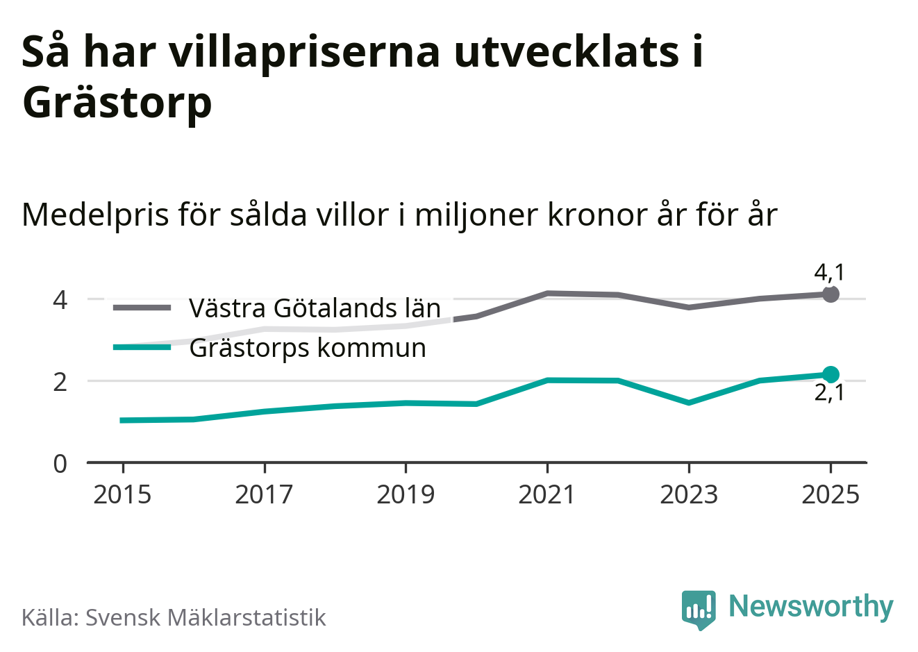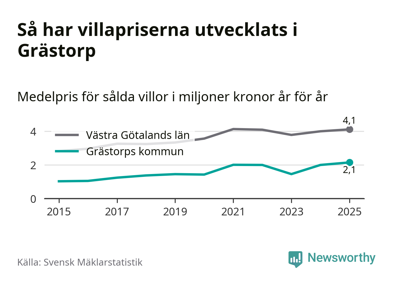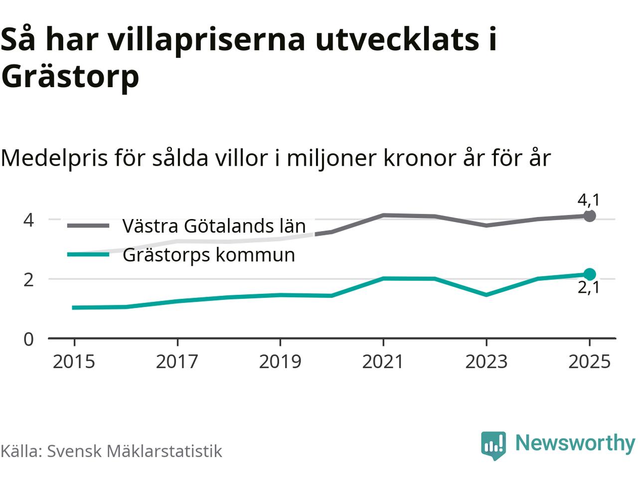 2,1 miljoner kronor är medelpriset för de villor som såldes i Grästorps kommun under året, eller 15 552 kronor per kvadratmeter. Det innebär en prisökning med sju procent på ett år. Det är det högsta årssnittet på åtminstone tio år. Bryter man upp siffrorna per kvartal har dock ännu högre villapriser noterats i Grästorp våren 2021.