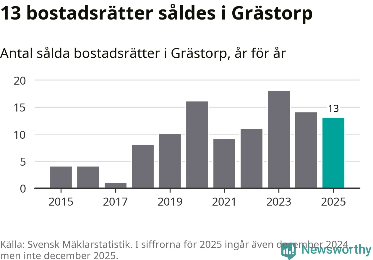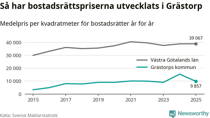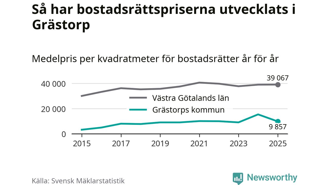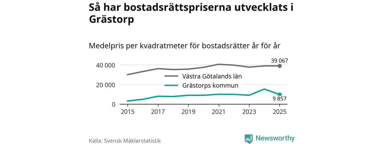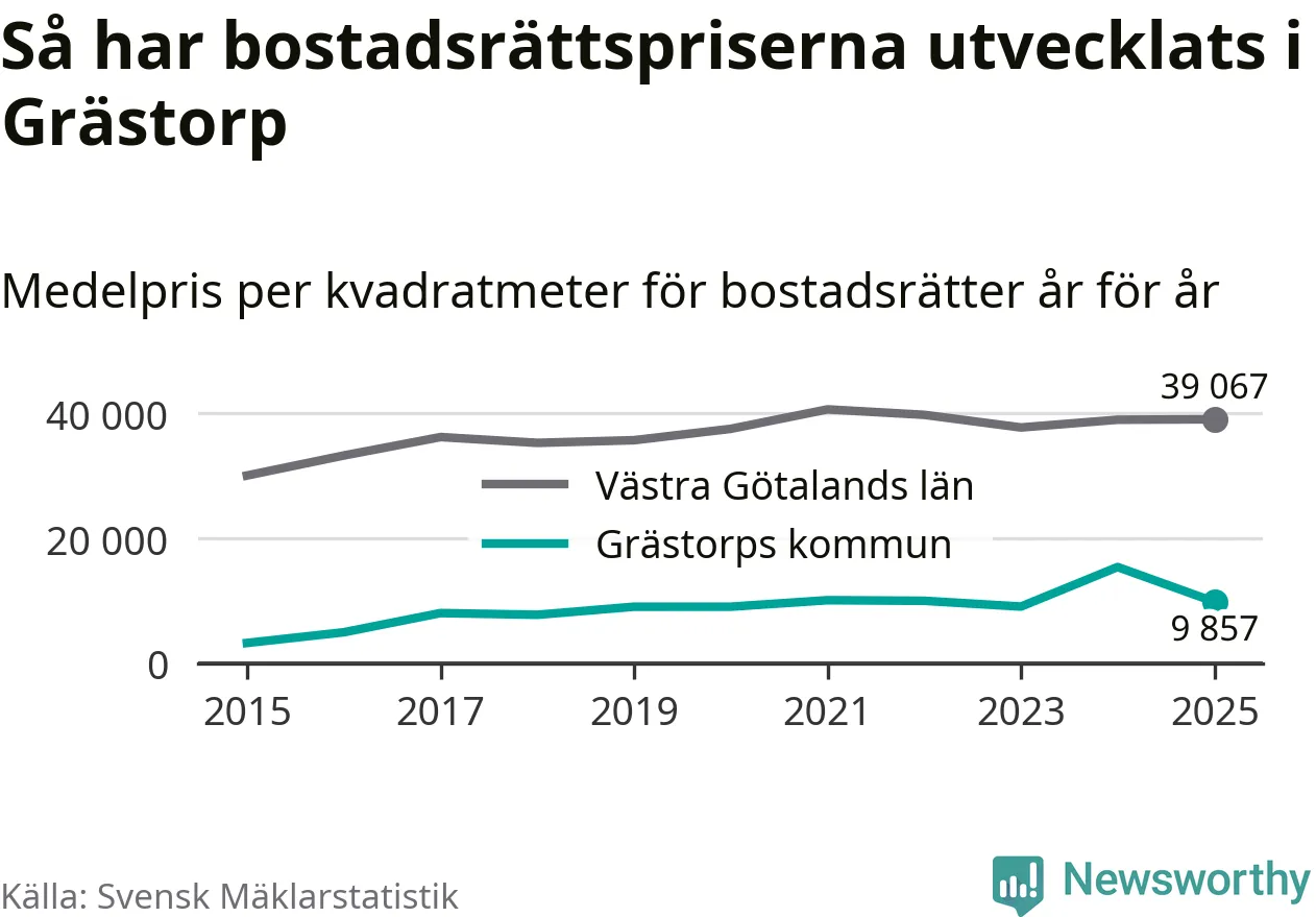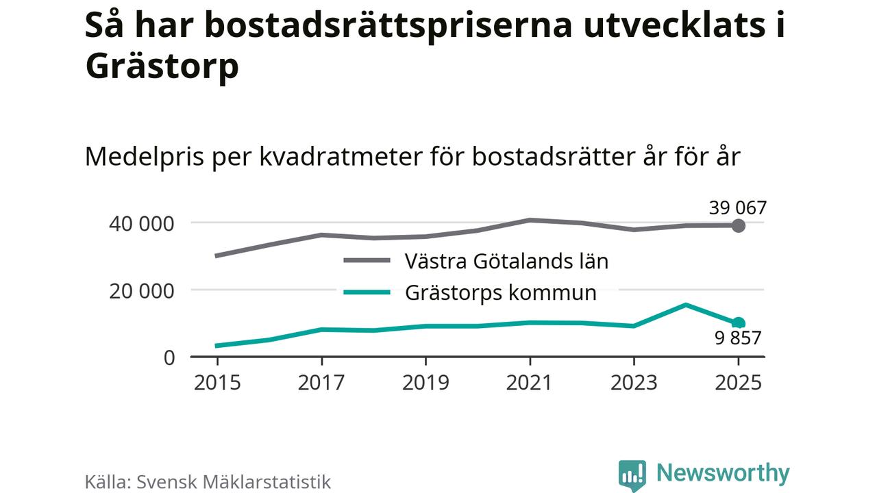 När det gäller bostadsrätter i Grästorps kommun såldes 13 under året. Snittet per kvadratmeter landade på omkring 9 900 kronor. Det är en minskning jämfört med förra året.