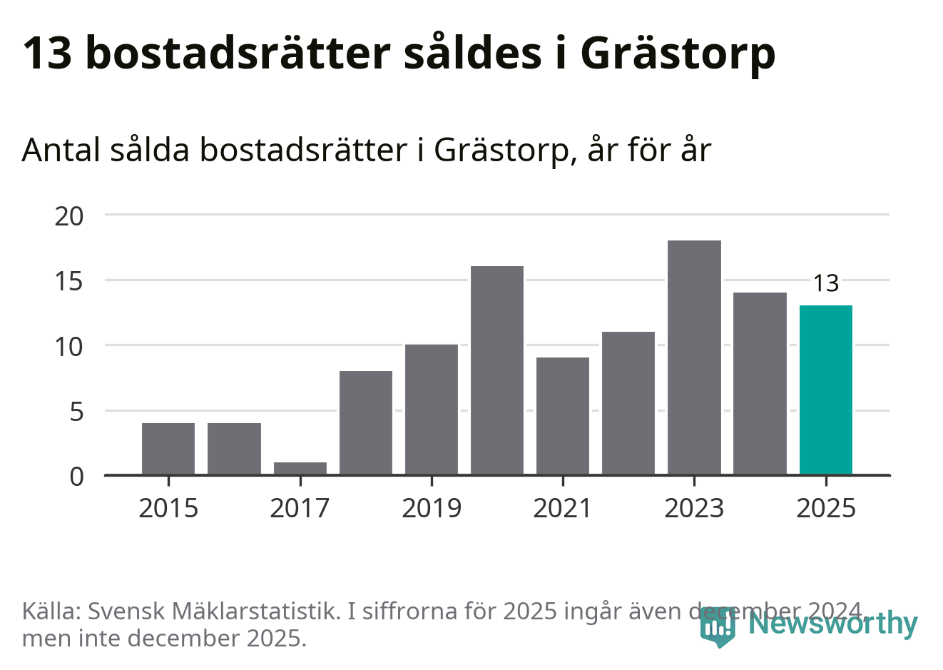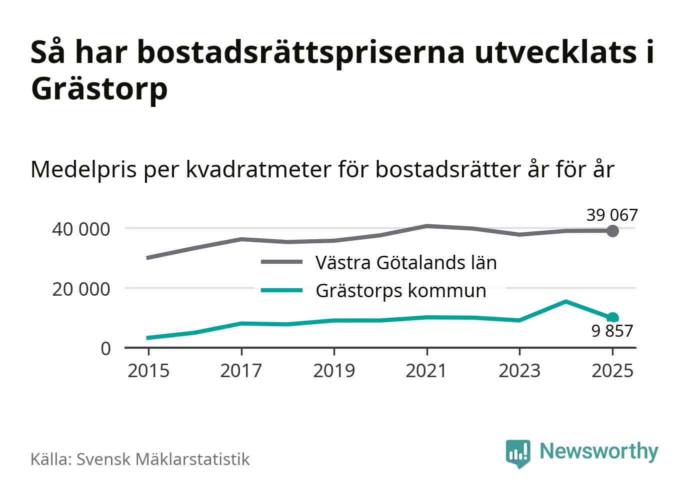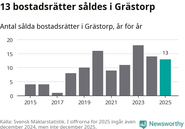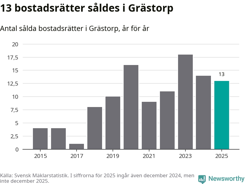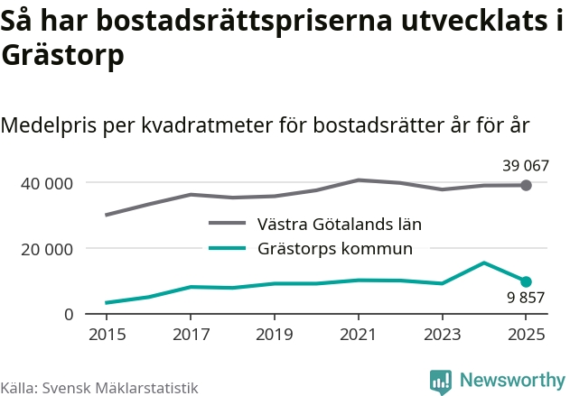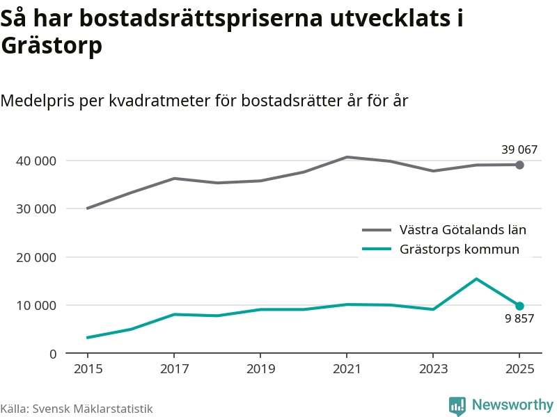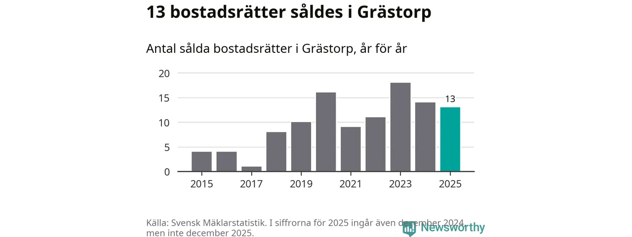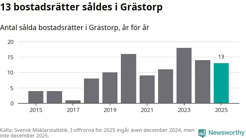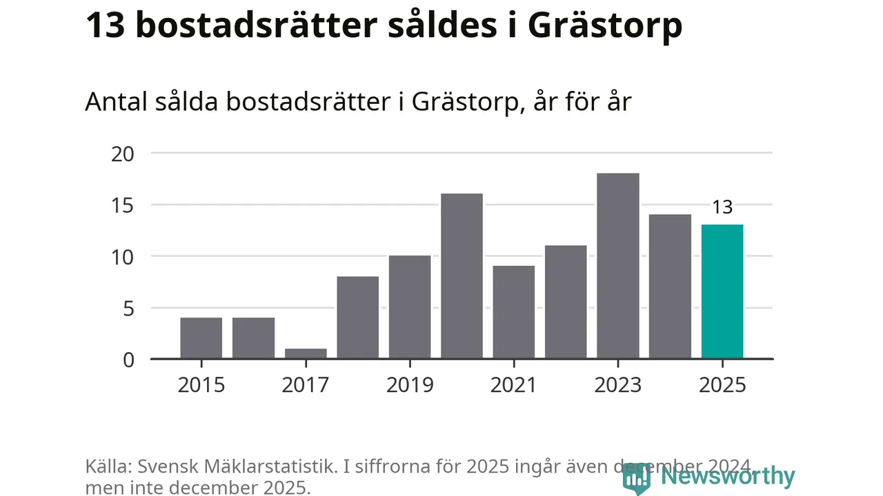 När det gäller bostadsrätter i Grästorps kommun såldes 13 under året. Snittet per kvadratmeter landade på omkring 9 900 kronor. Det är en minskning jämfört med förra året.