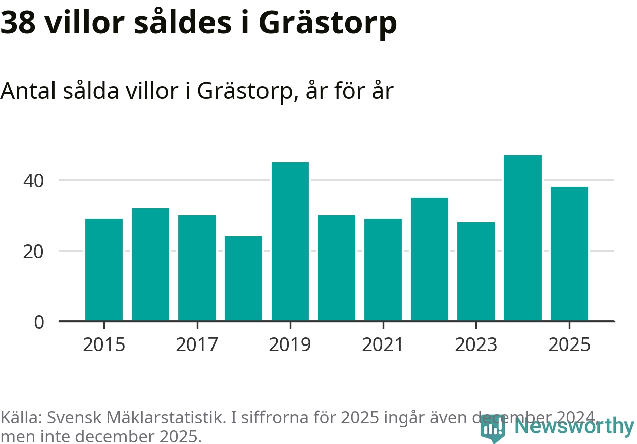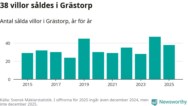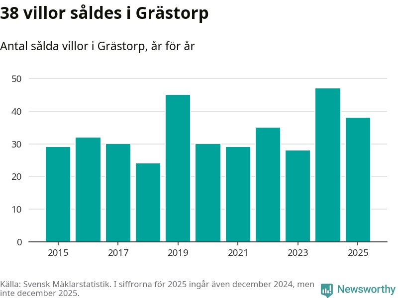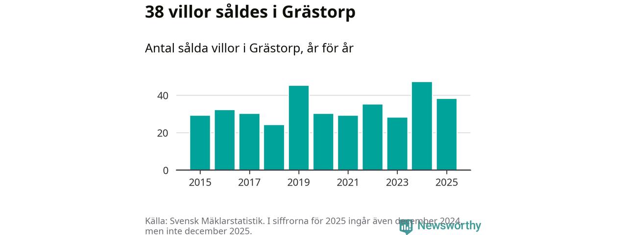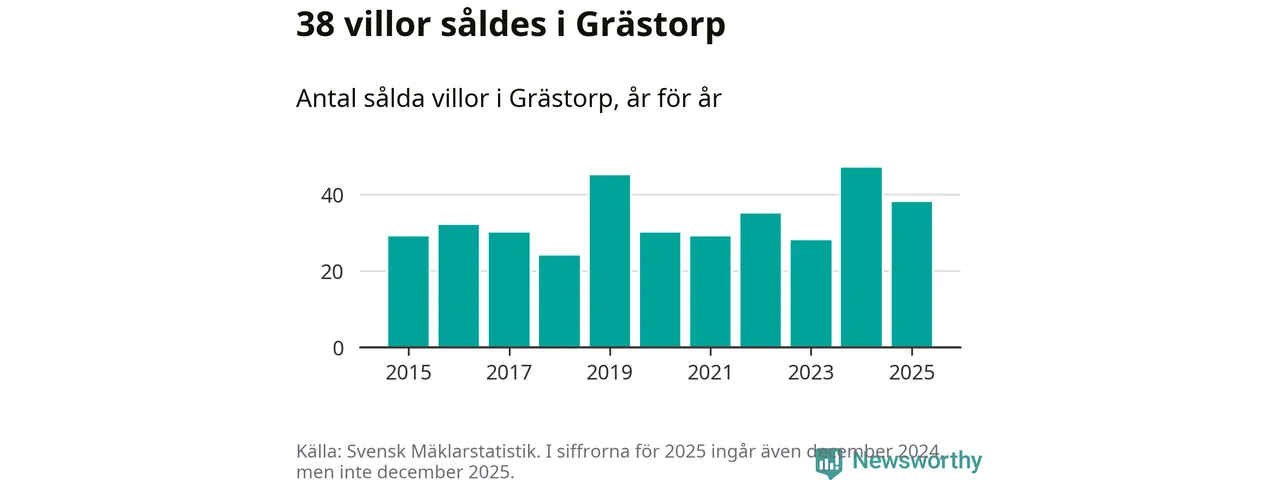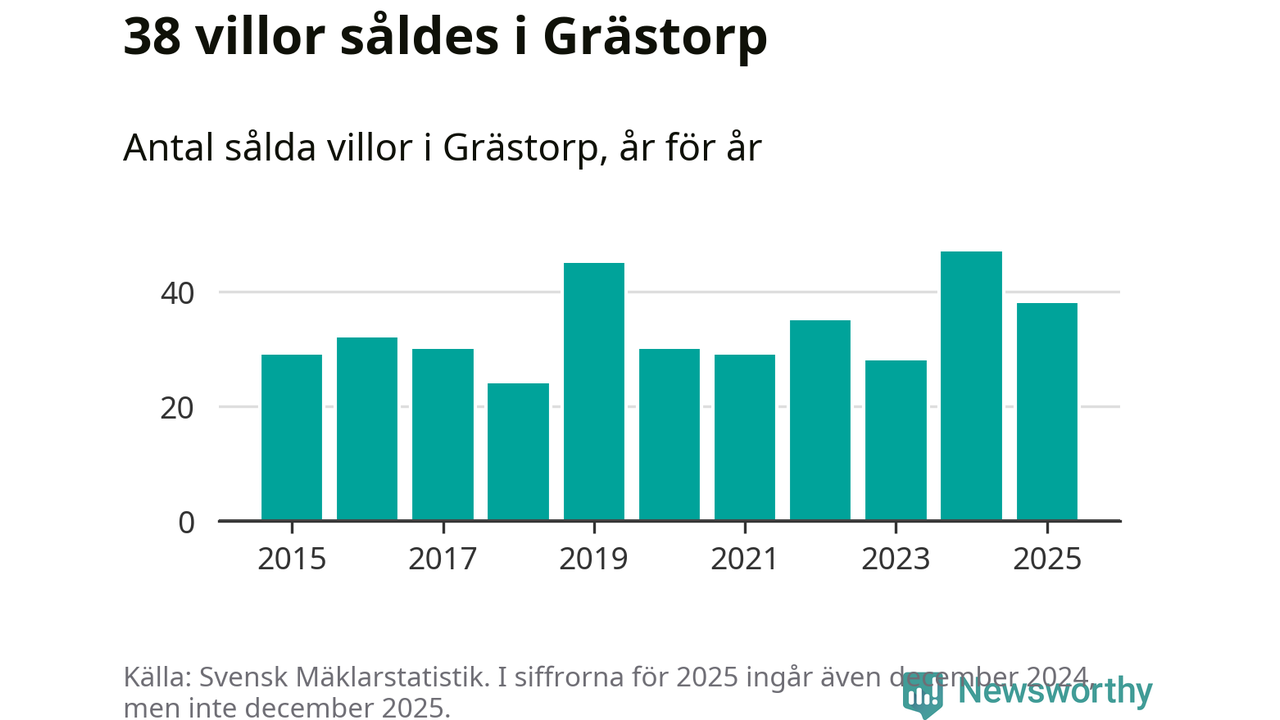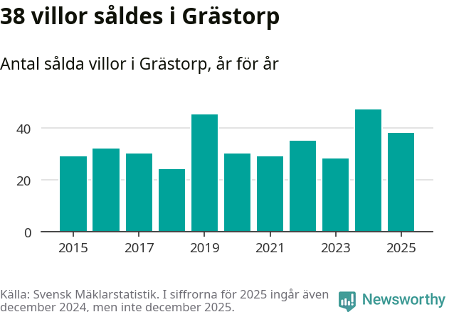 Däremot minskade antalet sålda villor. Totalt såldes 38 villor, att jämföra med 47 under 2024.