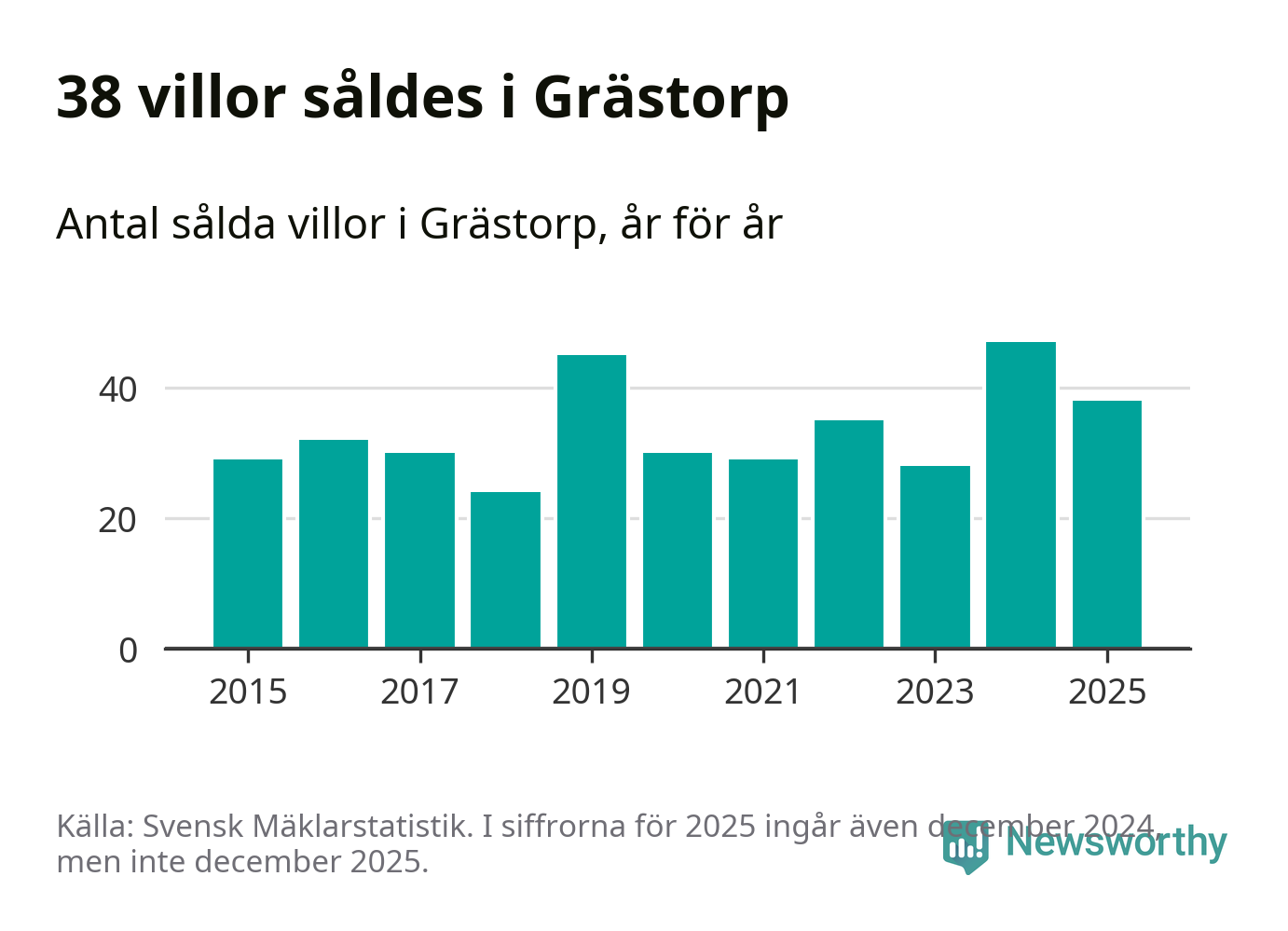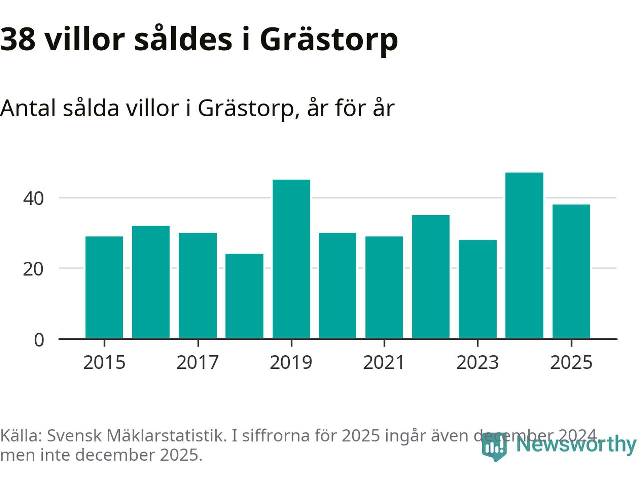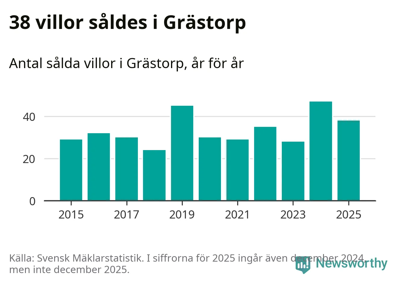 Däremot minskade antalet sålda villor. Totalt såldes 38 villor, att jämföra med 47 under 2024.