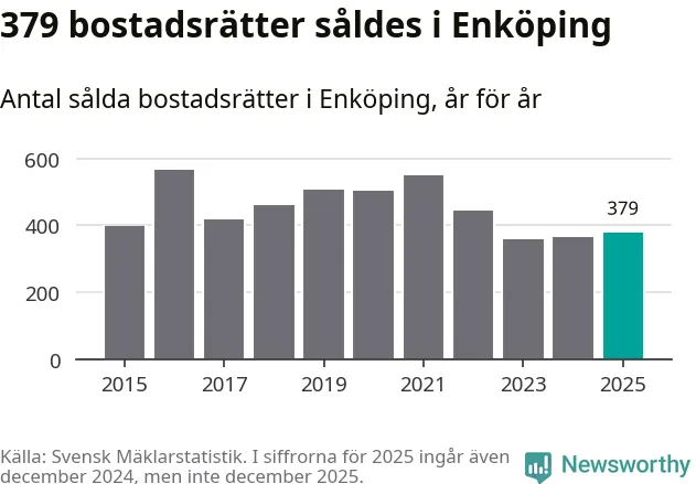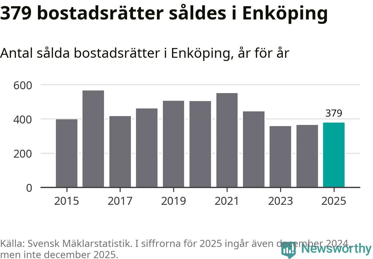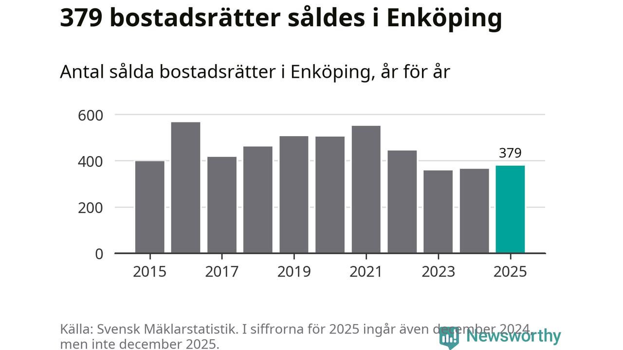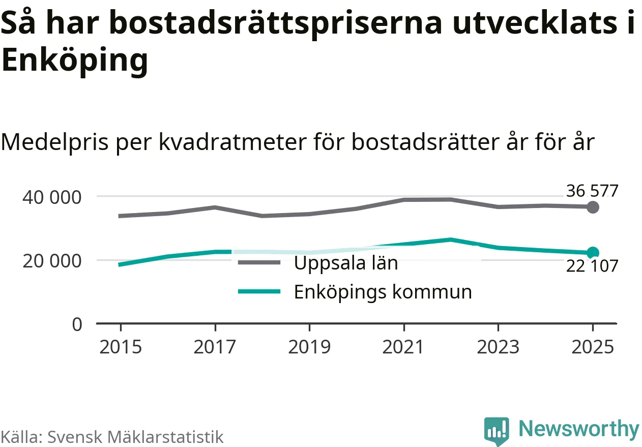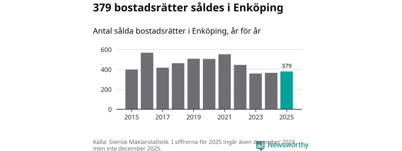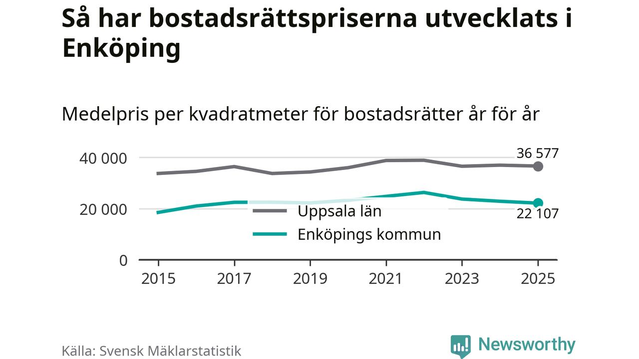 Det såldes totalt 379 bostadsrätter i Enköpings kommun under året. Genomsnittspriset per kvadratmeter landade på 22 107 kronor. Det är en minskning med tre procent i kommunen på ett år.