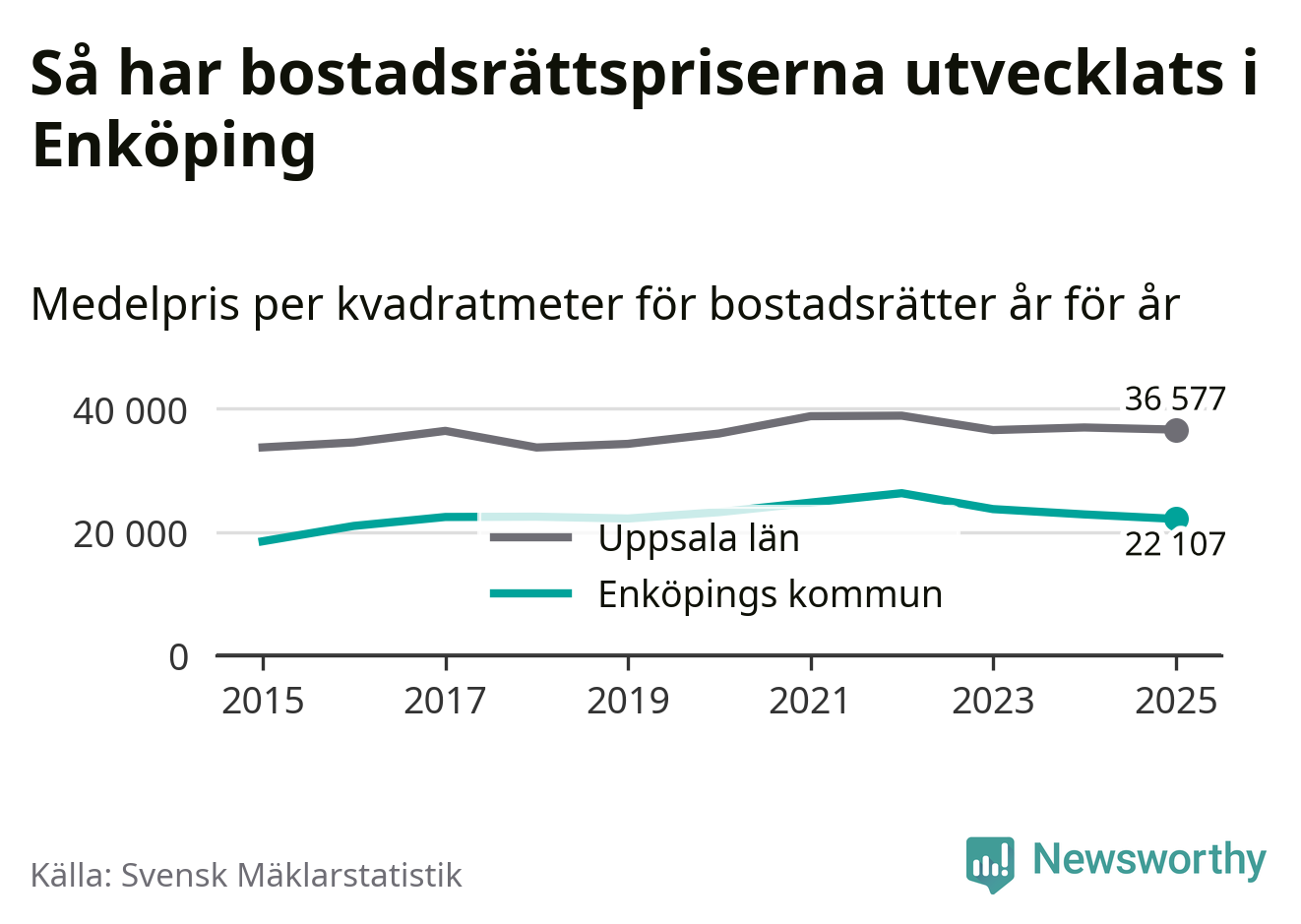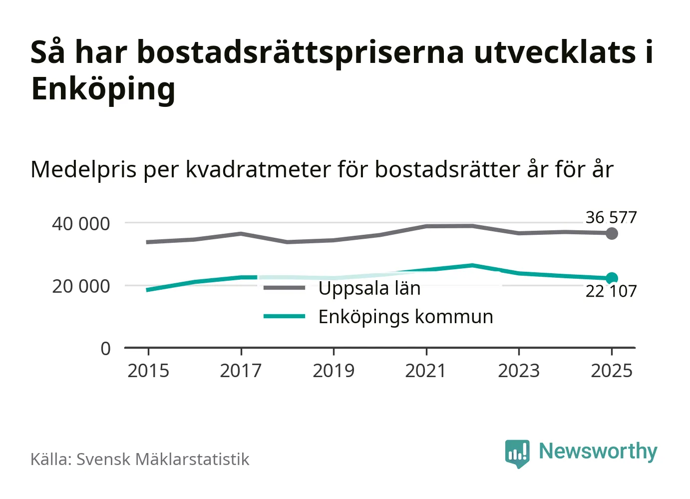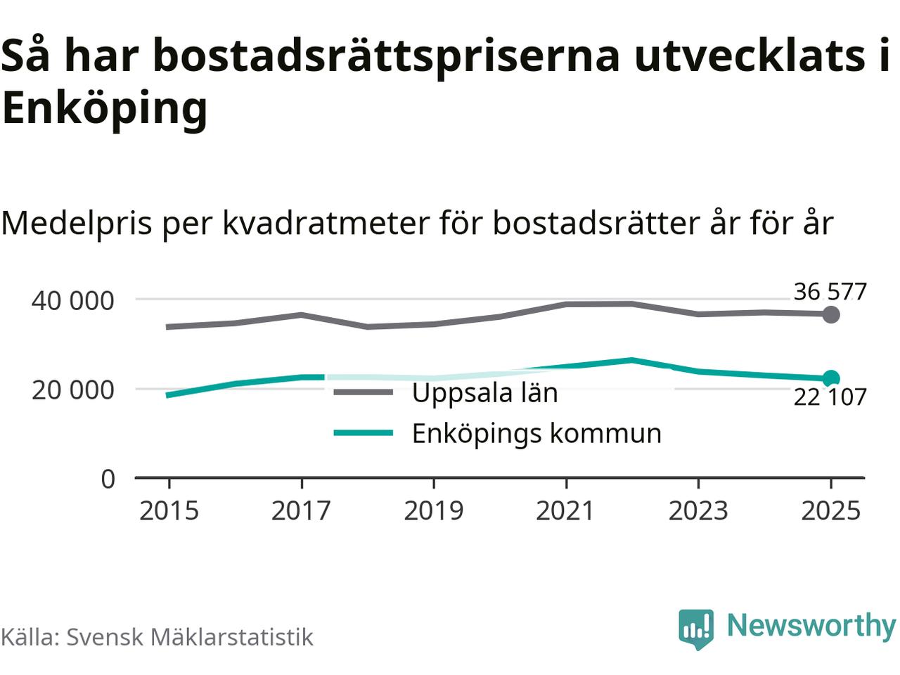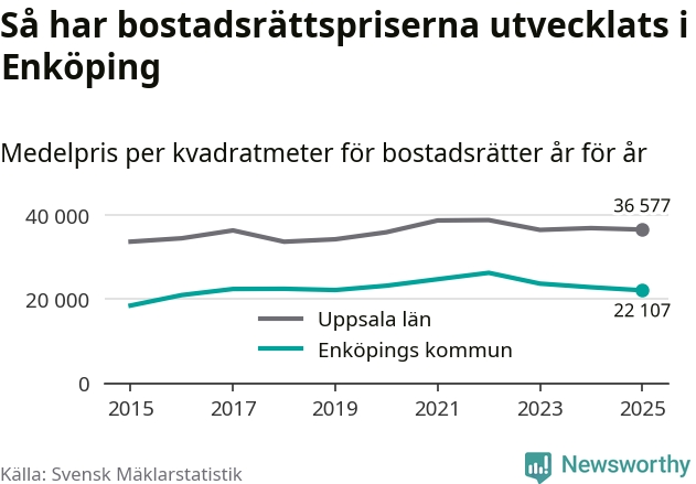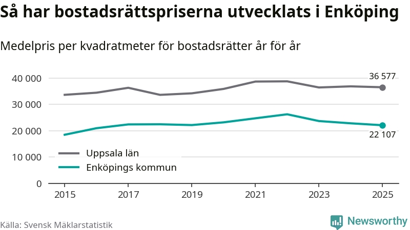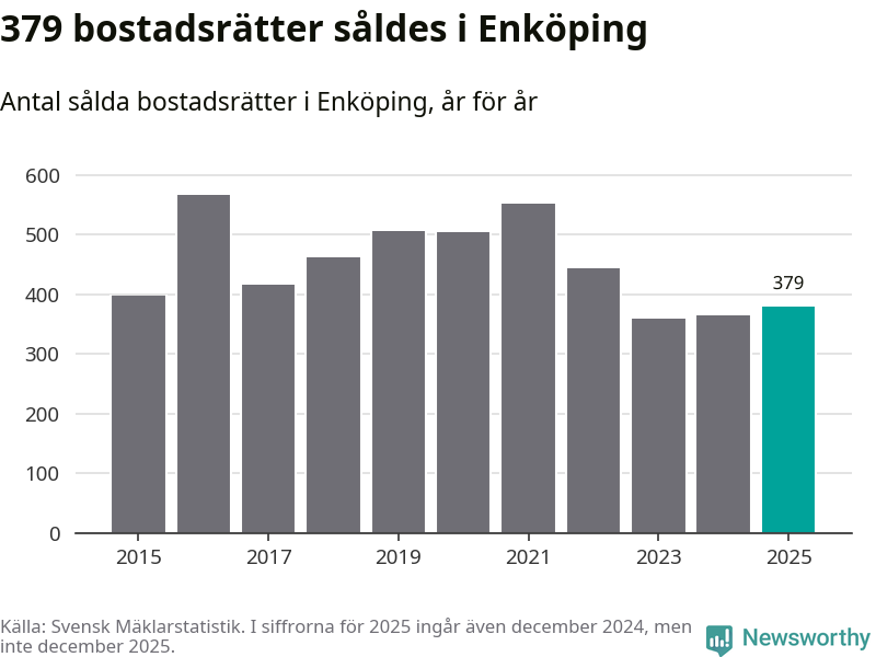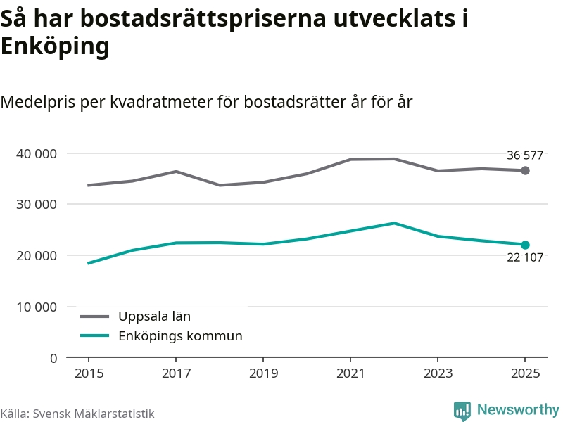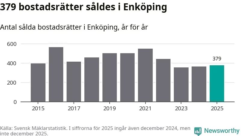 Det såldes totalt 379 bostadsrätter i Enköpings kommun under året. Genomsnittspriset per kvadratmeter landade på 22 107 kronor. Det är en minskning med tre procent i kommunen på ett år.
