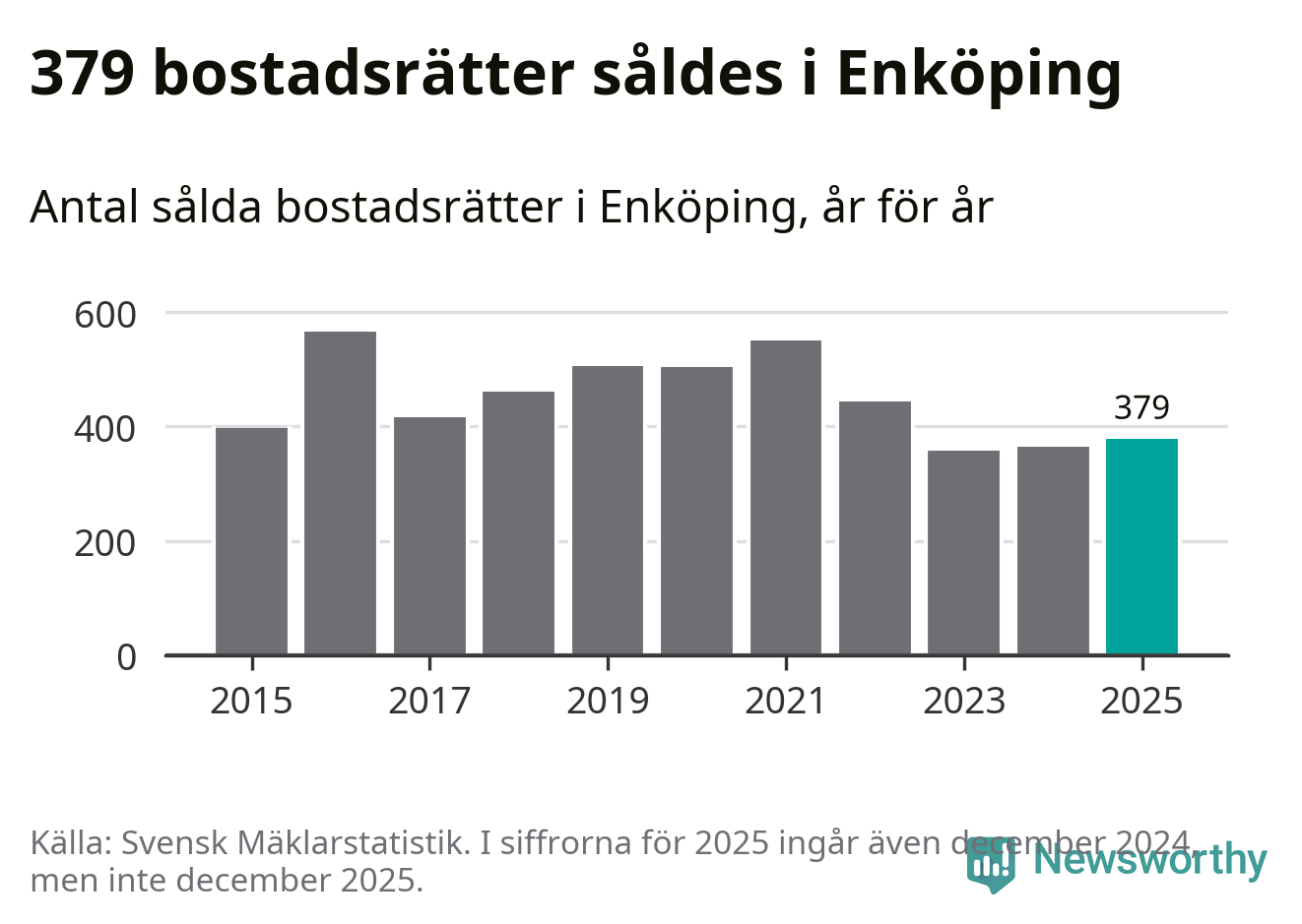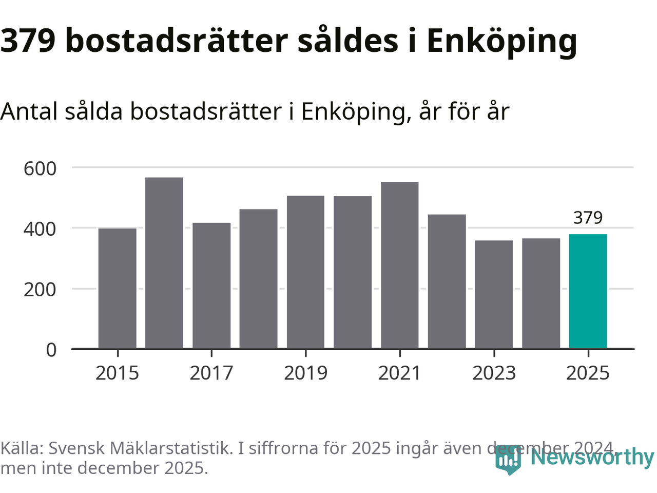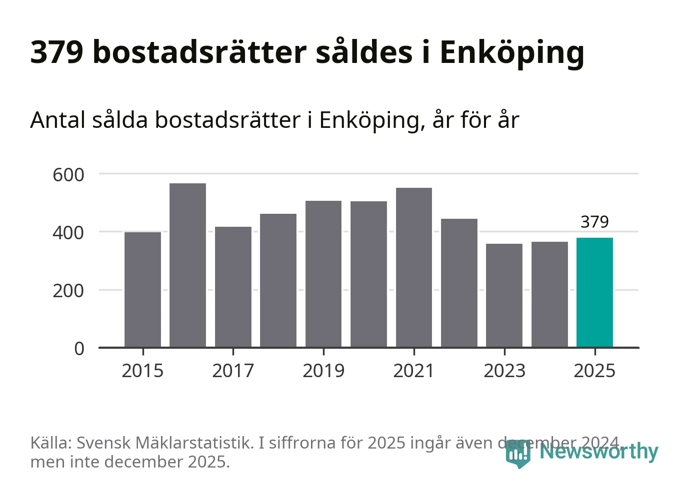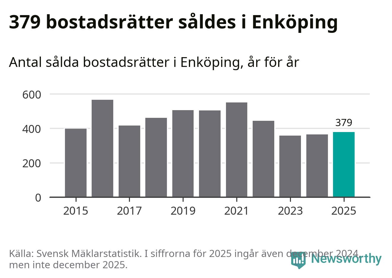 Det såldes totalt 379 bostadsrätter i Enköpings kommun under året. Genomsnittspriset per kvadratmeter landade på 22 107 kronor. Det är en minskning med tre procent i kommunen på ett år.