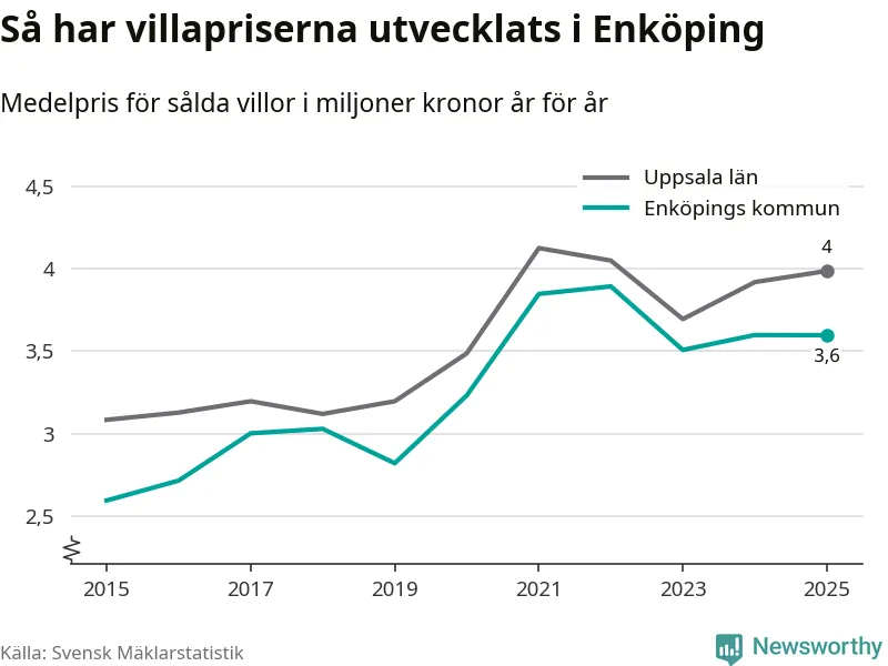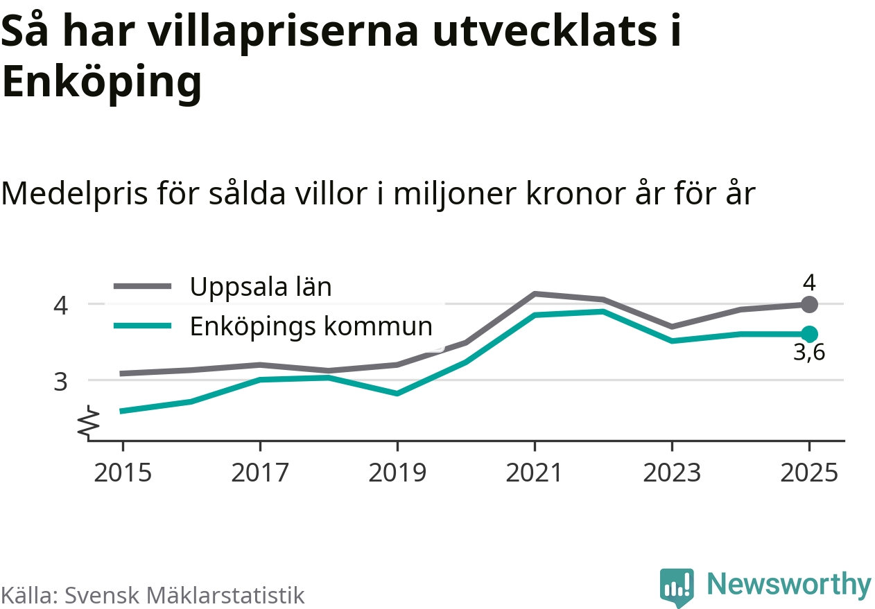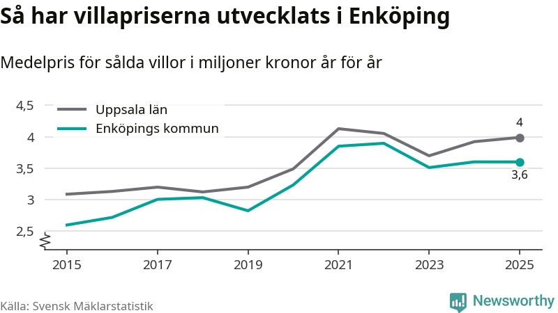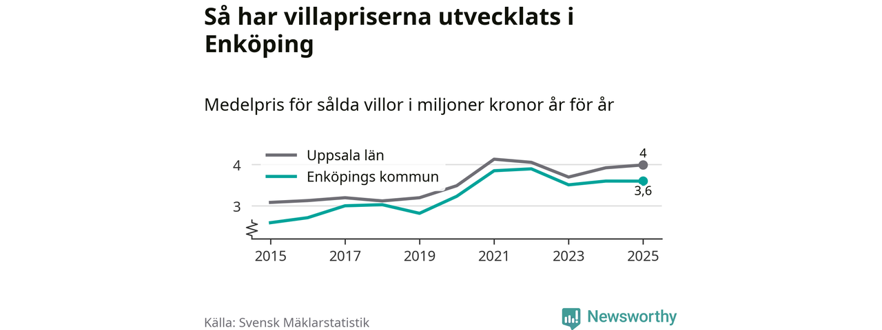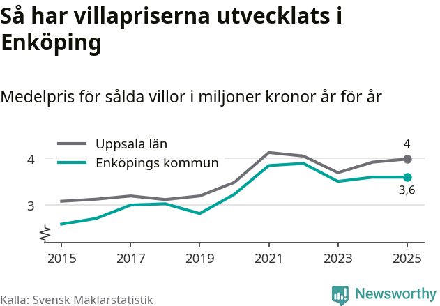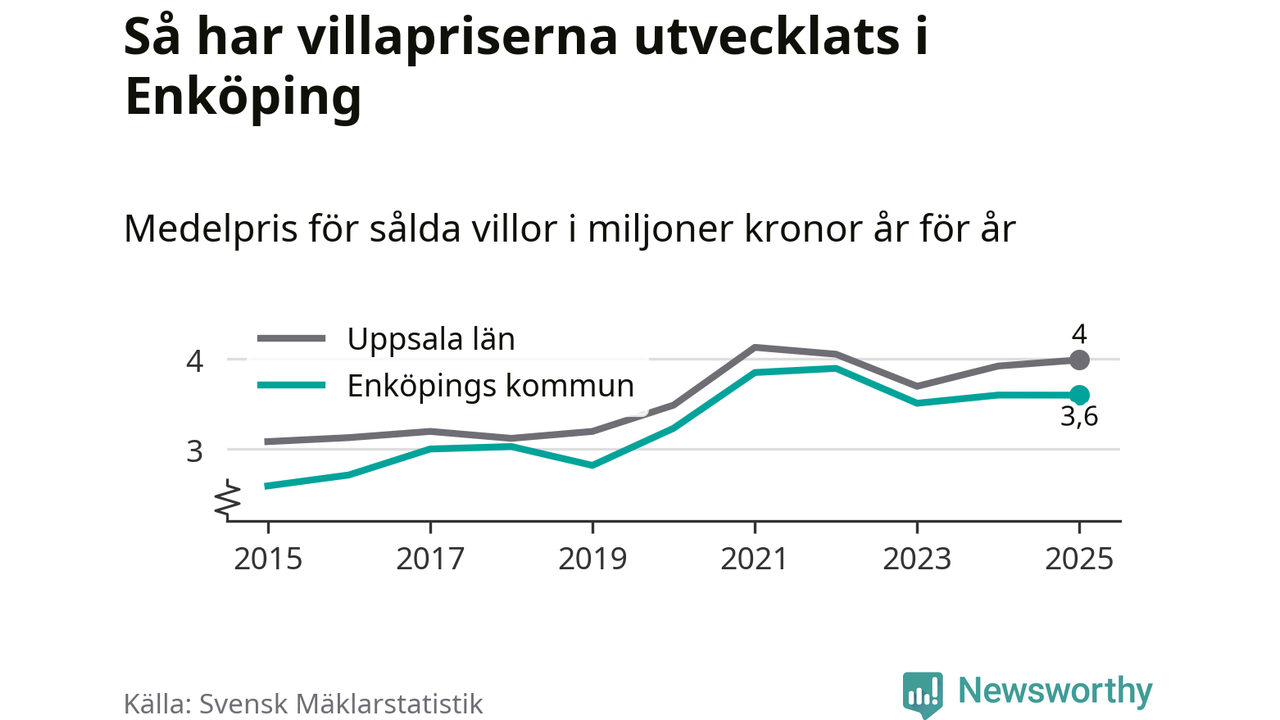 3,6 miljoner kronor är medelpriset för de villor som såldes i Enköpings kommun under året, eller 30 233 kronor per kvadratmeter. Det innebär att priserna har legat i stort sett stilla sedan förra året.