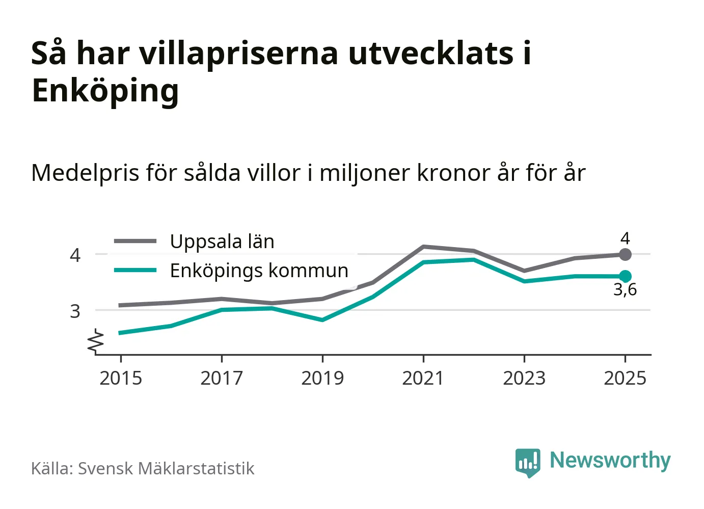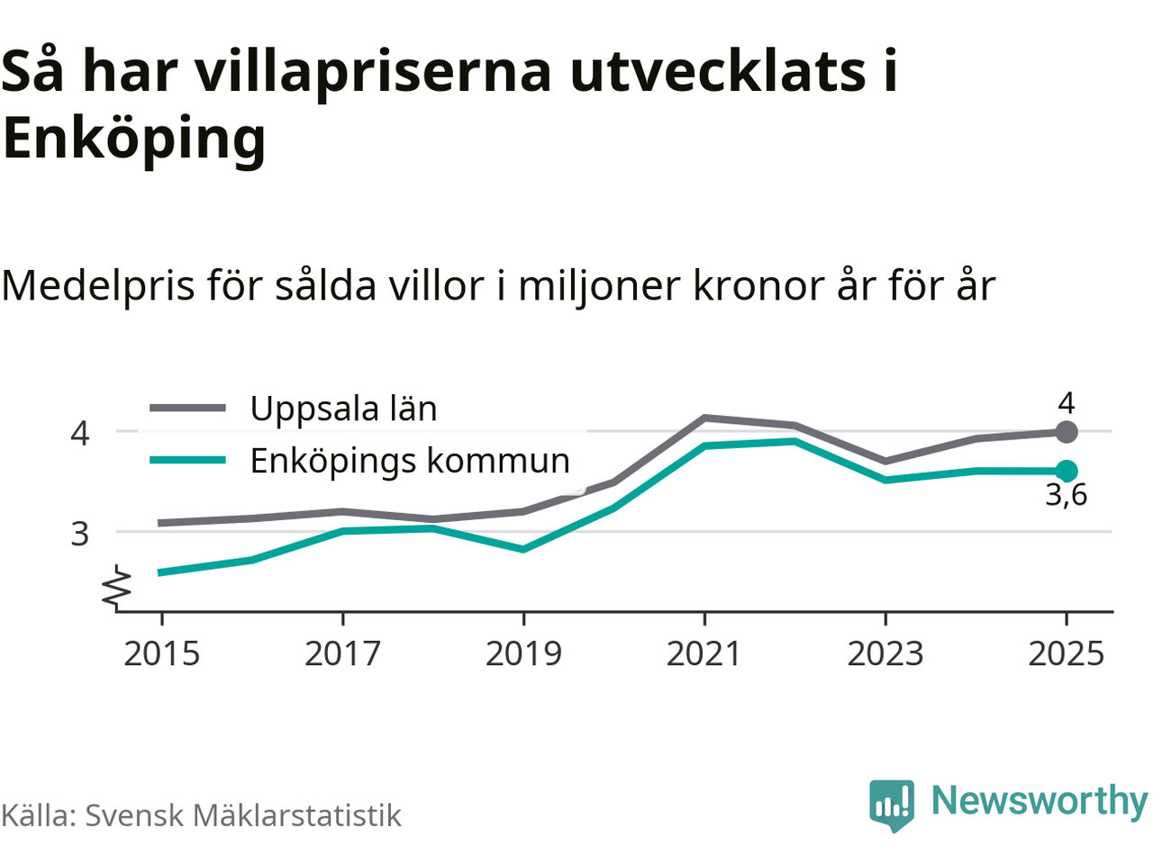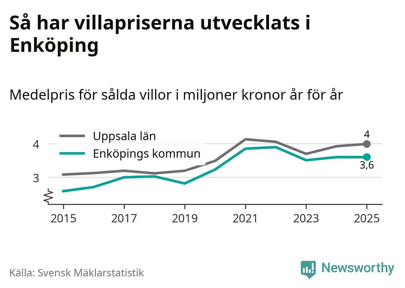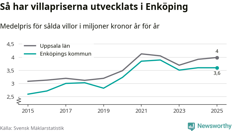 3,6 miljoner kronor är medelpriset för de villor som såldes i Enköpings kommun under året, eller 30 233 kronor per kvadratmeter. Det innebär att priserna har legat i stort sett stilla sedan förra året.