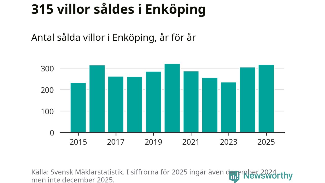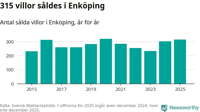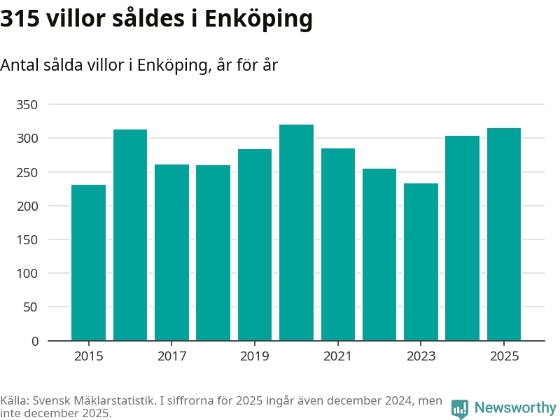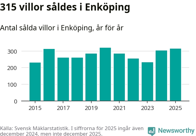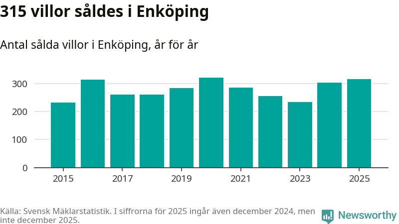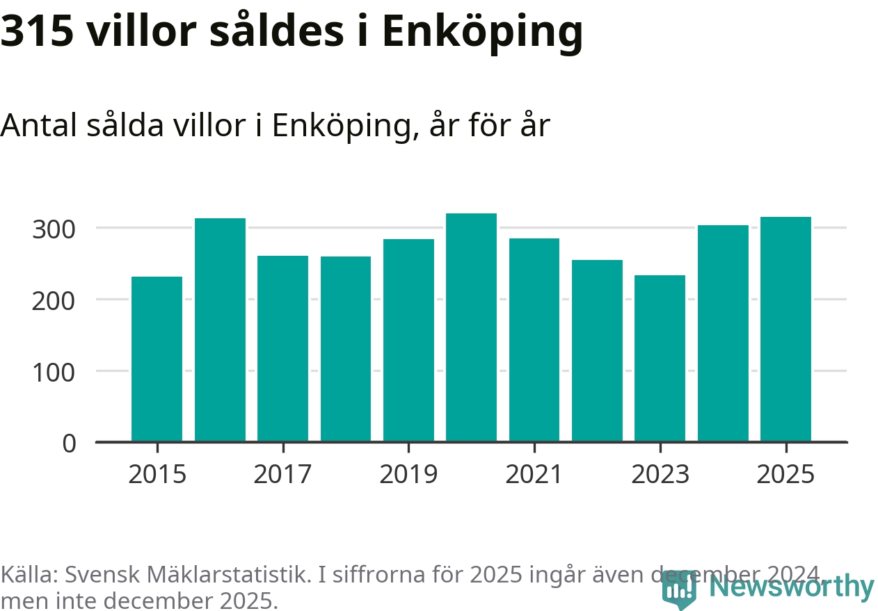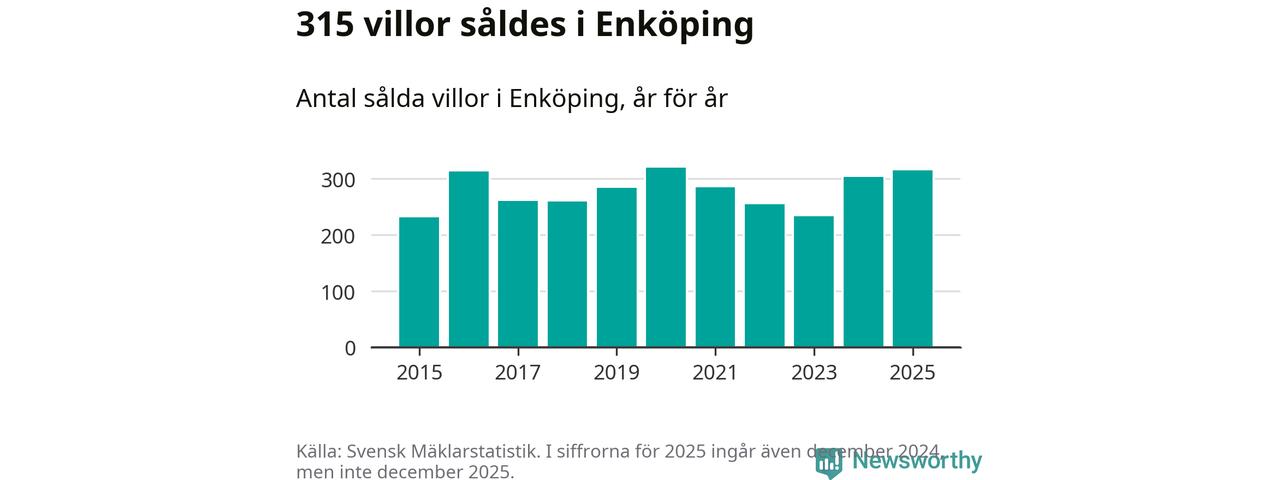 Däremot ökade antalet sålda villor. Totalt såldes 315 villor, att jämföra med 303 under 2024. Det är andra året i rad som antalet sålda villor ökar i kommunen.