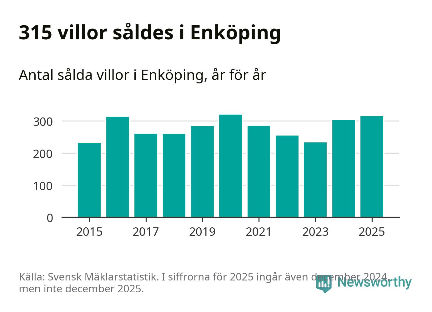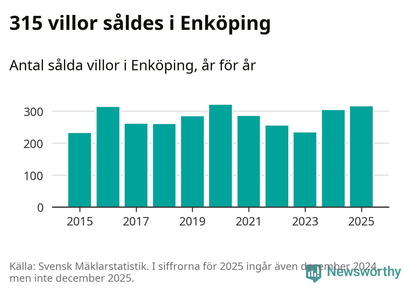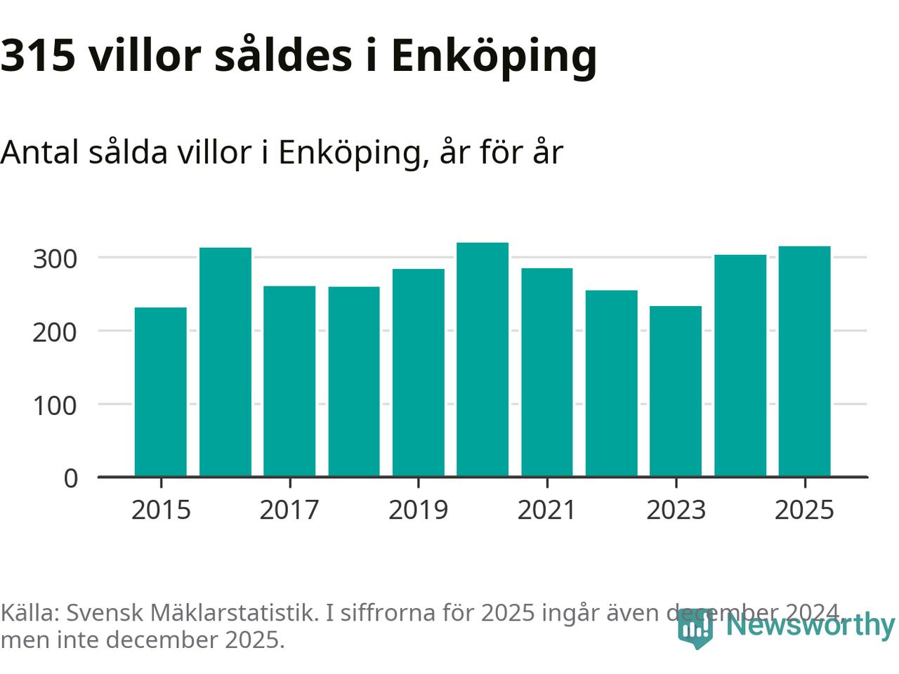 Däremot ökade antalet sålda villor. Totalt såldes 315 villor, att jämföra med 303 under 2024. Det är andra året i rad som antalet sålda villor ökar i kommunen.