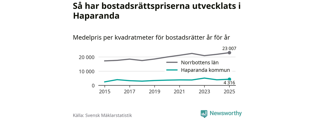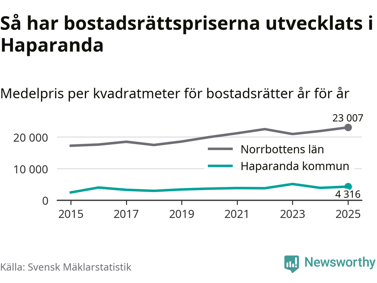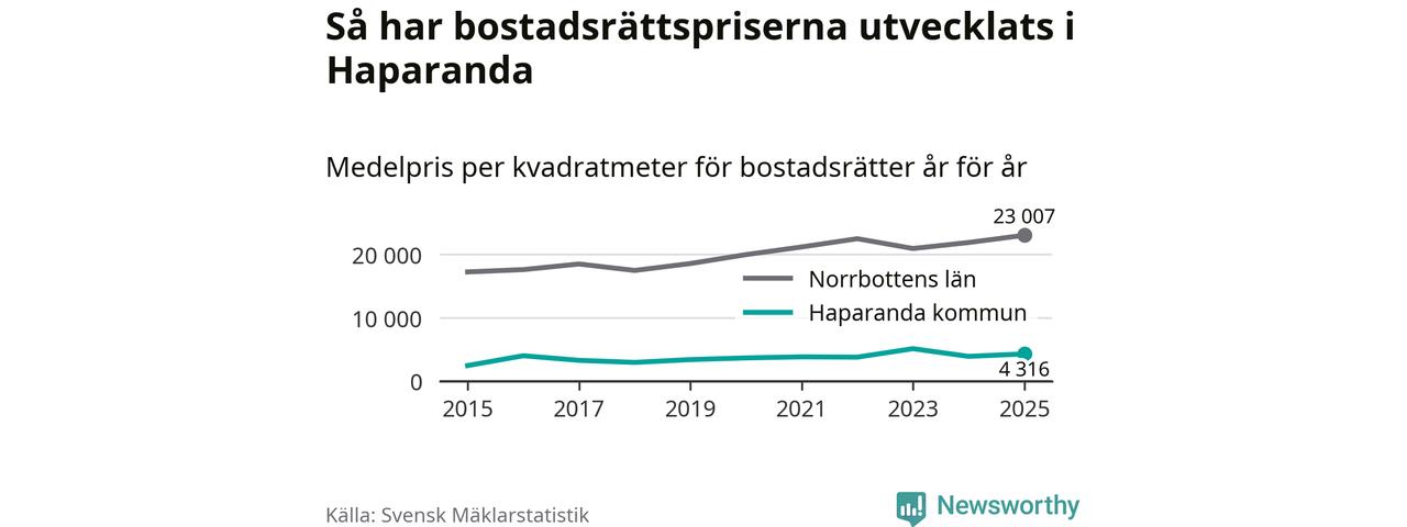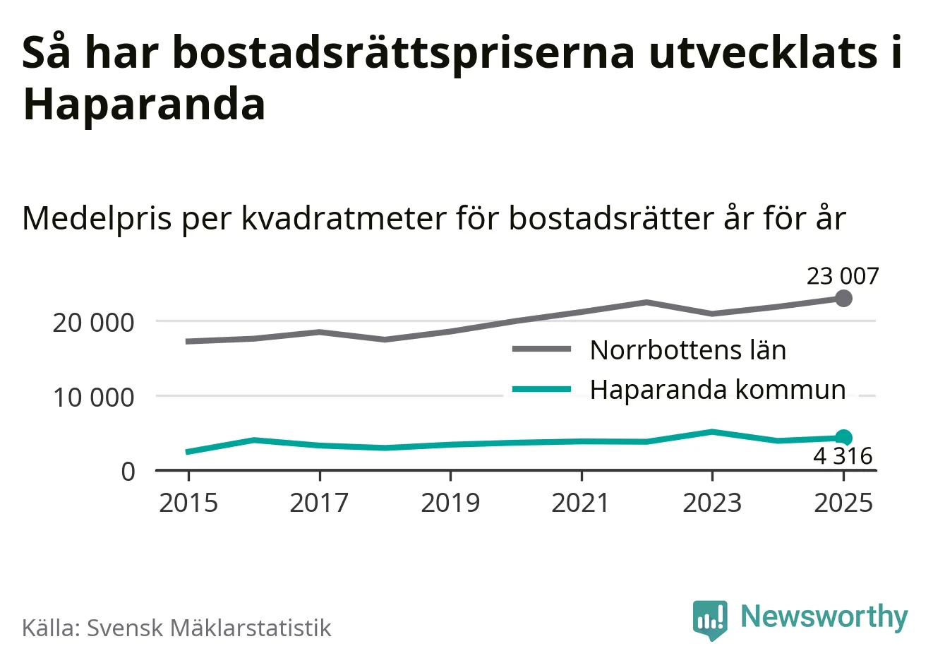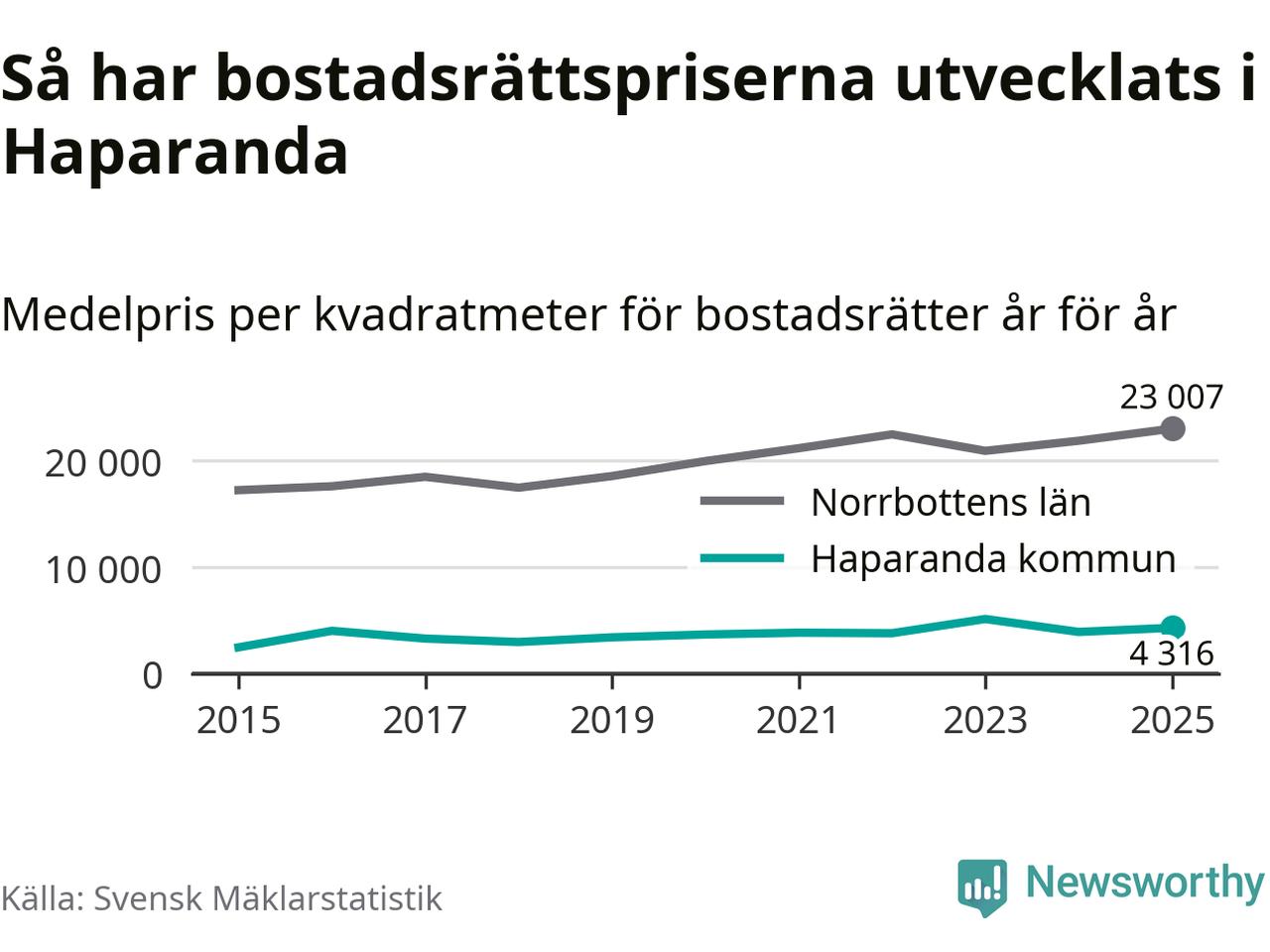 Det såldes totalt 39 bostadsrätter i Haparanda kommun under året. Det är färre än något annat år sedan 2015. Genomsnittspriset per kvadratmeter landade på 4 316 kronor. Det är en ökning med tio procent i kommunen på ett år.