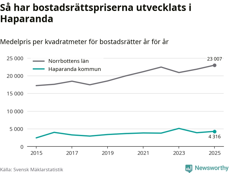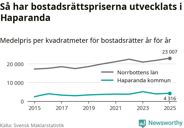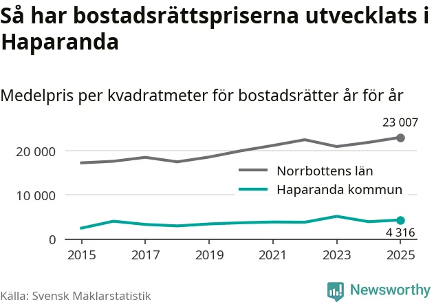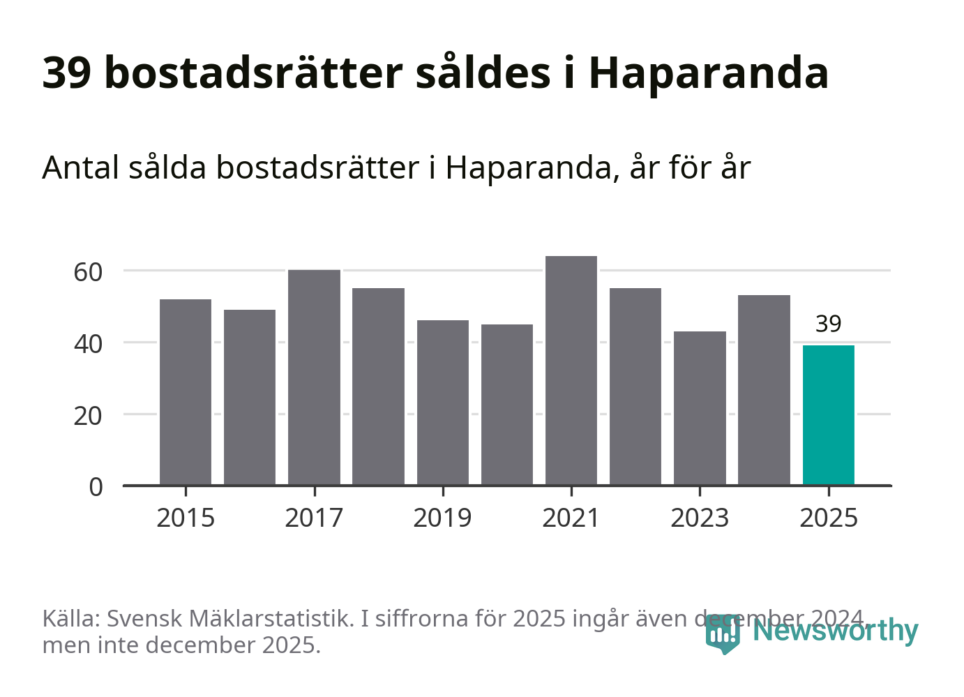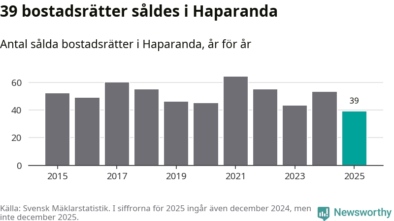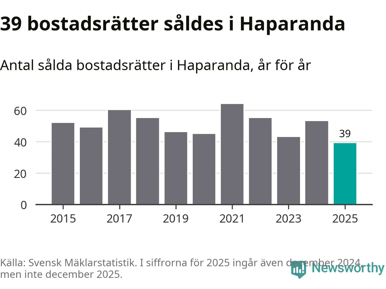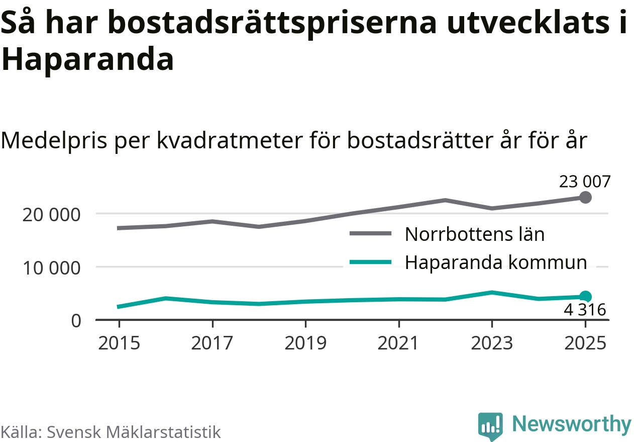Det såldes totalt 39 bostadsrätter i Haparanda kommun under året. Det är färre än något annat år sedan 2015. Genomsnittspriset per kvadratmeter landade på 4 316 kronor. Det är en ökning med tio procent i kommunen på ett år.